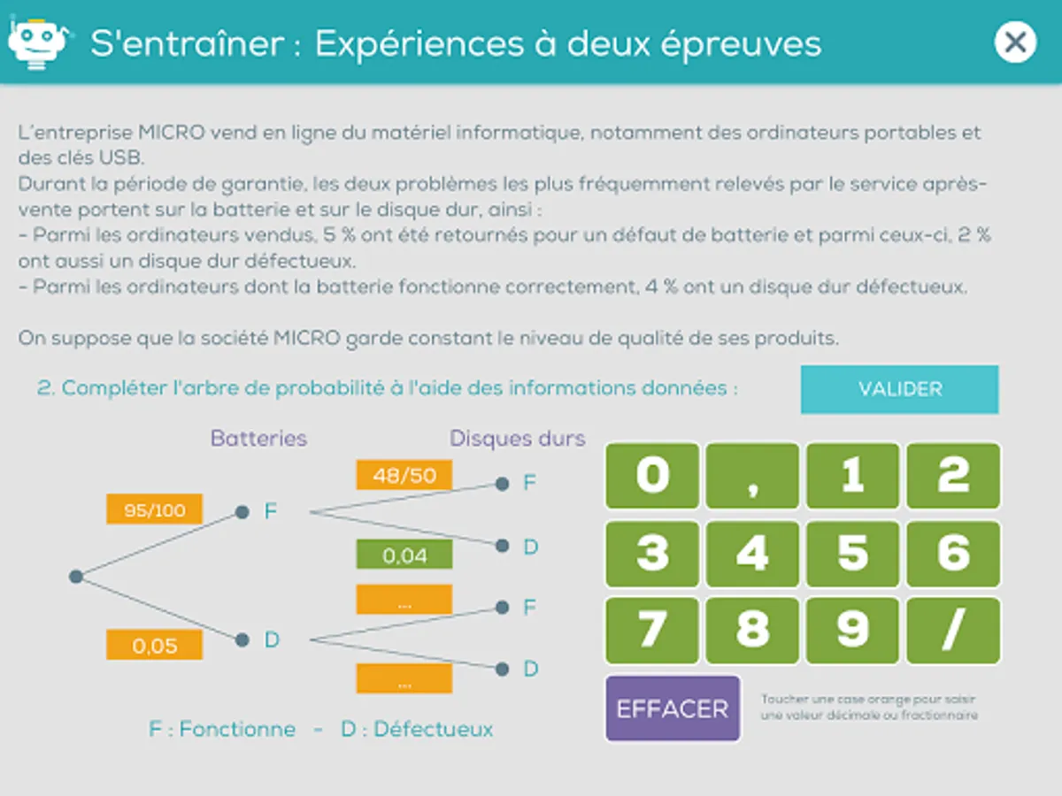 This part includes a bank of six problems involving probabilities. Each time, the problem is stated, it is possible to play a game, then simulate a large number of party. Then load the students to find the exact value of the desired probability ...