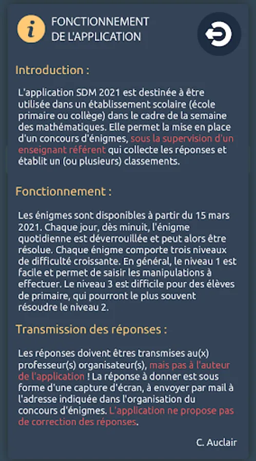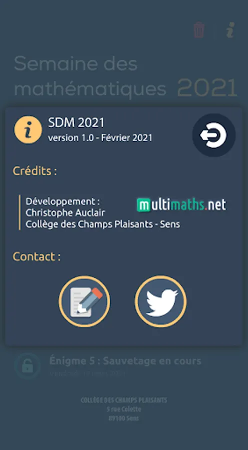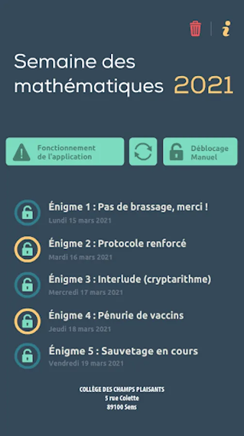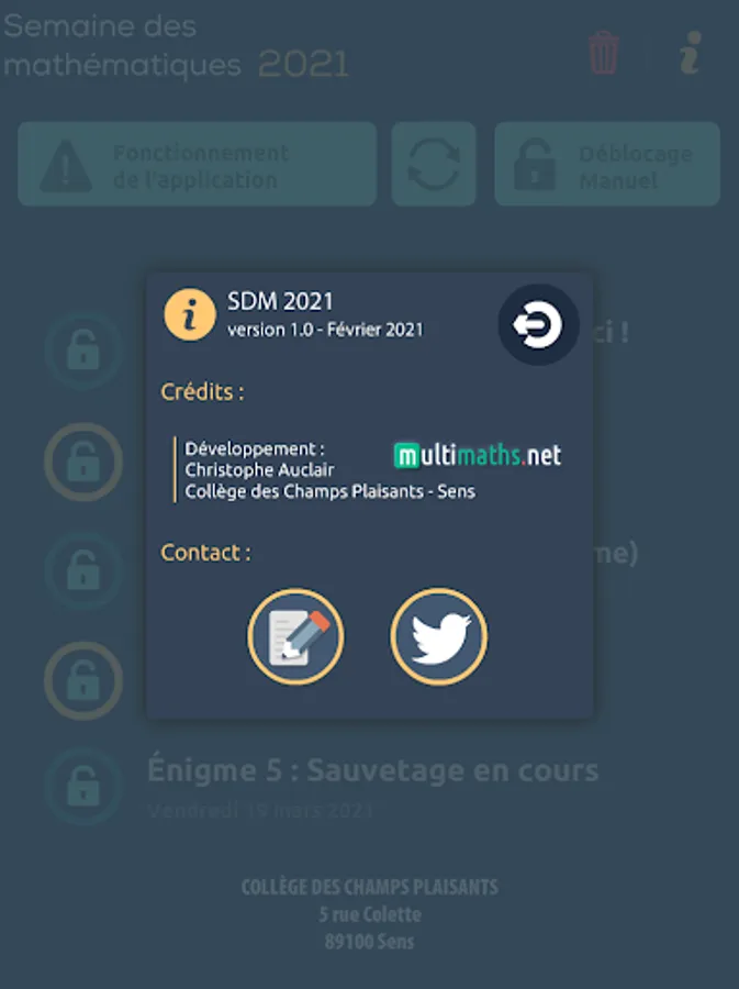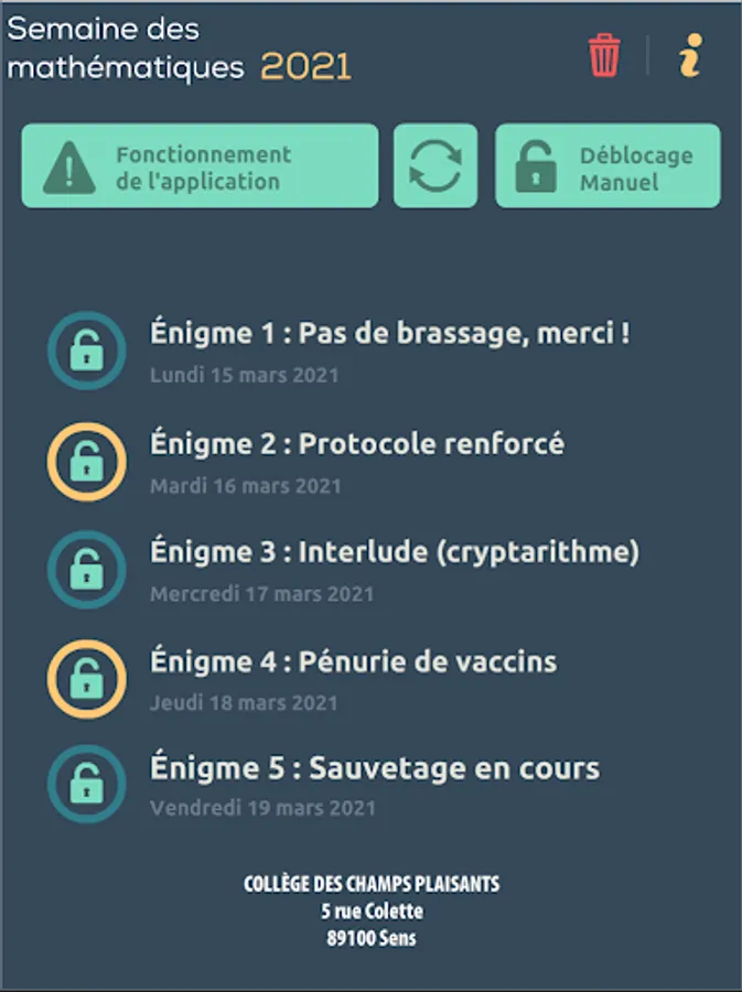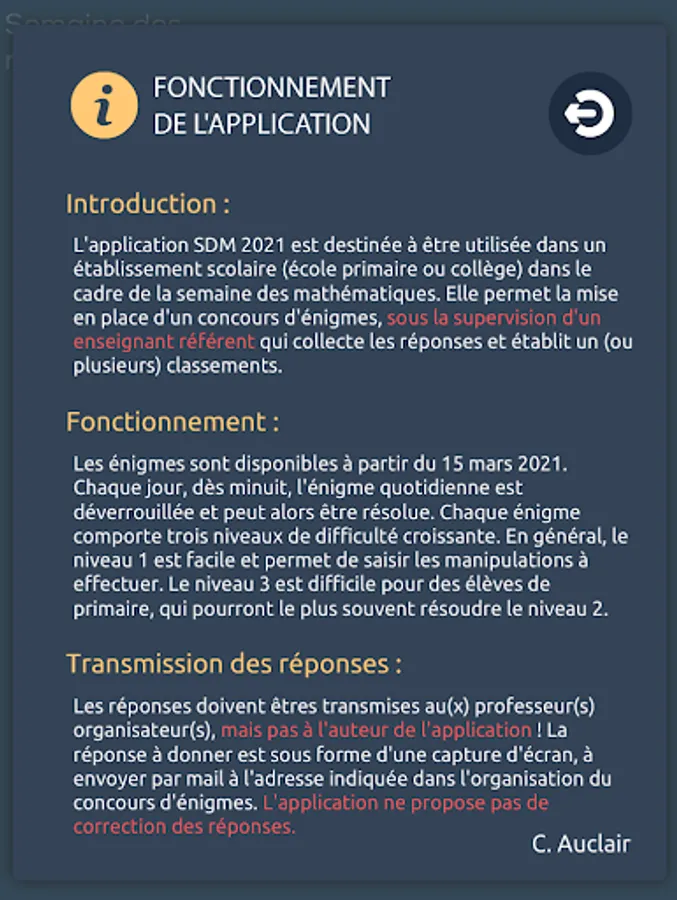 The SDM 2021 application is intended to be used in an educational establishment (elementary school or college) as part of the mathematics week. It allows the setting up of a puzzle competition, under the supervision of a referent teacher who collects the answers and establishes one (or more) rankings.