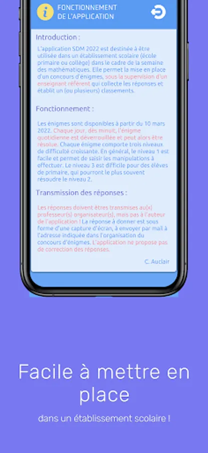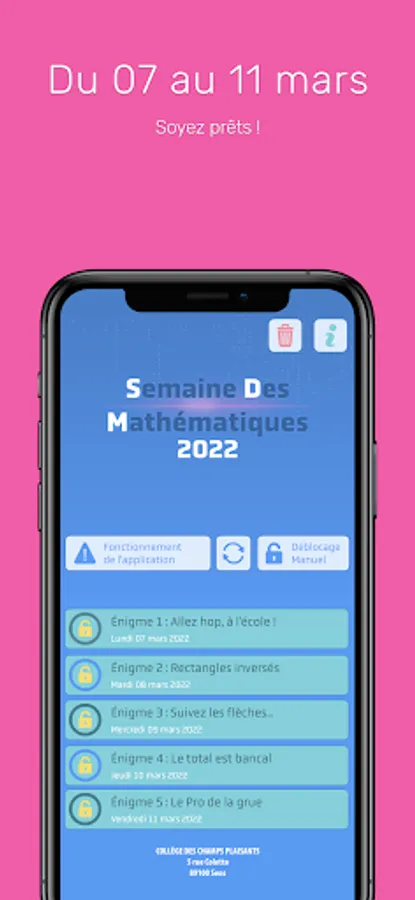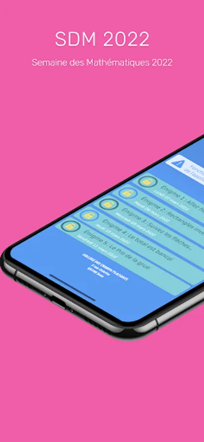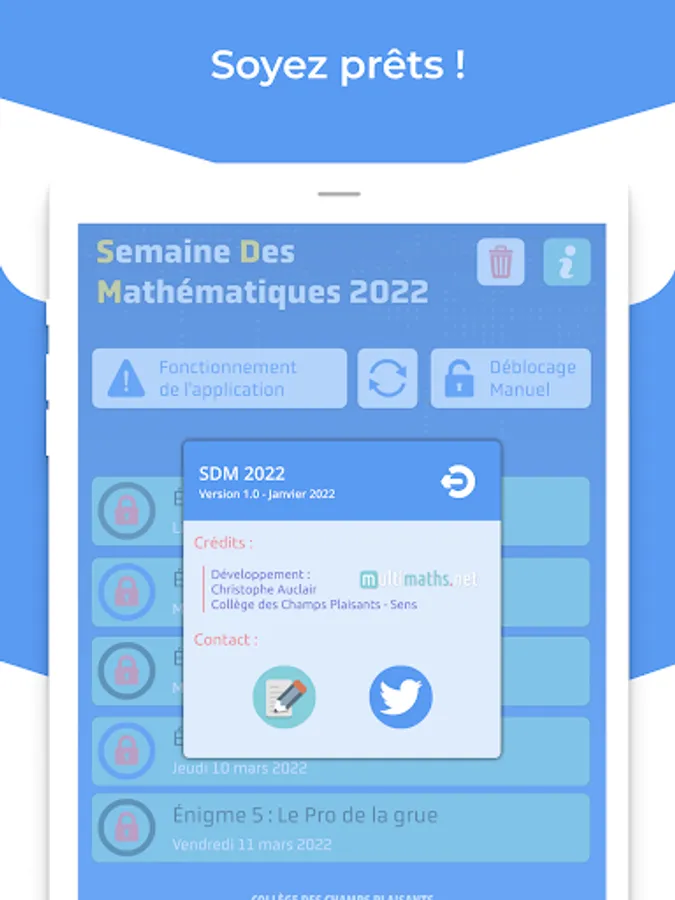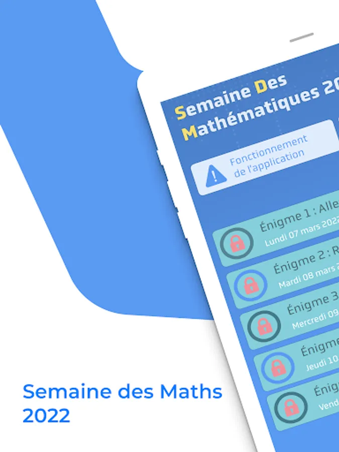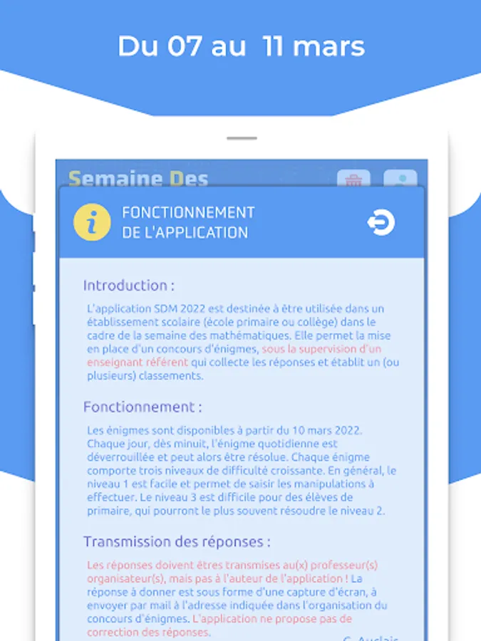 The SDM 2022 application is intended to be used in an educational establishment (elementary school or college) as part of the mathematics week. It allows the setting up of a puzzle competition, under the supervision of a referent teacher who collects the answers and establishes one (or more) rankings.