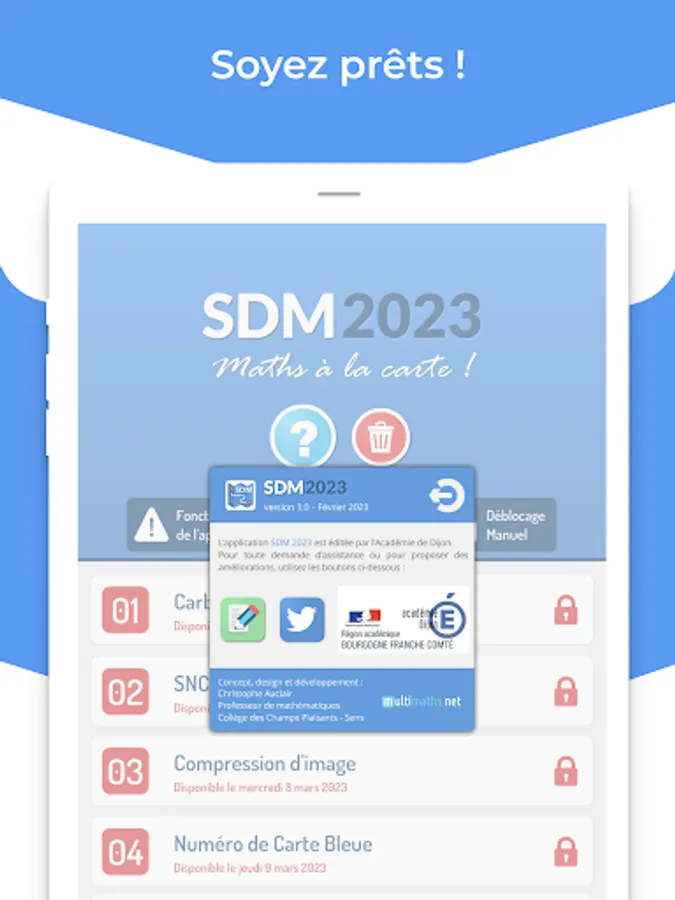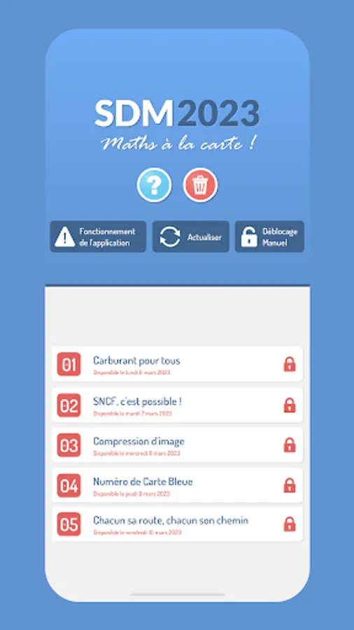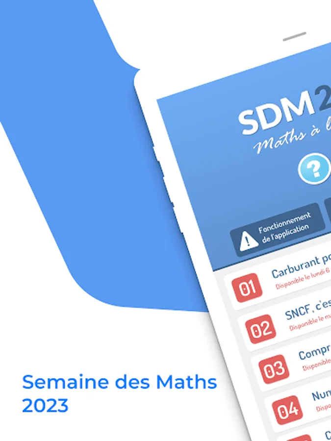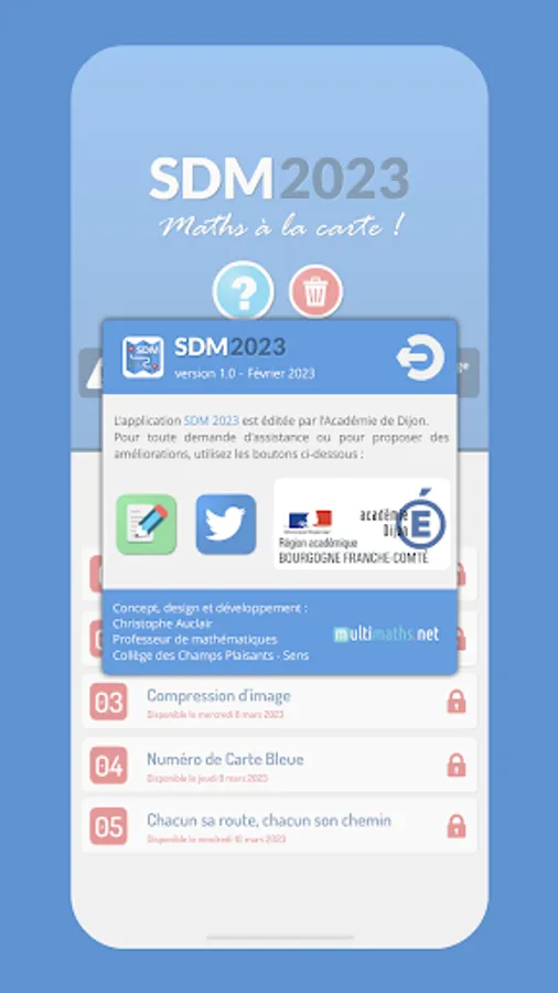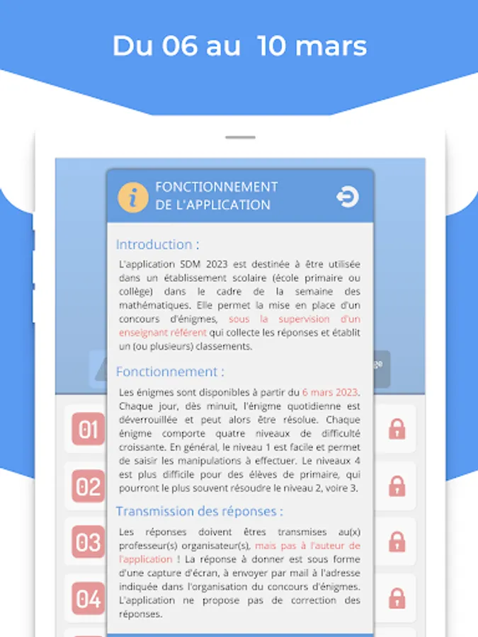 The SDM 2023 application is intended to be used in a school (primary school or college) as part of the mathematics week. It allows the setting up of a puzzle competition, under the supervision of a referent teacher who collects the answers and establishes one (or more) rankings.