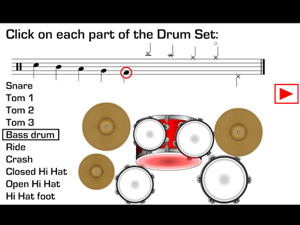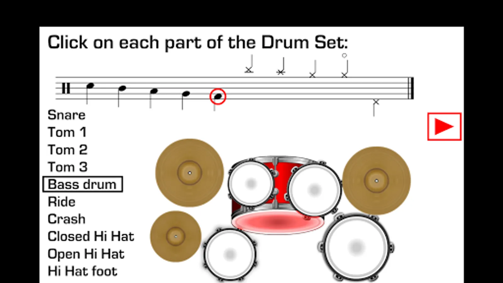 This section has exercises on which notes appear on the staff and you have to click the part of Drum Set corresponding to each particular note.