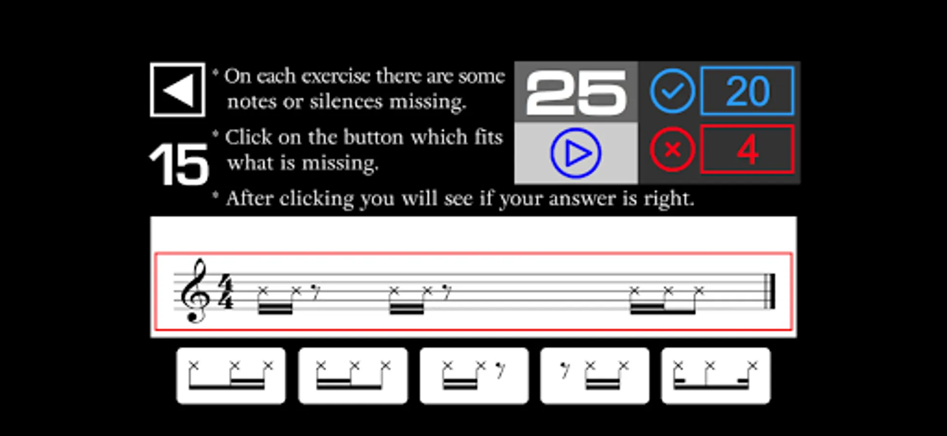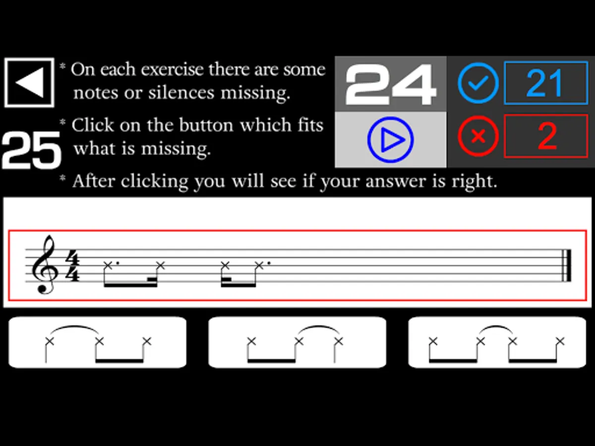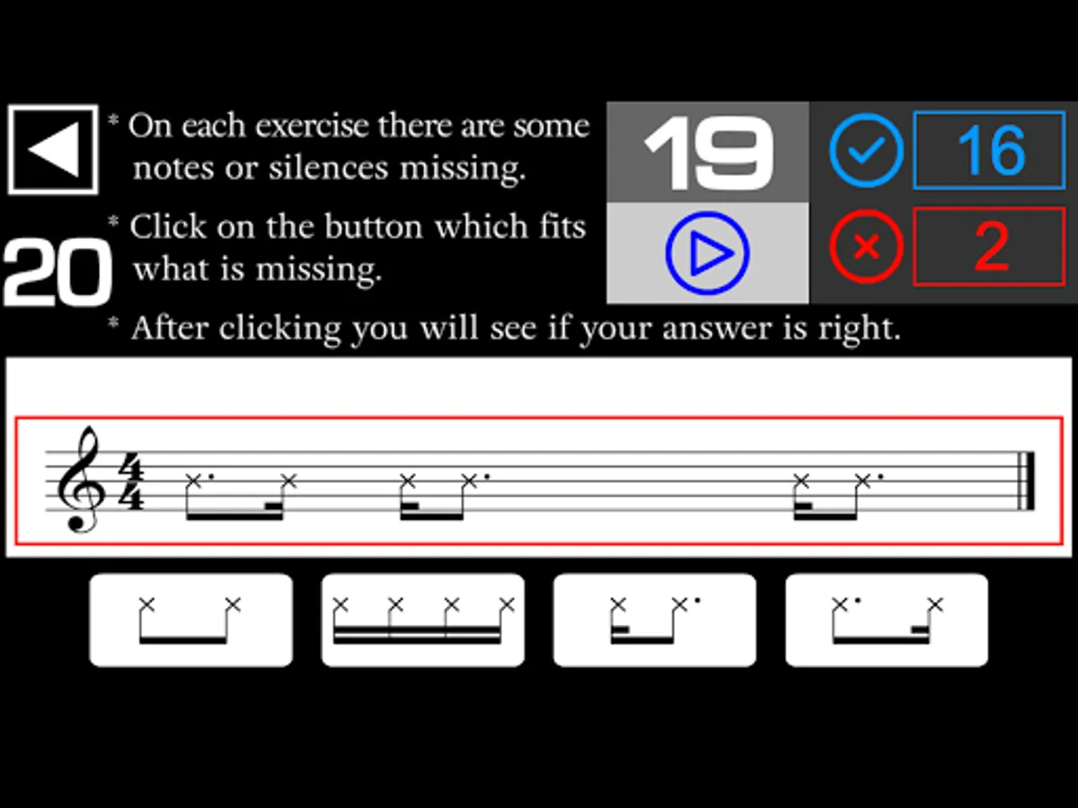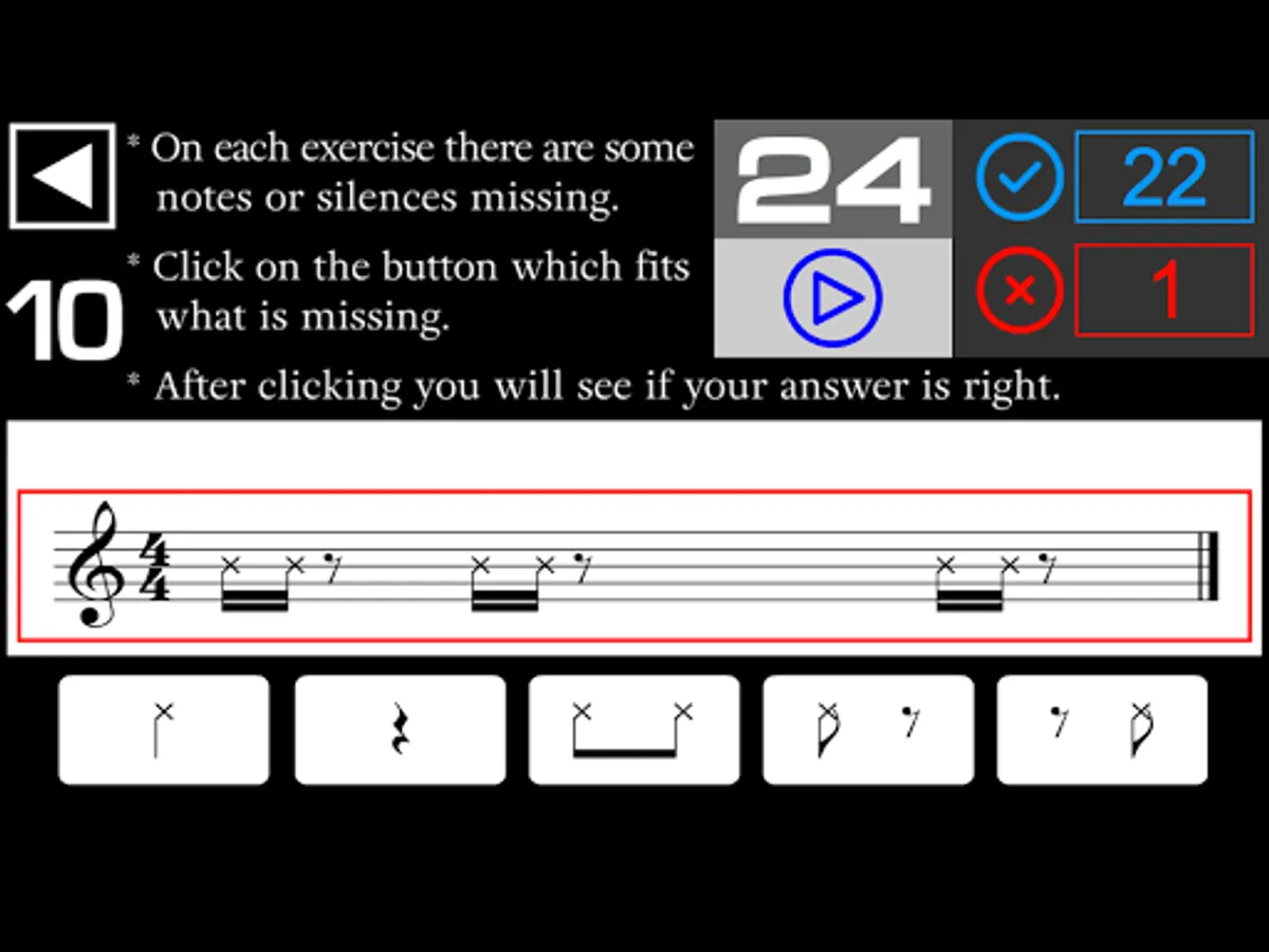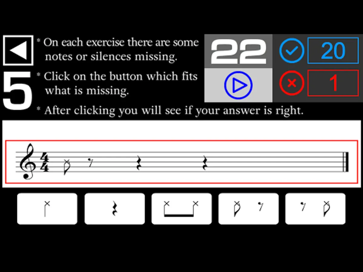 - On each exercise there are some notes or silences missing in the music sheet. You have to listen and click on the button which fits what is missing in the music sheet.