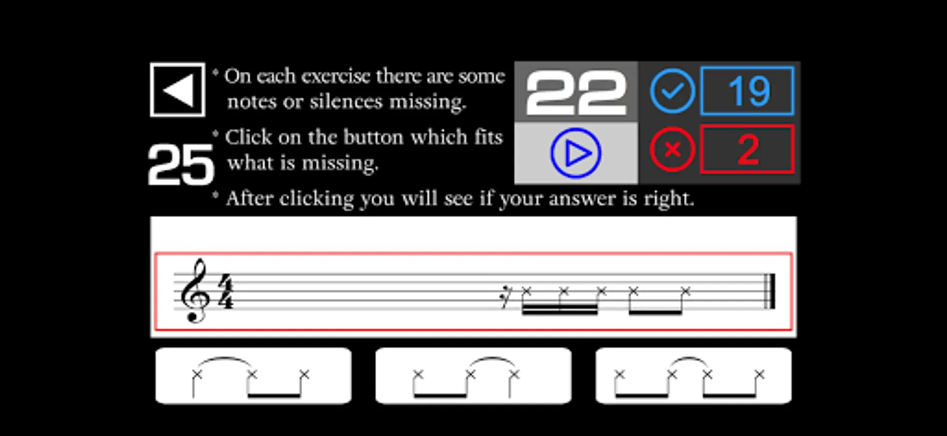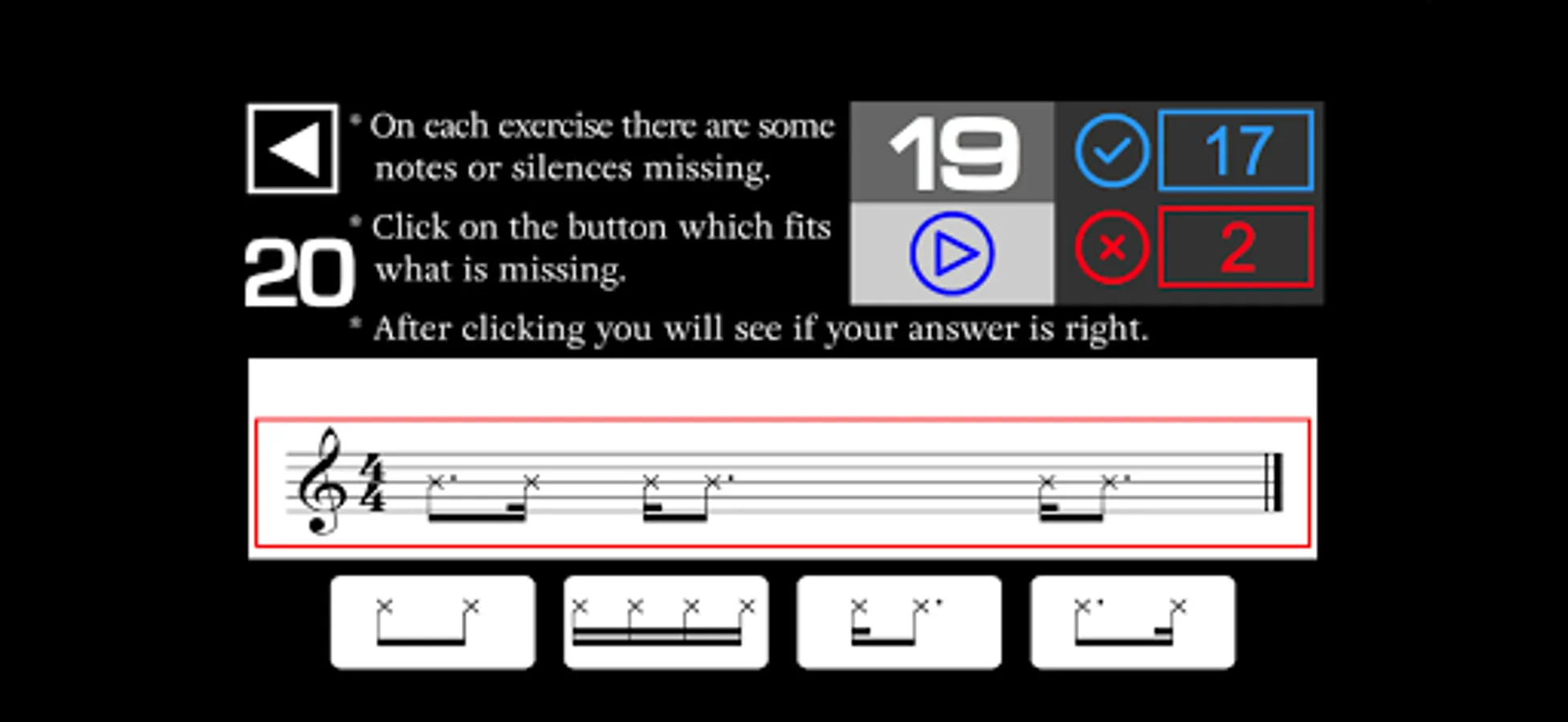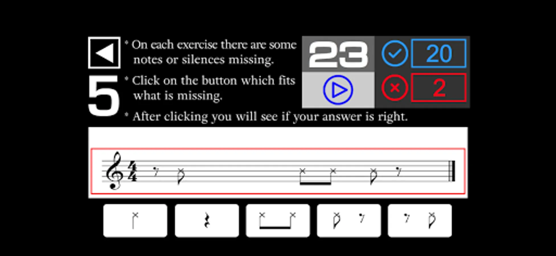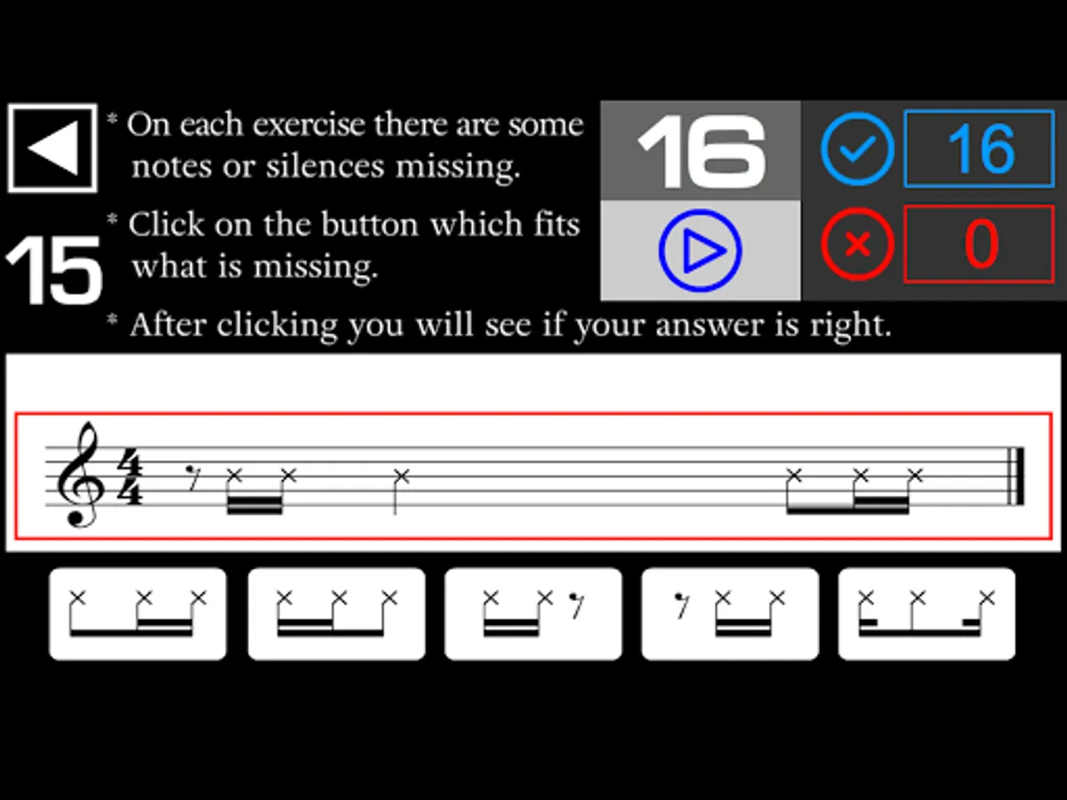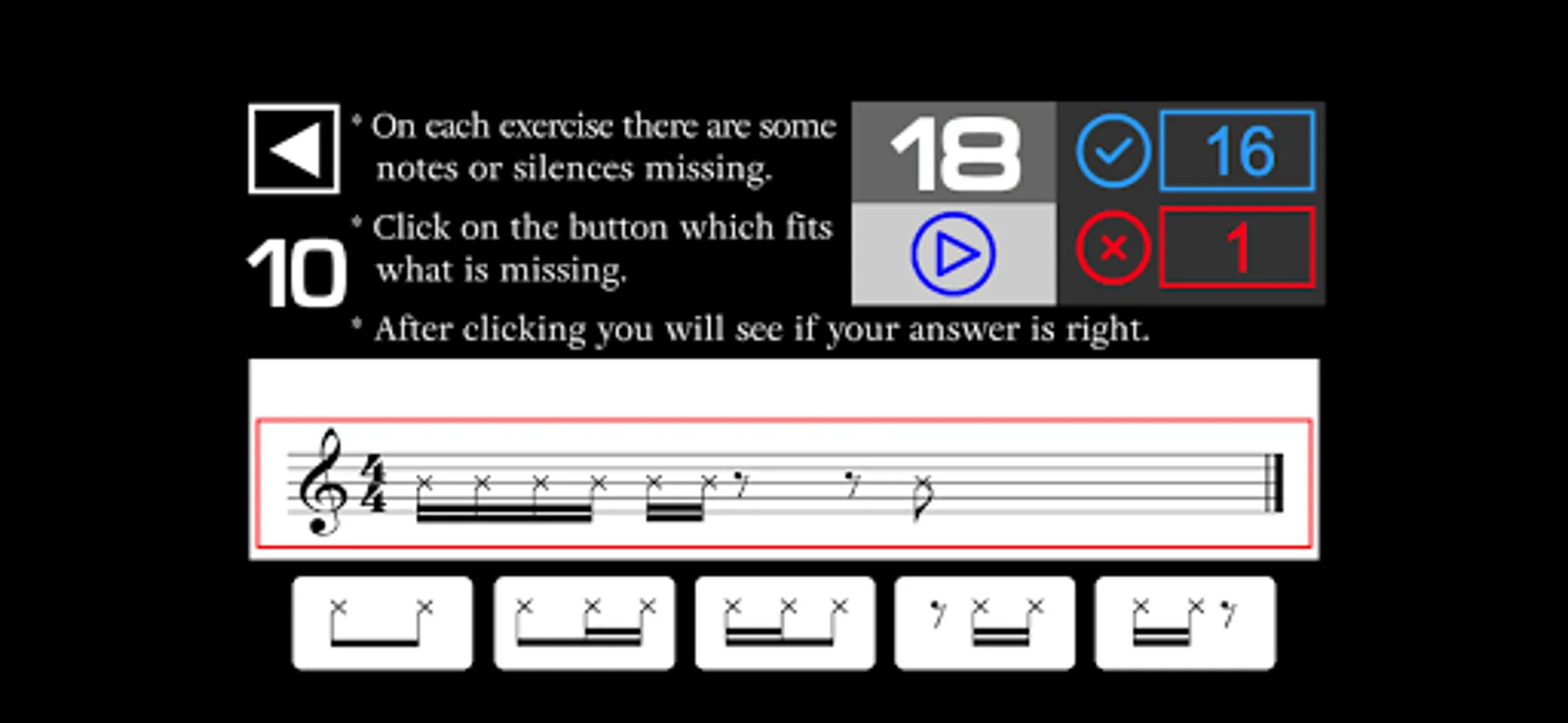 - On each exercise there are some notes or silences missing in the music sheet. You have to listen and click on the button which fits what is missing in the music sheet.