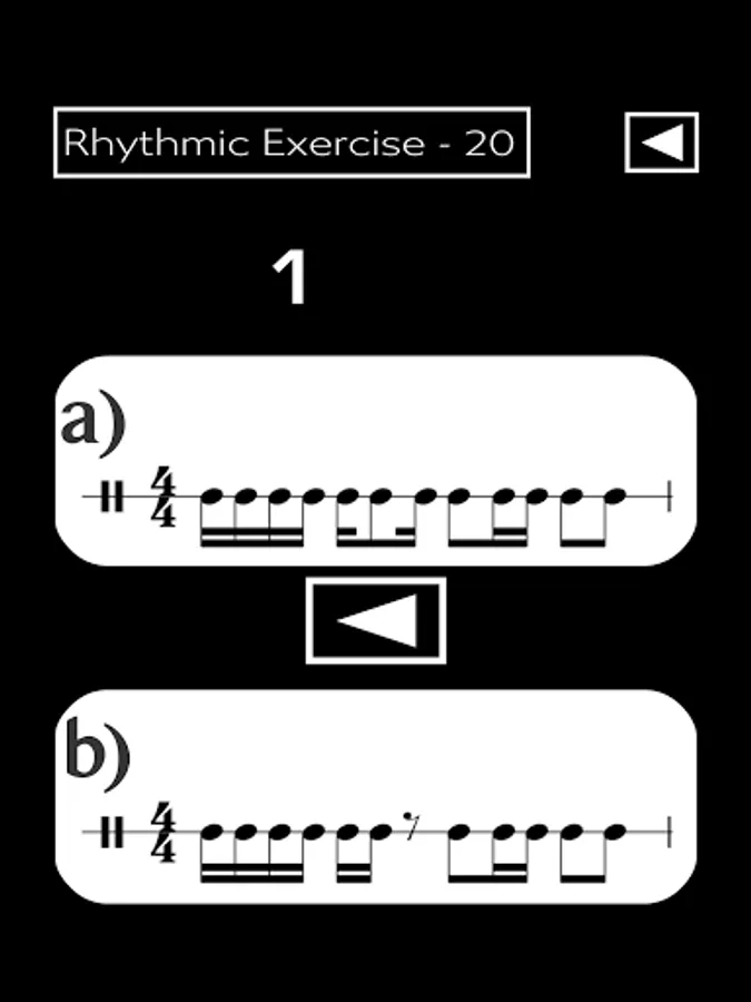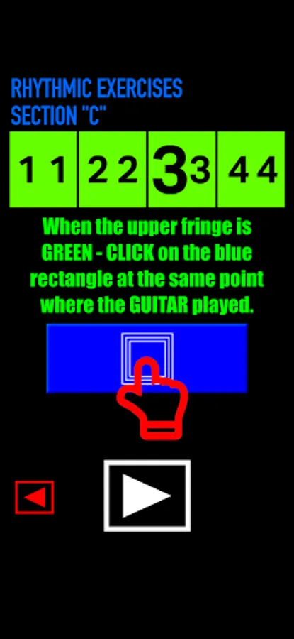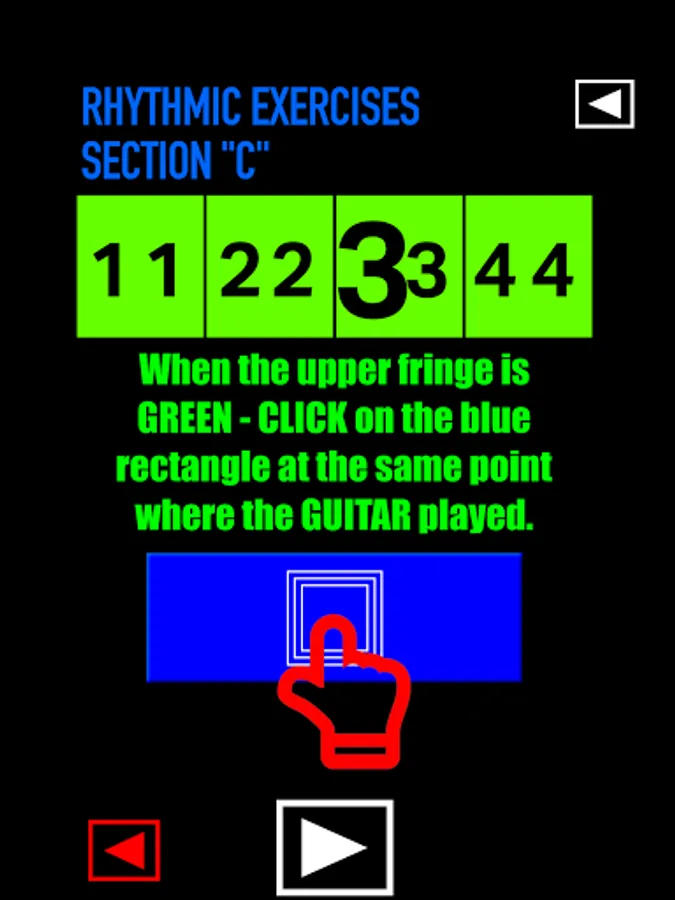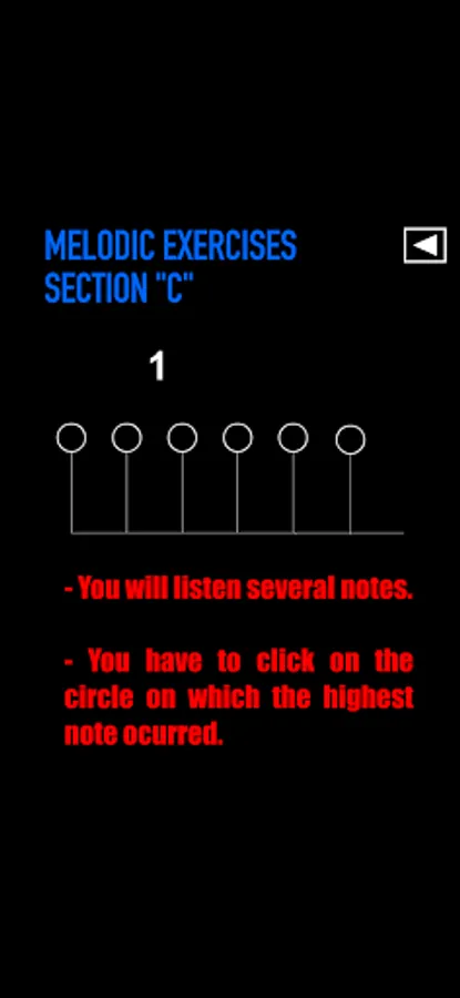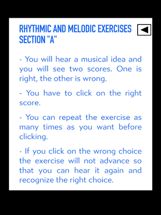 SECTION “C” has a different type of ear training exercises which are not related to any written music. Rhythmic exercises on this section are to practice the ability to reproduce a rhythmic combination just by listening to it. On the melodic exercises of this section you will listen a series of sounds and you have to recognize the higher one.