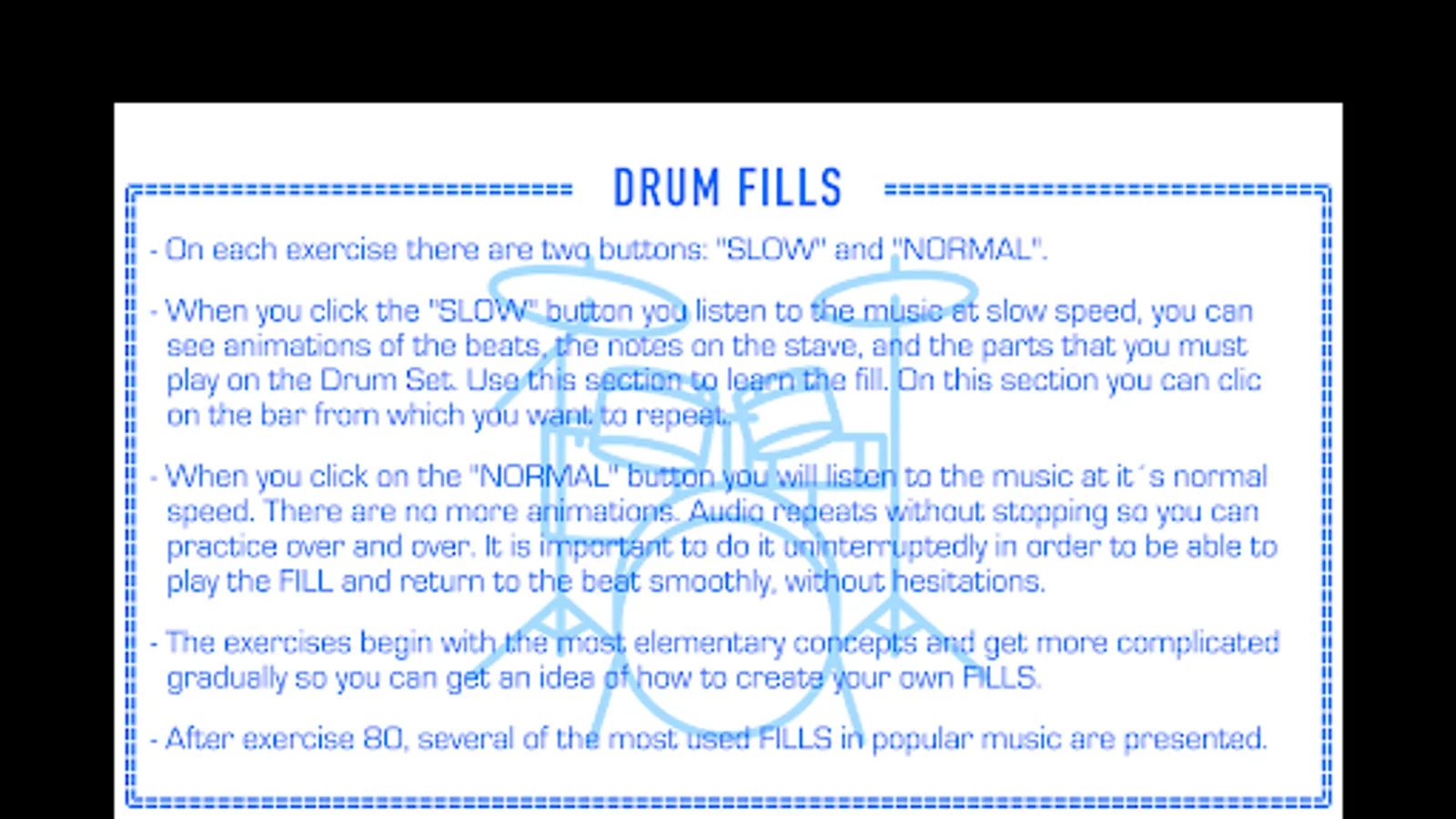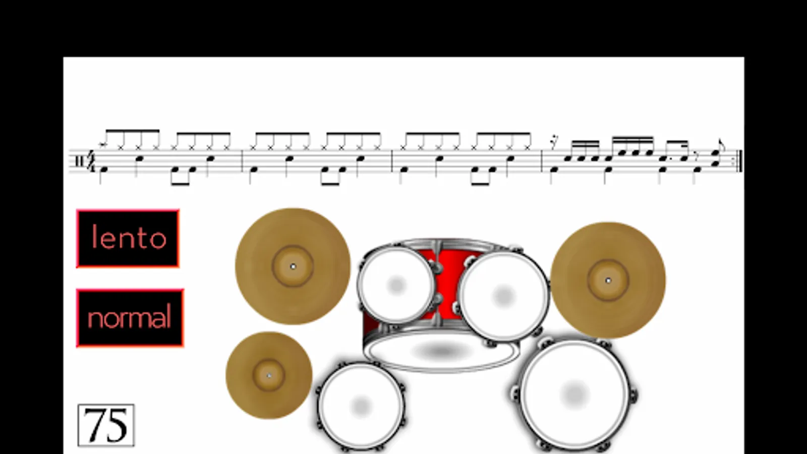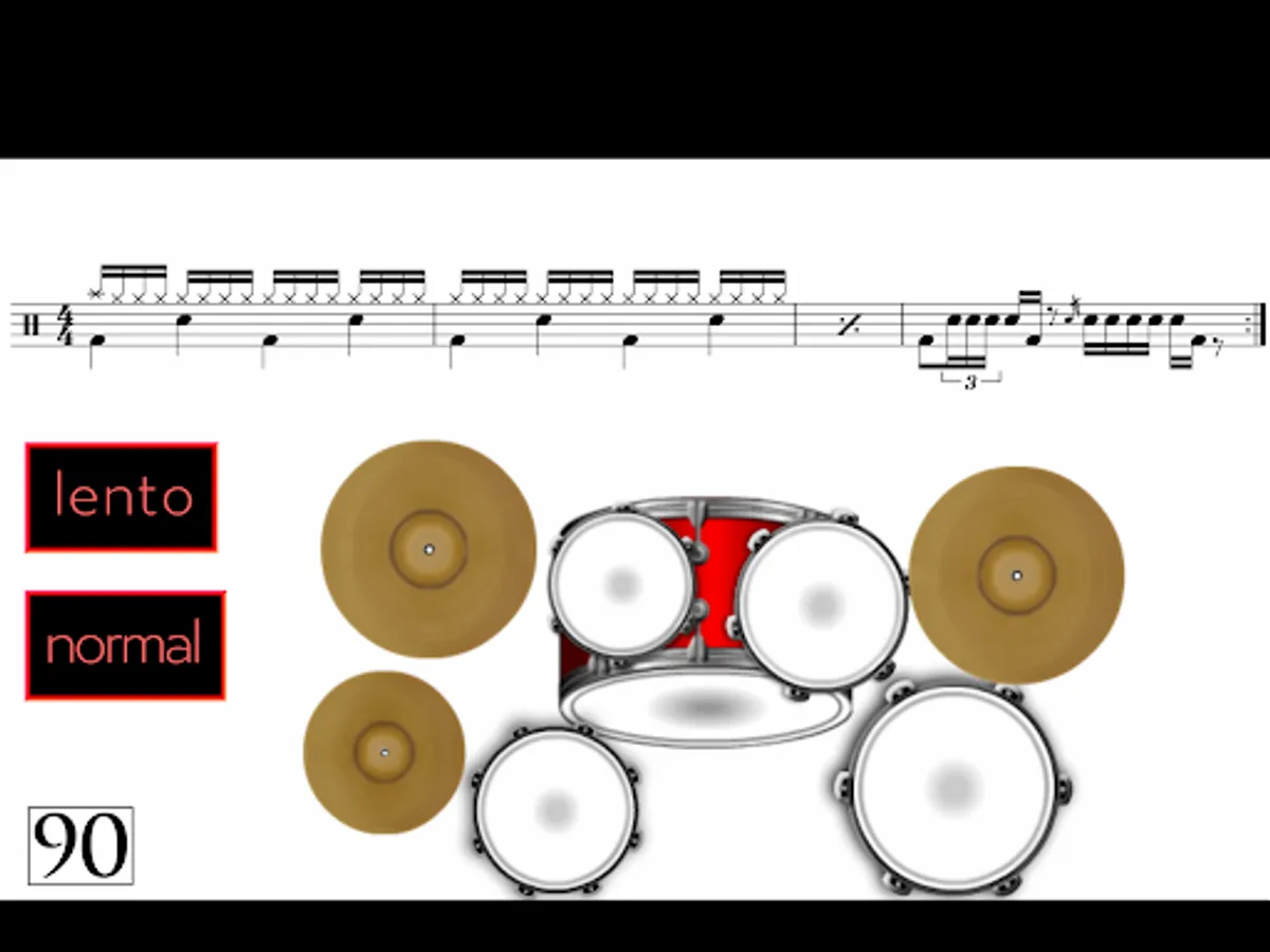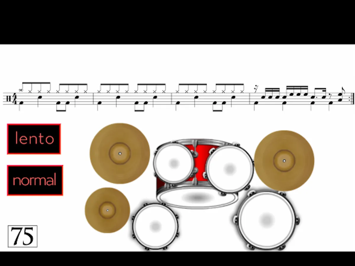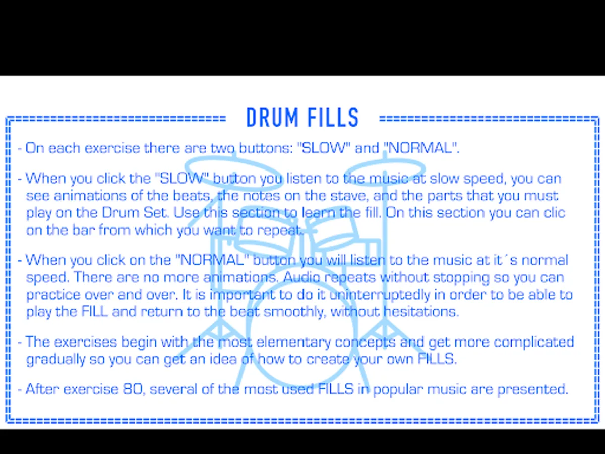 - There is also a “NORMAL” button with which you listen to the music at its normal speed. There are no more animations. The audio is repeated indefinitely so you can practice over and over. It is important to do it uninterruptedly in order to be able to play the FILL and return to the beat smoothly, with no hesitations.