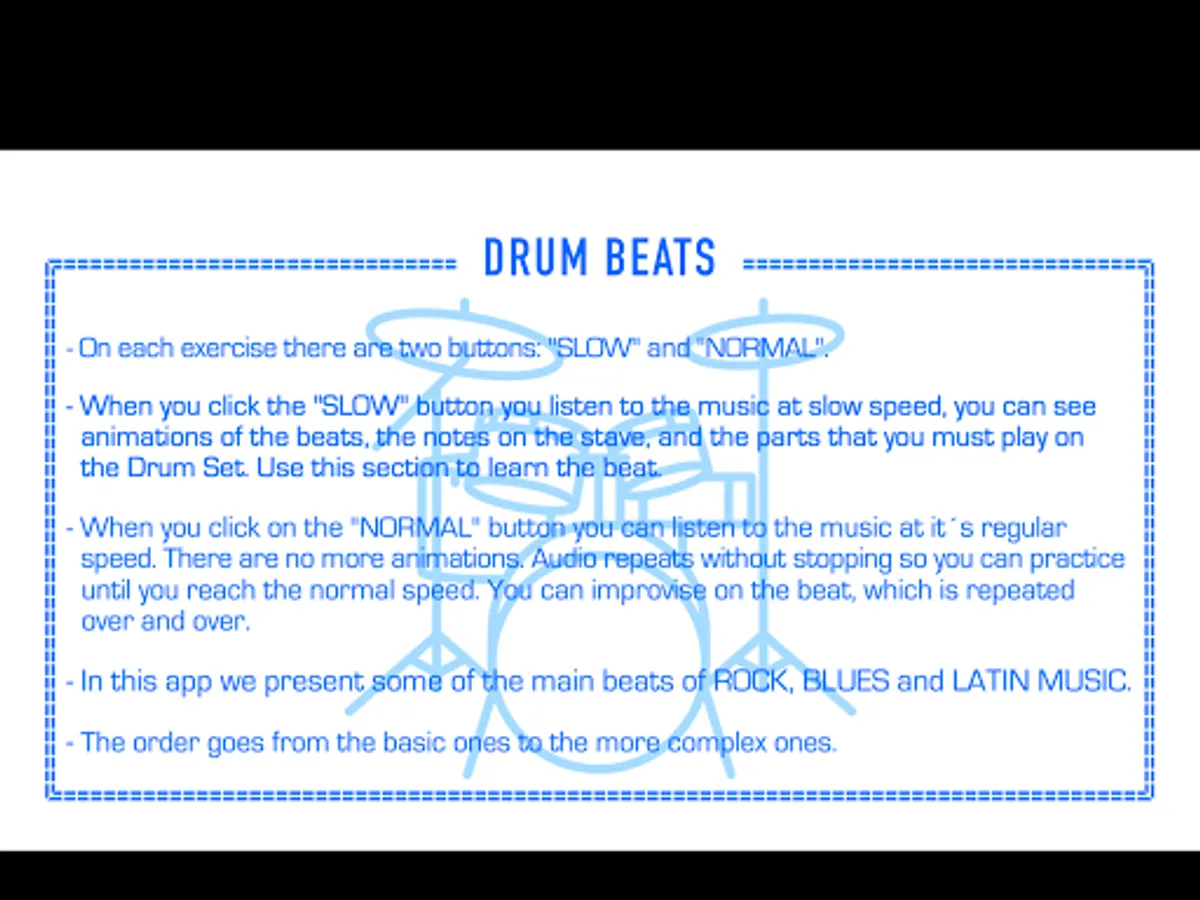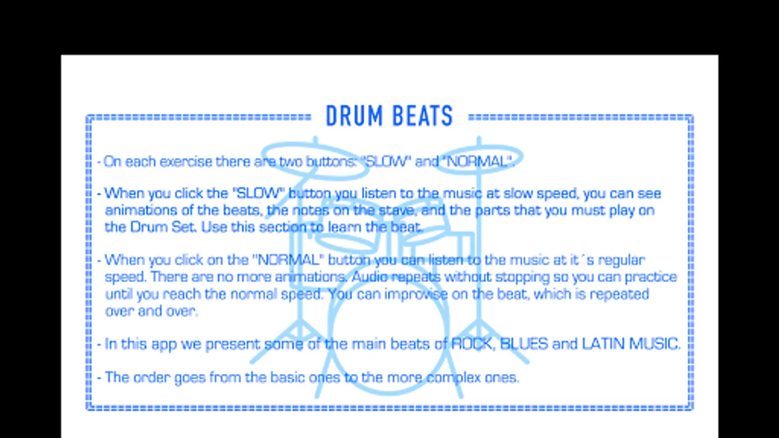 This is an educational app that makes easy for anyone to learn how to play some of the main Drum Beats in the Drum Set. From beginner to intermediate.