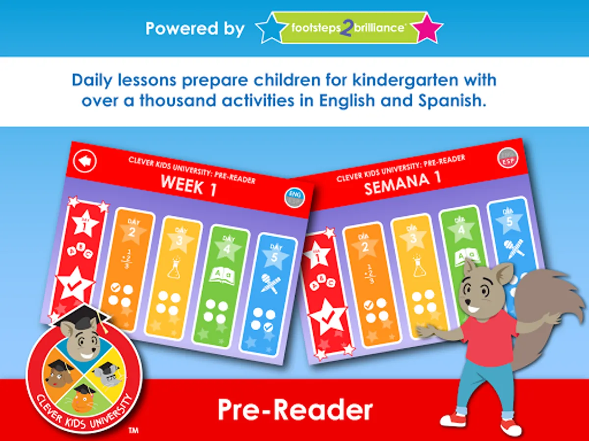 Welcome to Clever Kids University: Pre-Reader, a powerful new bilingual app that prepares children for kindergarten in English and Spanish. You will need a login or Super Secret Code to get started. Discover whether we have partners providing access in your area here: www.myf2b.com/register. If you are interested in partnering with us to begin a citywide equity access initiative, contact mic@footsteps2brilliance.com.