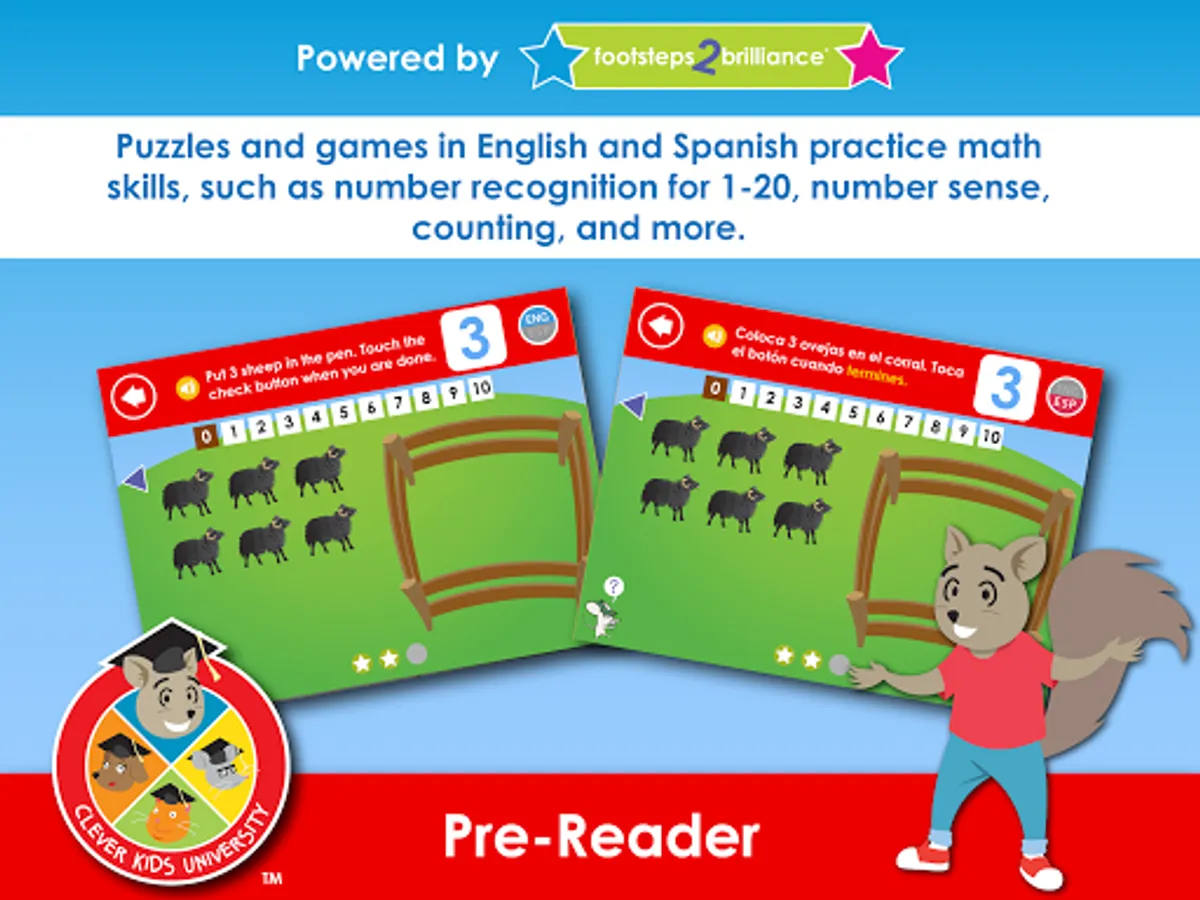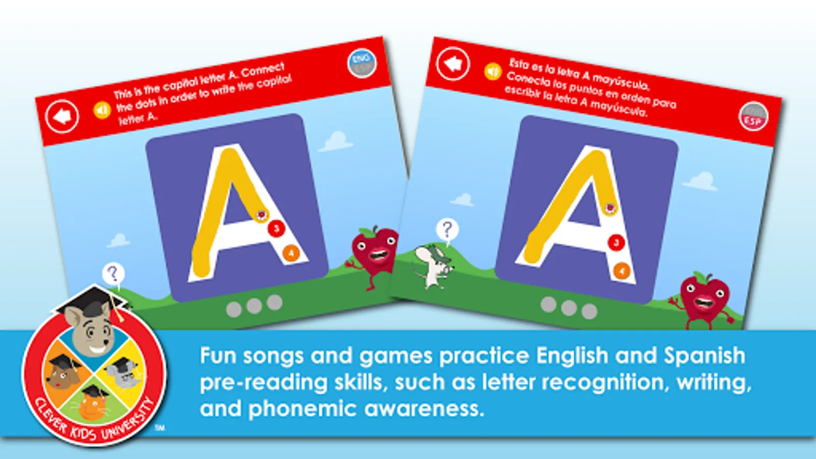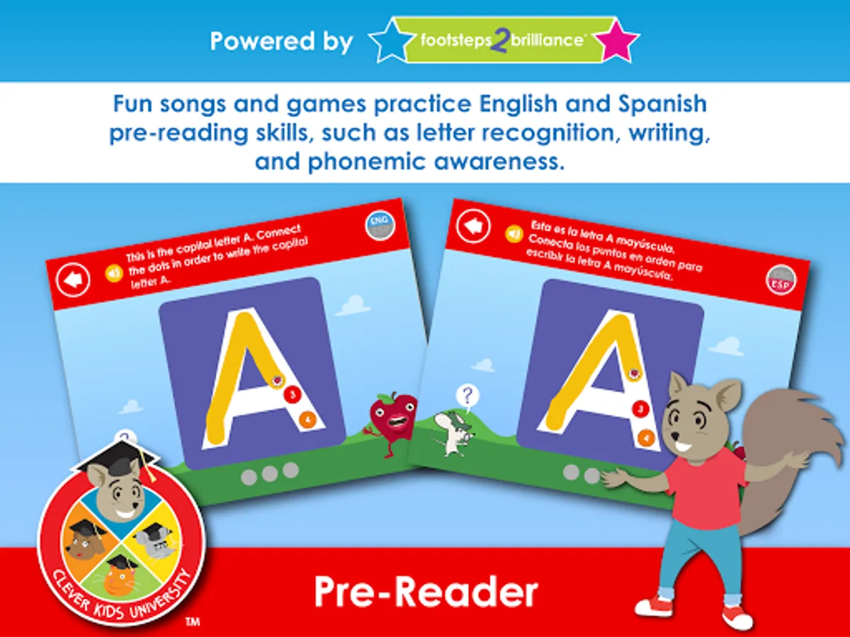 Clever Kids University: Pre-Reader offers unprecedented English and Spanish support. Every activity can toggle seamlessly between English and Spanish at the touch of a button — and both languages offer full interactivity and game play.