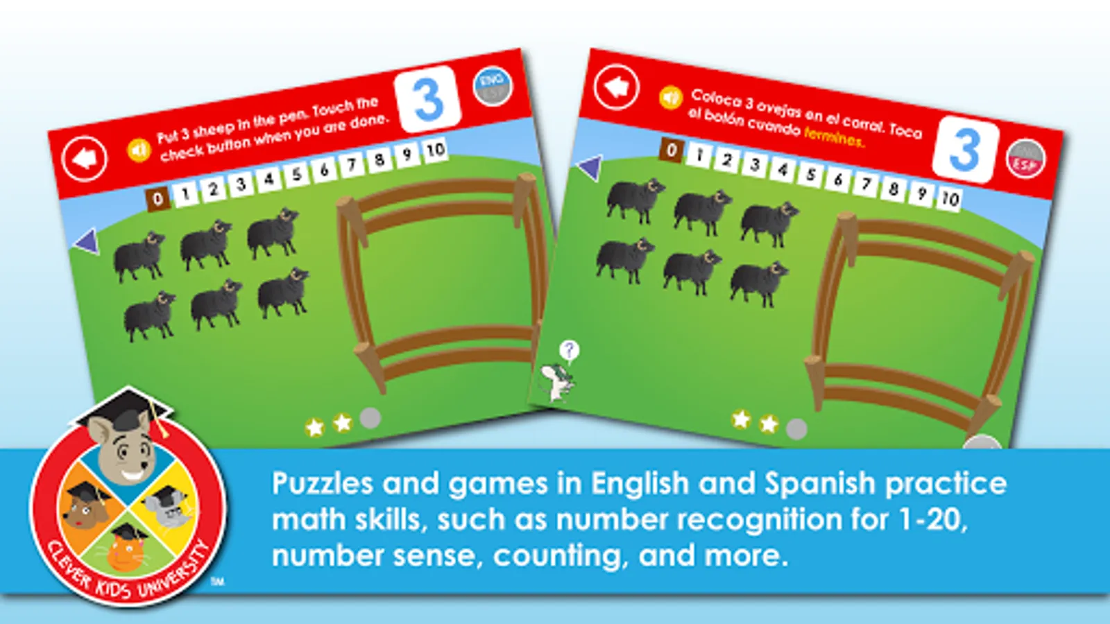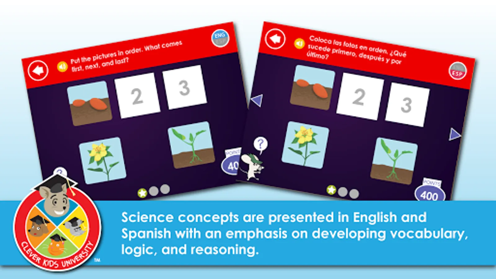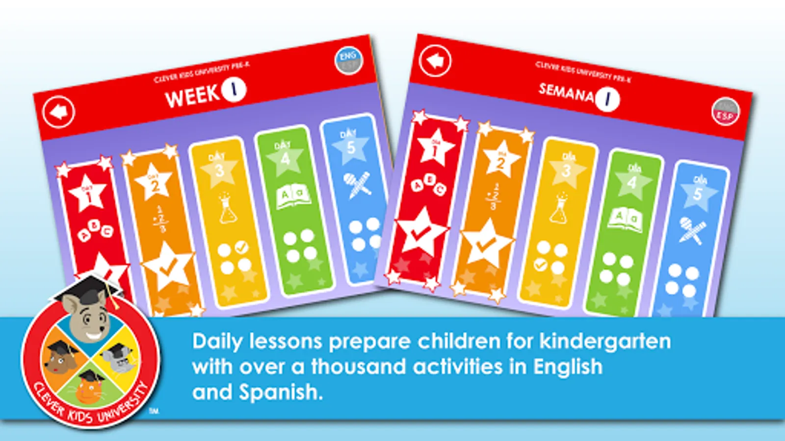 Clever Kids University: Pre-Reader offers unprecedented English and Spanish support. Every activity can toggle seamlessly between English and Spanish at the touch of a button — and both languages offer full interactivity and game play.