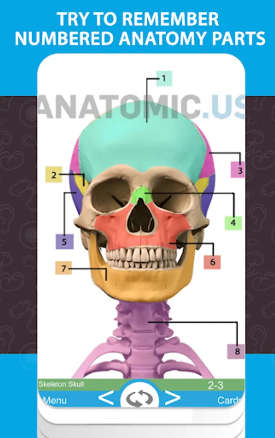 Lets say you choose the Skeletal System. Firstly, you see a card illustrating the whole human skeleton system. Each bone is coloured differently and numbered. Tap once to turn it to the other side where the bones are indicated with their names.