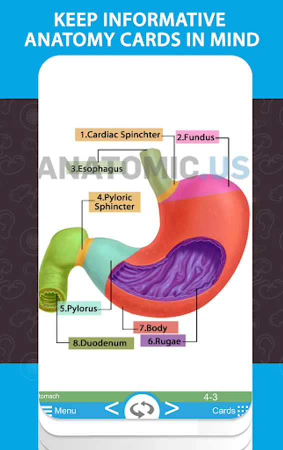 Anatomy flashcards application is useful for medical students as well as anyone interested in human body anatomy and medicine. You can see and learn the locations of the parts of human anatomy system which is illustrated on the diagrams. These colourful and schematic flashcards include all human systems and gross anatomy.