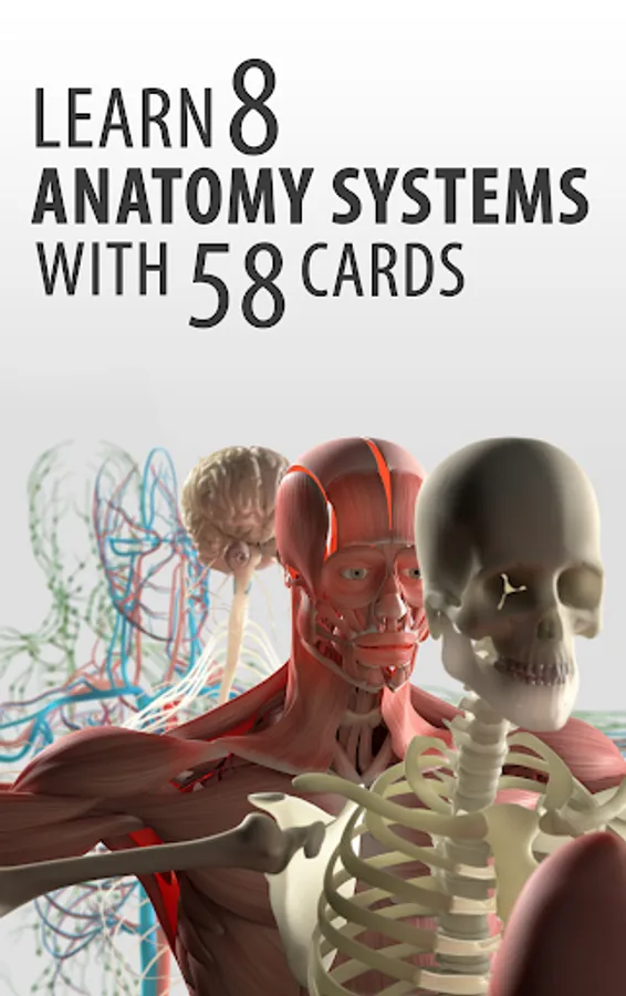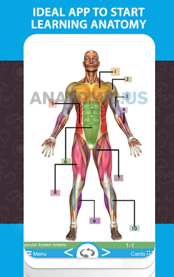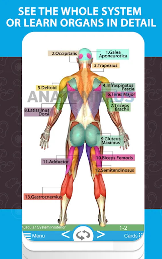 Go to menu to choose one of the human body systems or gross anatomy or tap on the flashcards to see the parts of the systems more detailed. For example, in muscular systems you can find anterior, posterior flashcards, head and neck anatomy.