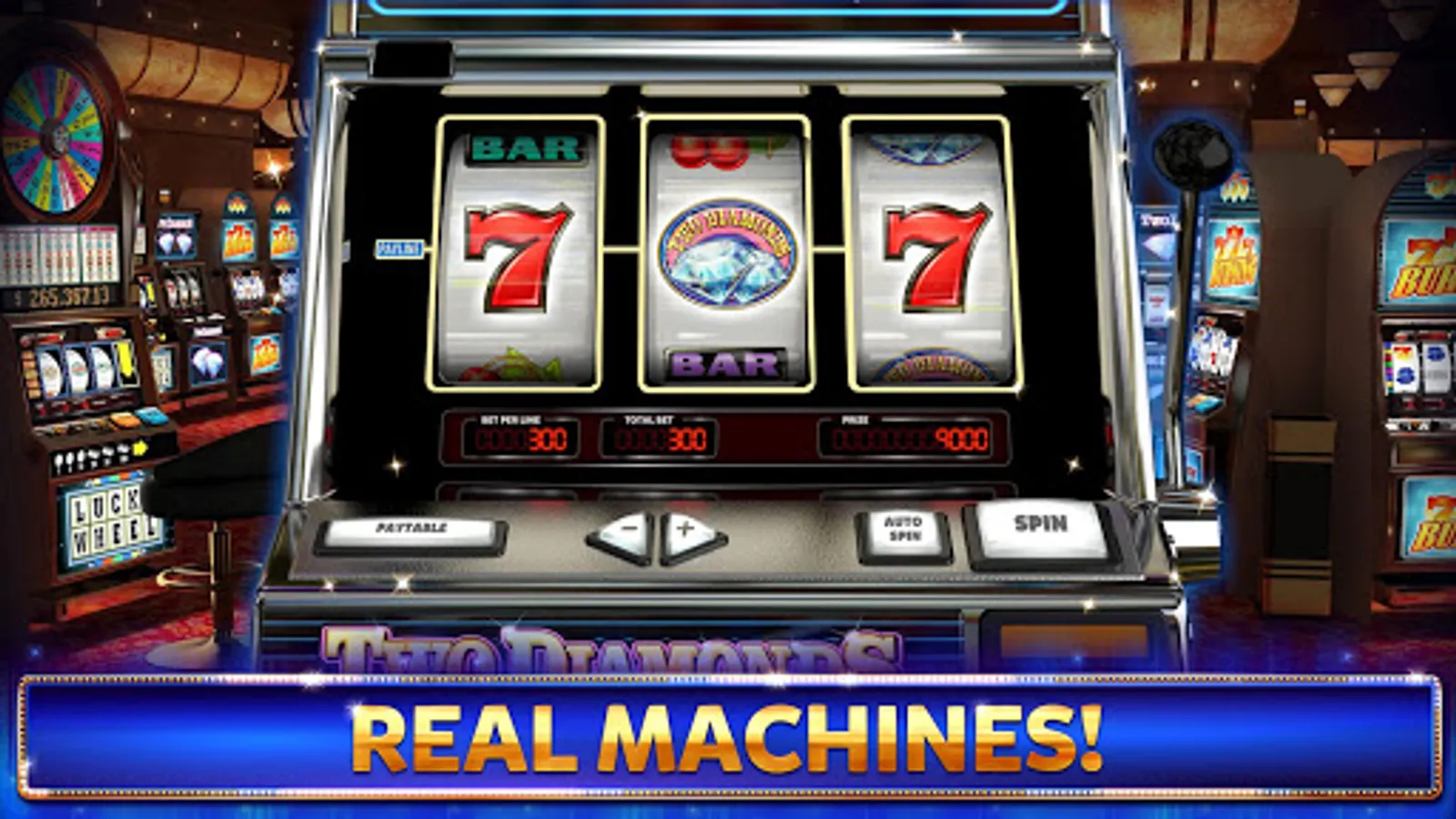 Or, if you love REAL CASINOS enter and play the MOST CLASSIC SLOT MACHINES of all time: Retro, Lucky Wheel, Super 5 Stars, Two Diamonds, Burning 777…