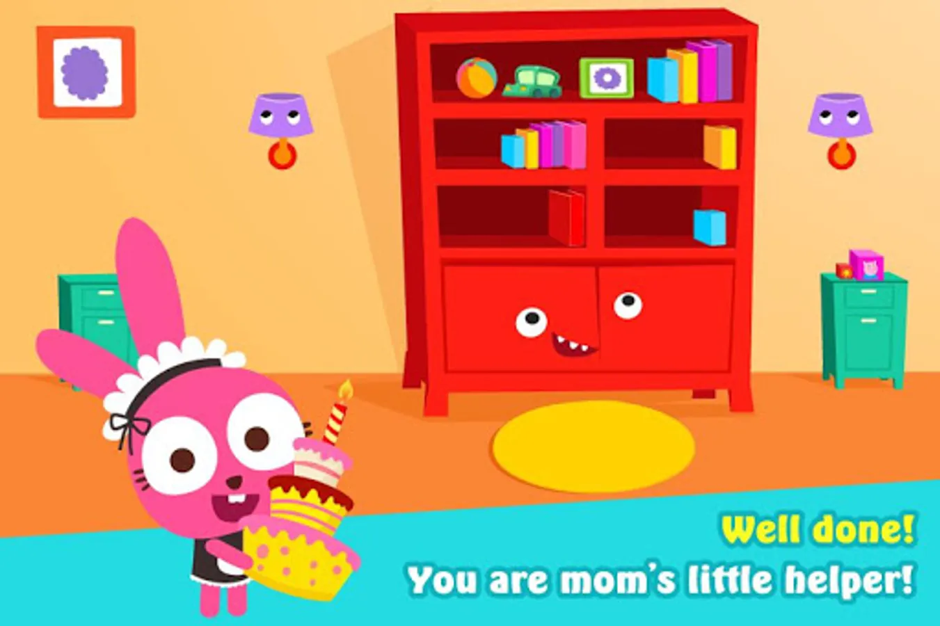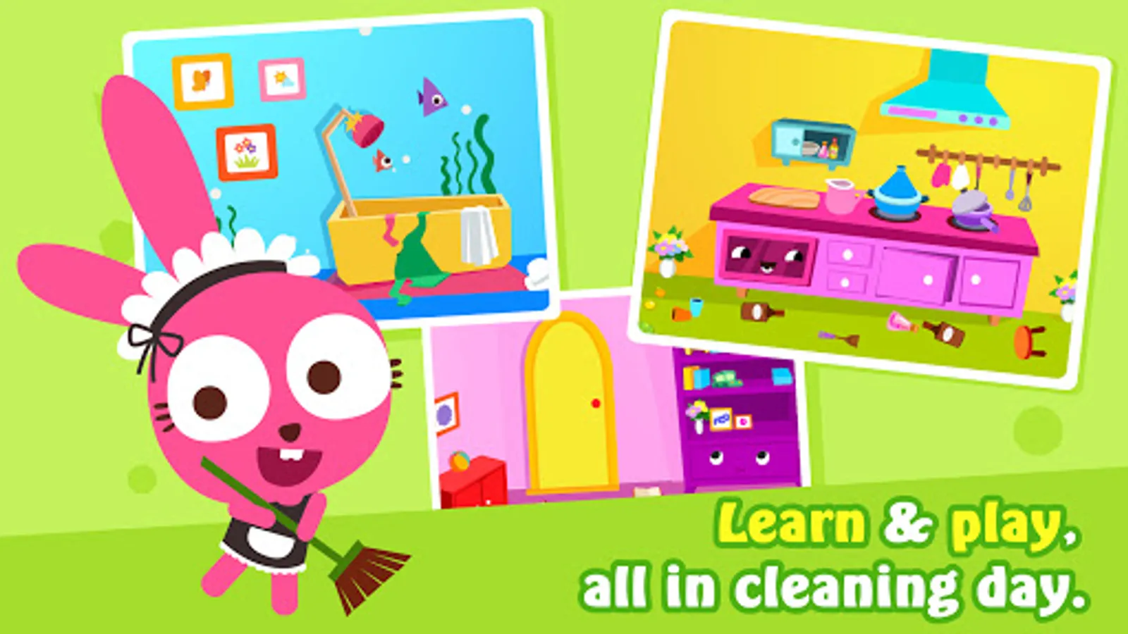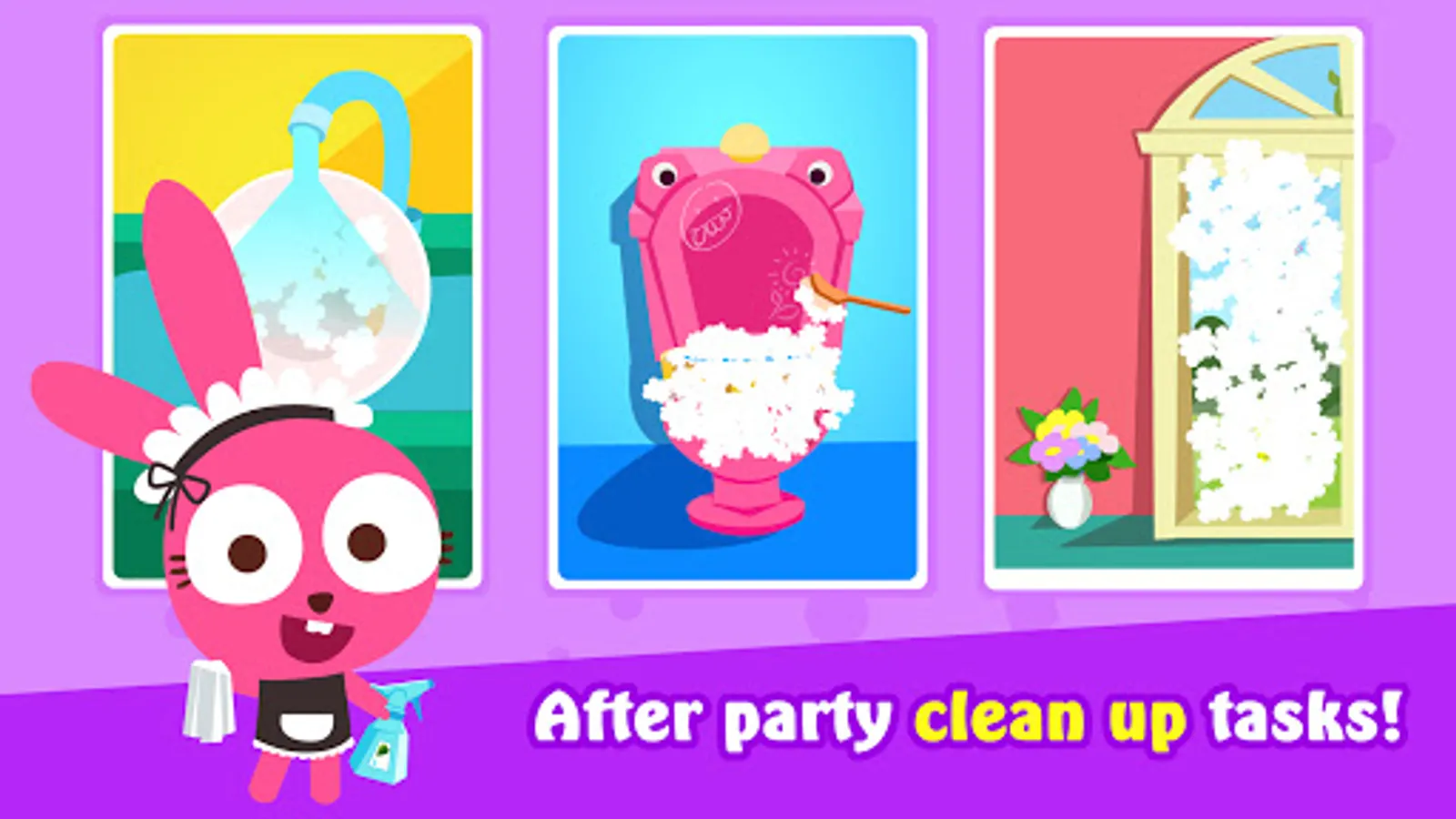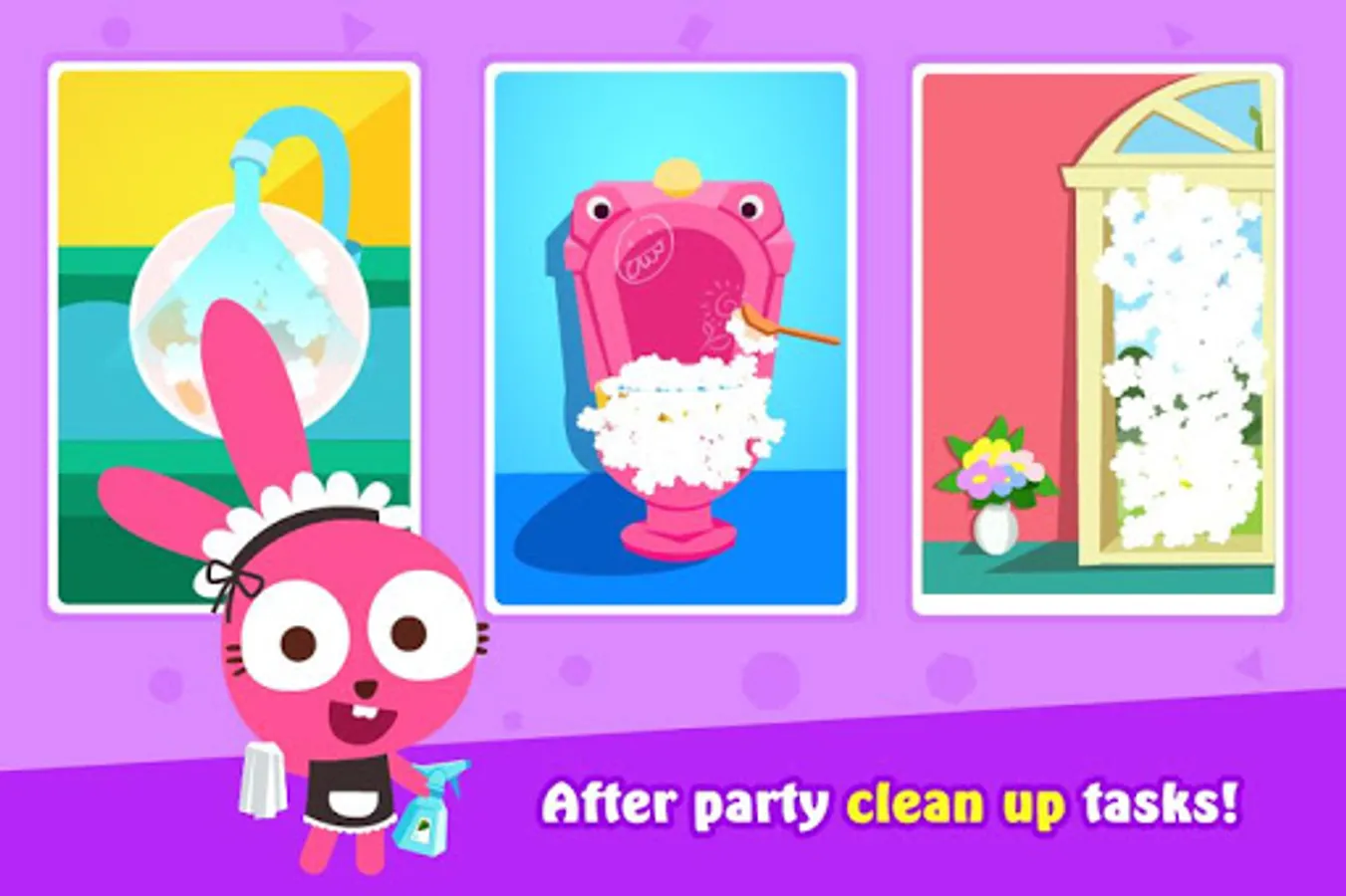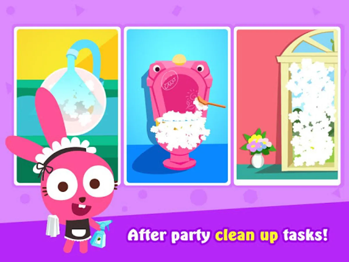 After a party with friends, the house is a mess. Help Purple Pink the Bunny to organize and clean up all rooms.
