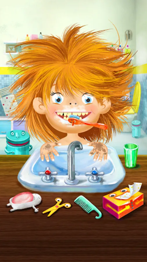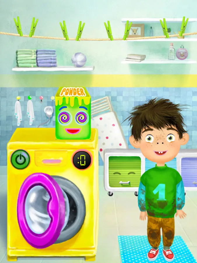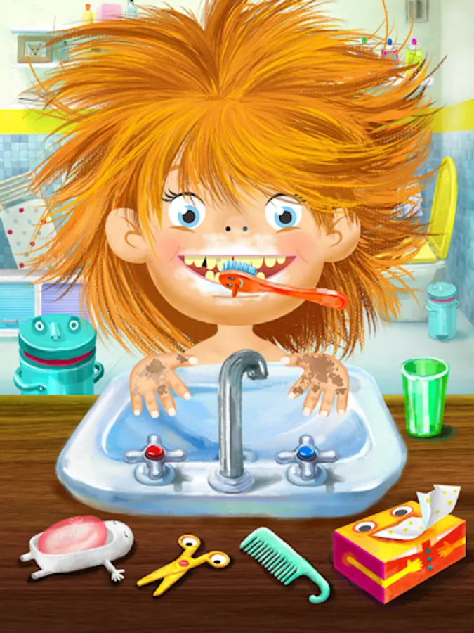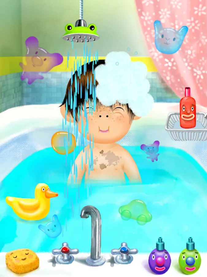 Cleanliness is fun, but even more fun that after you help your chosen character to wash hands, brush teeth, do laundry, use potty, toddler can pop soap bubbles or play with colourful sprayers, rubber ducks and various items and toys.