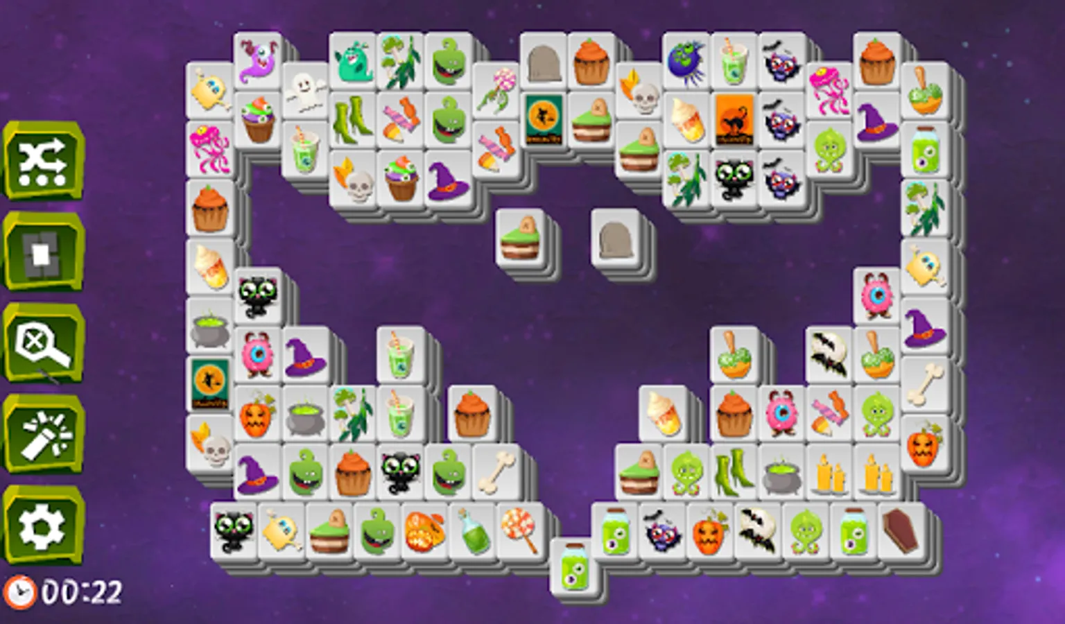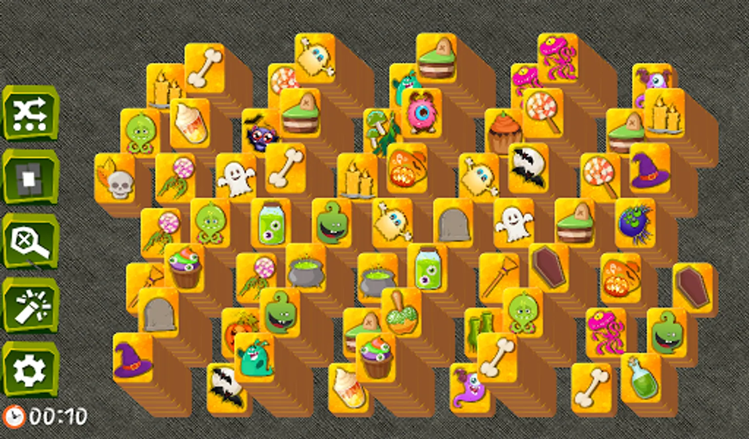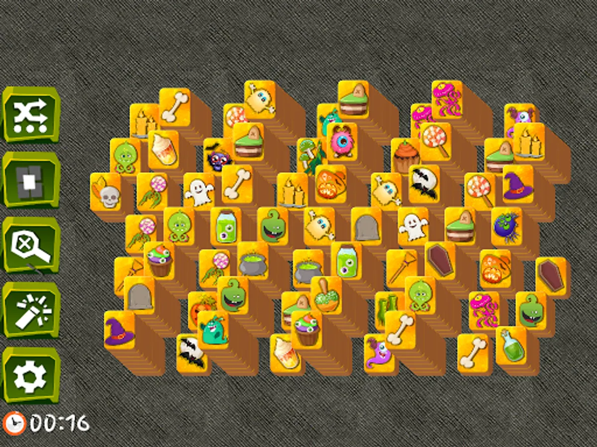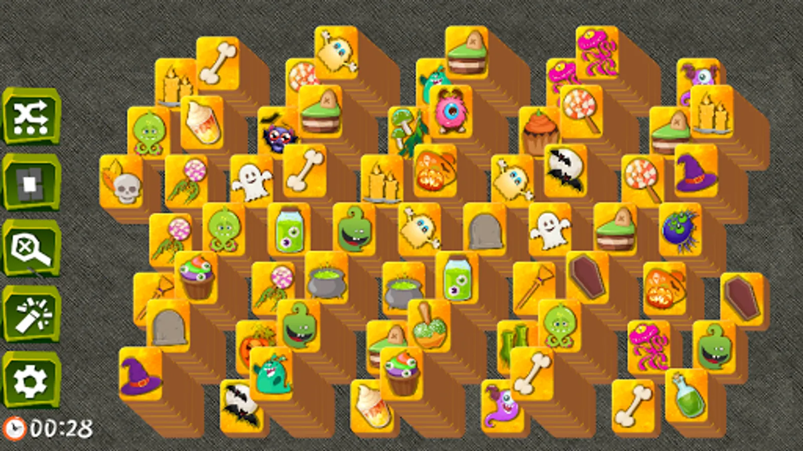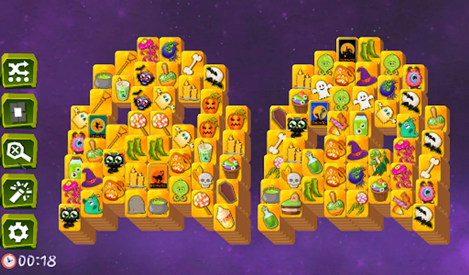 😈Play the classic Mahjong game with colorful Halloween theme with pumpkins, ghouls, witches, demons and bats. The artwork is cartoonish and colorful in style.