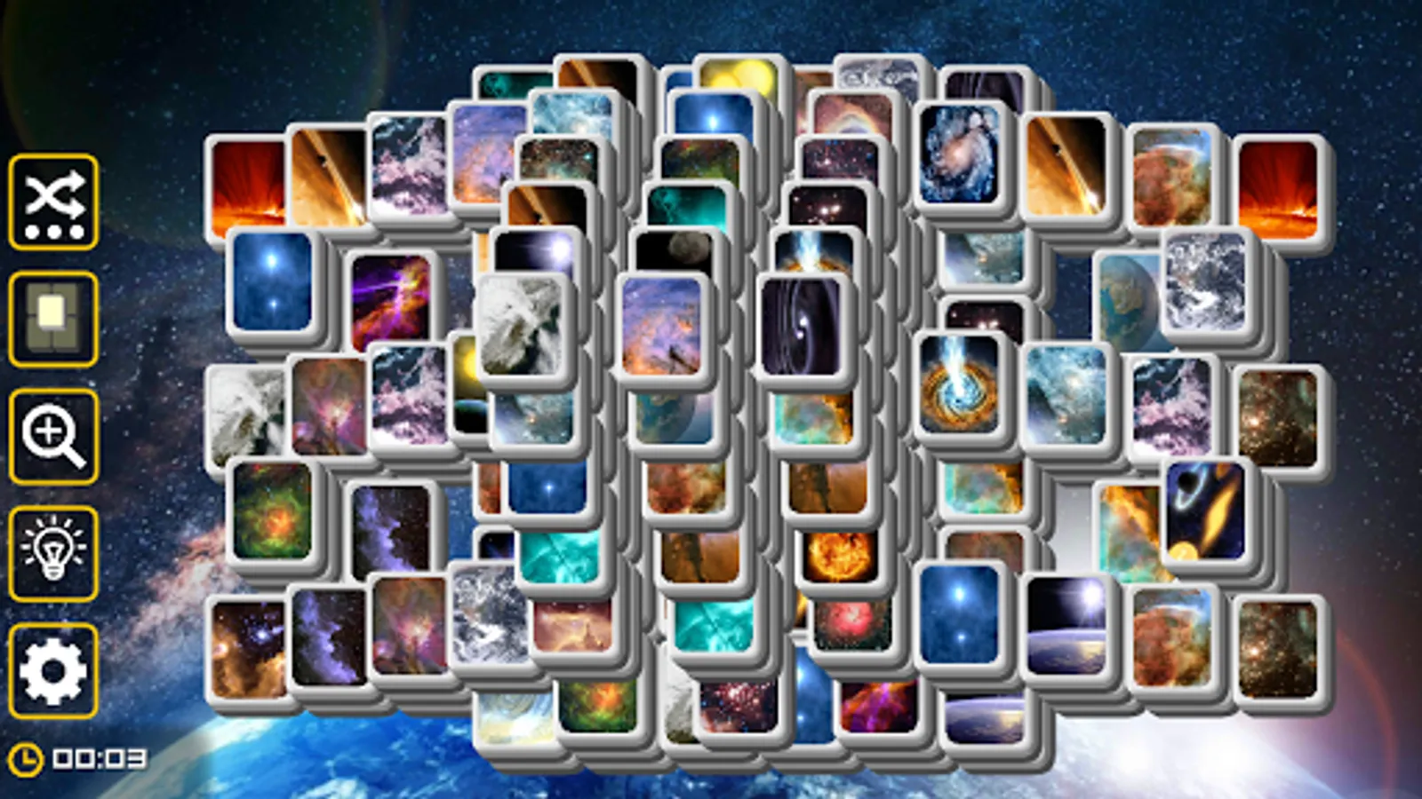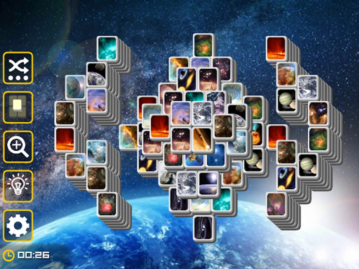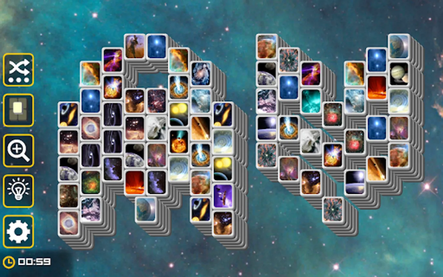 Play classic Mahjong (also known as Mahjongg or Majong) Solitaire with colorful epic galaxy, space, planets theme on your mobile devices. This Mahjong (Mahjongg) Solitaire is an easy game to play and this version has simple tap interface, good for single touch (one tap) game play.