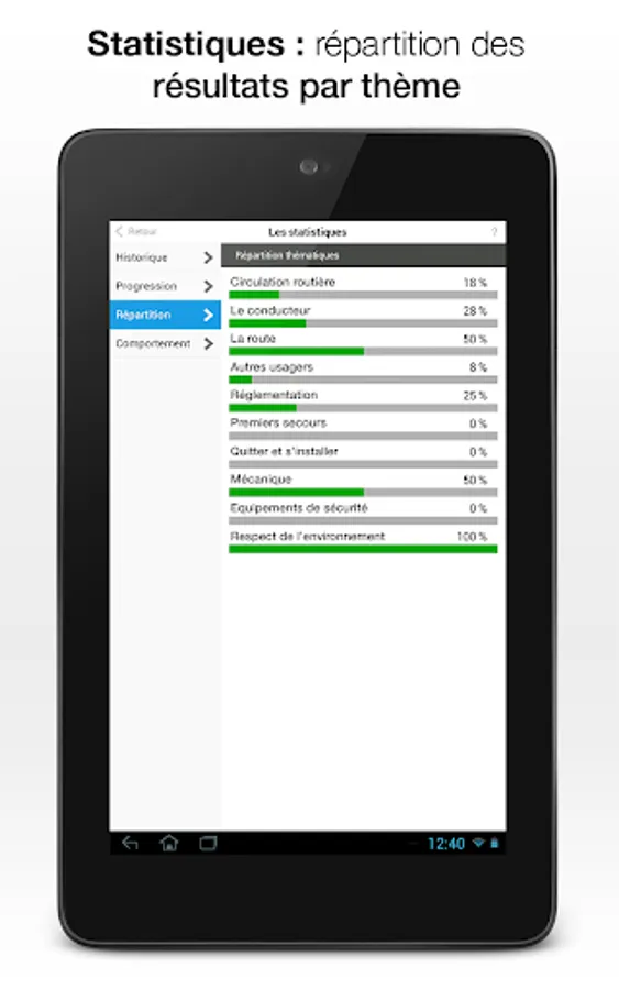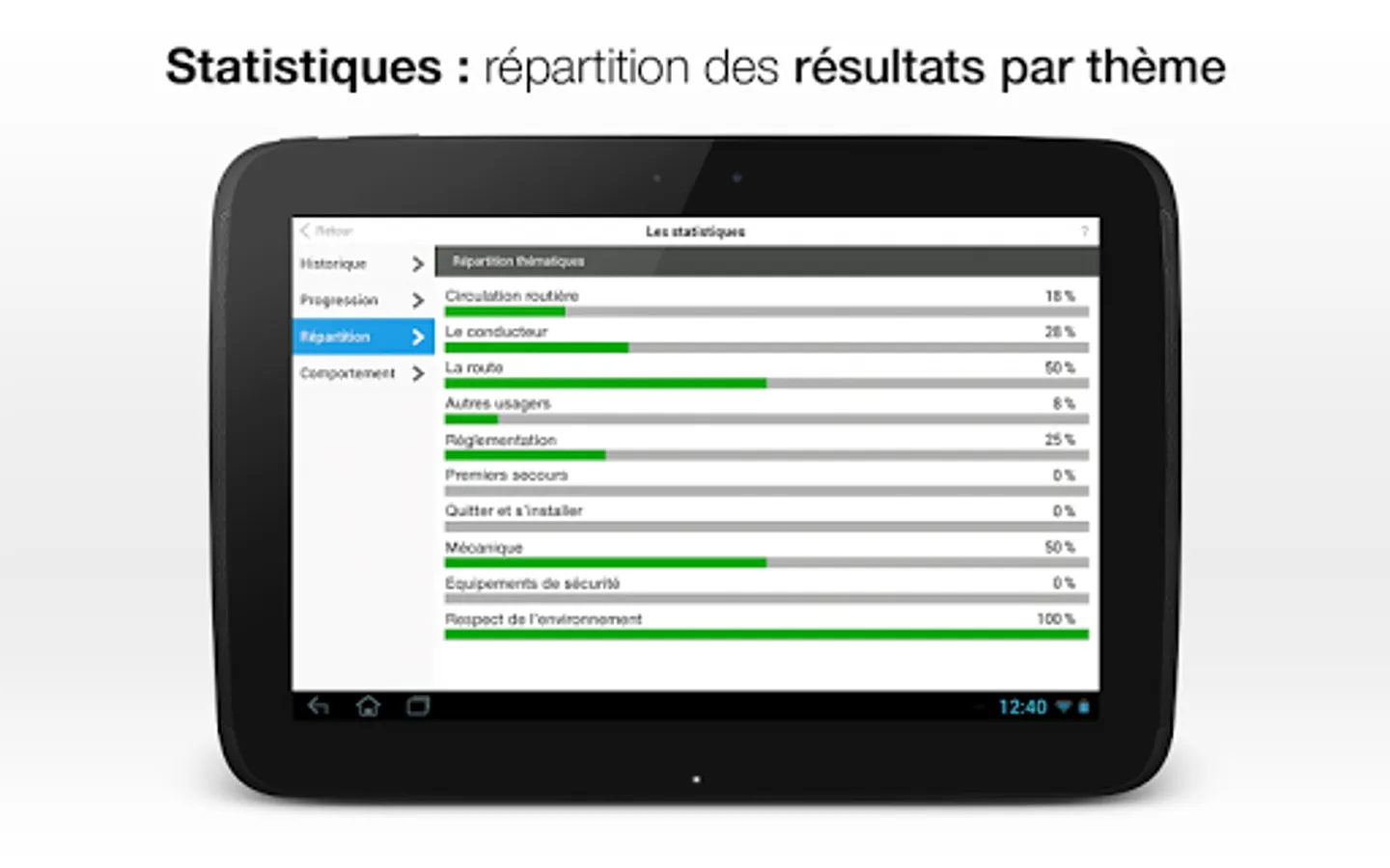 - Statistical follow-up with graphs, advice and history of the tests carried out allowing you to review your errors