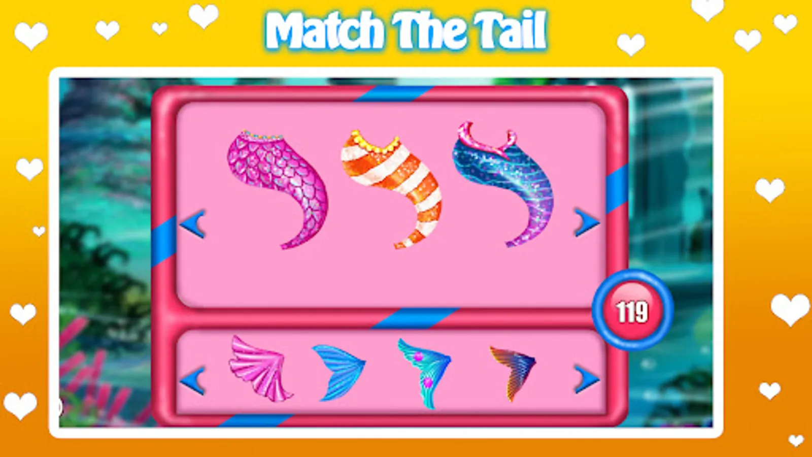 In the next level you have to complete a matching game before the dress up session. Choose a beautiful tail color and a fashion top for the mermaid to complete her look. Have fun and enjoy this new mermaid dress up game!