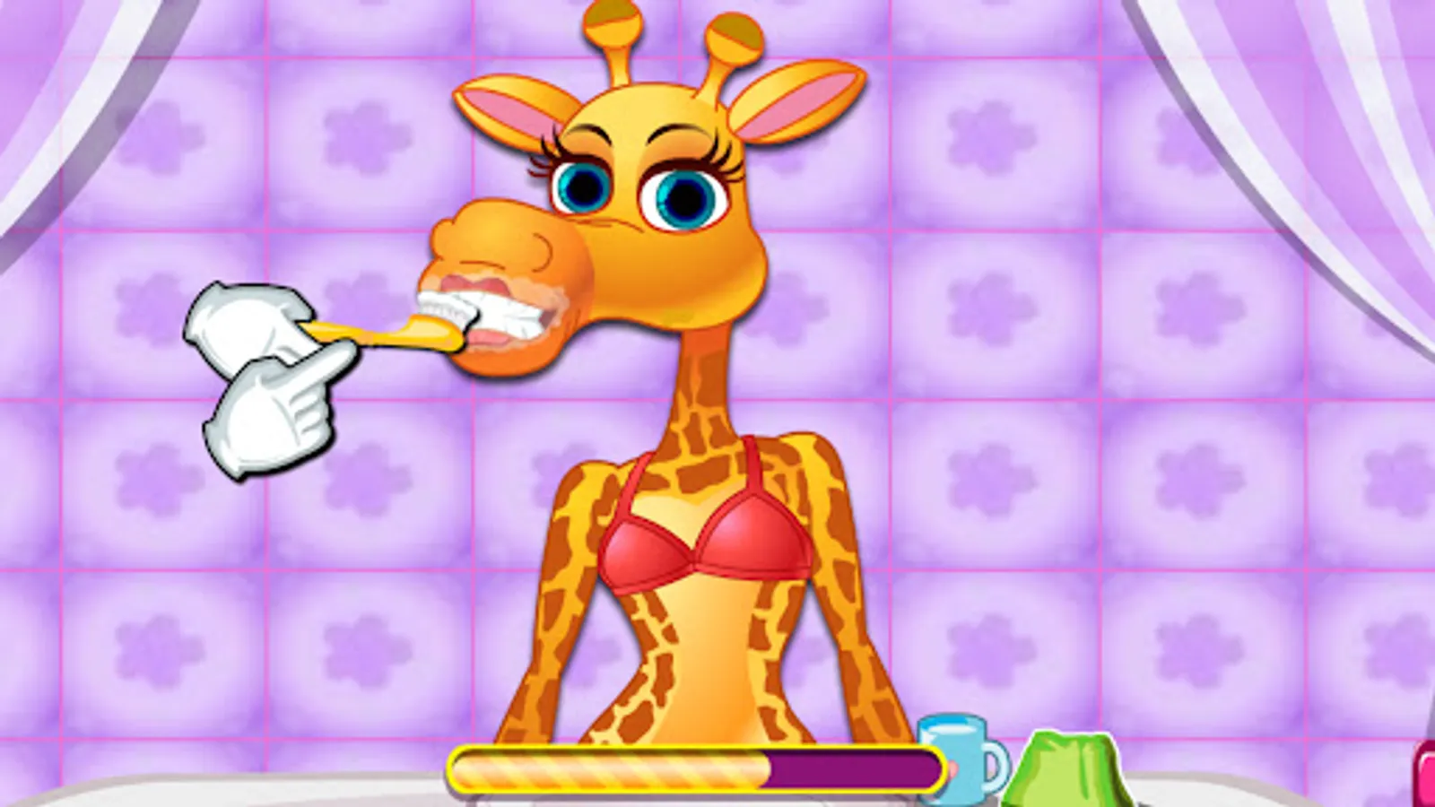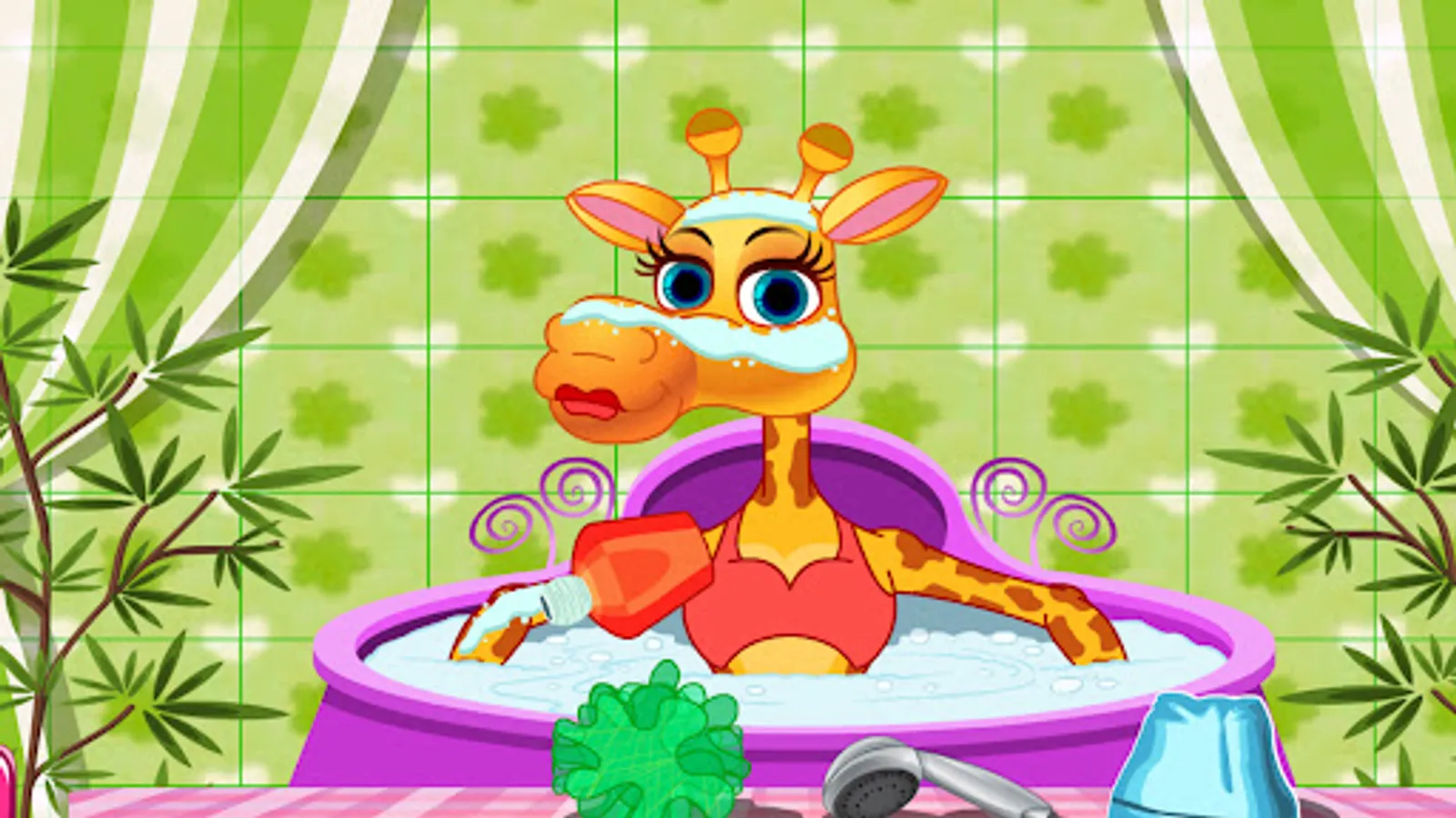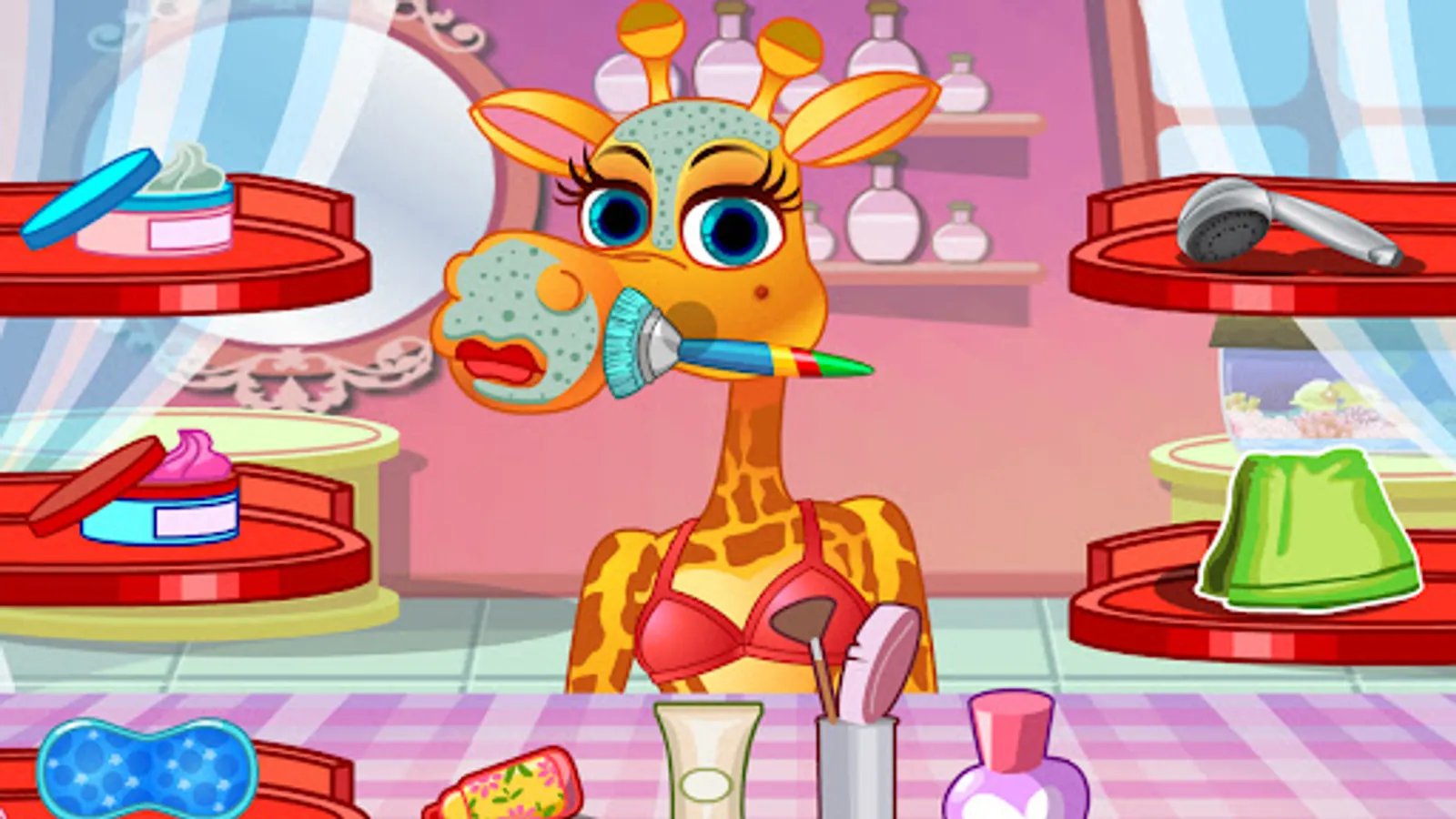 The game starts with our cute giraffe in the bath and you must help her brush her teeth. Next she wants to take a warm bath so your mission is to be there helping her with everything she needs. Next comes the bauty spa treatments for skin care. Do your best to make the giraffe look increaly beautiful. Finally you can create a new fashion style for giraffe. You can choose from a lot of clothes and accessories to make the giraffe look like a movie star.