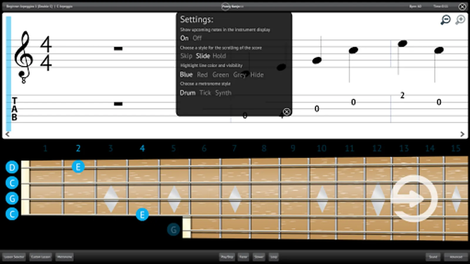 Switch between hearing the music, the metronome or a combination of both to aid your learning.