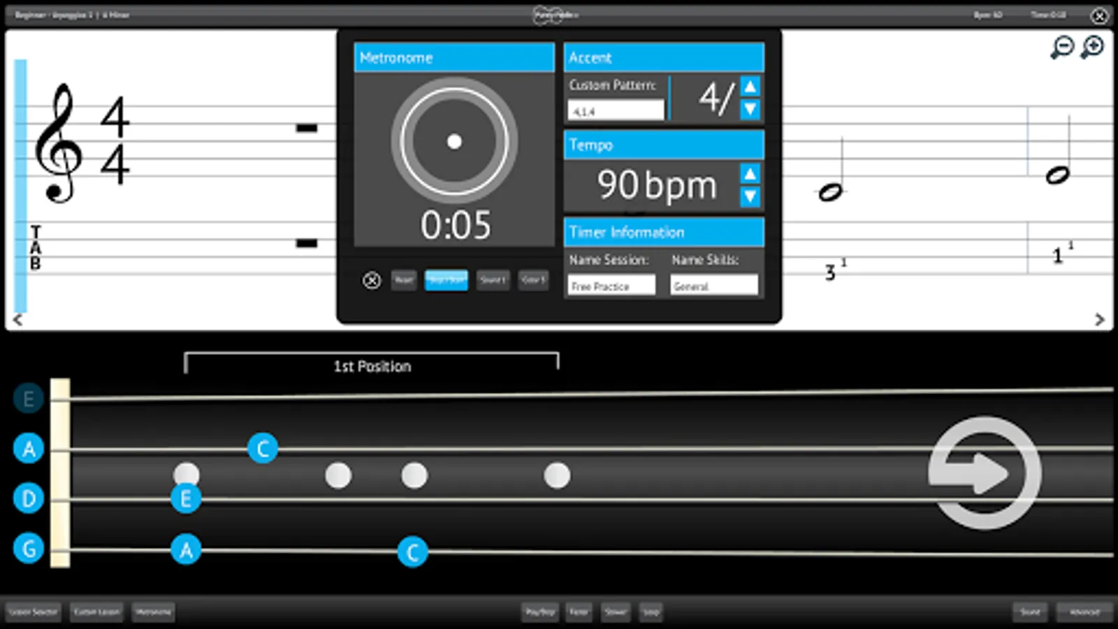 Switch between hearing the music, the metronome or a combination of both to aid your learning.