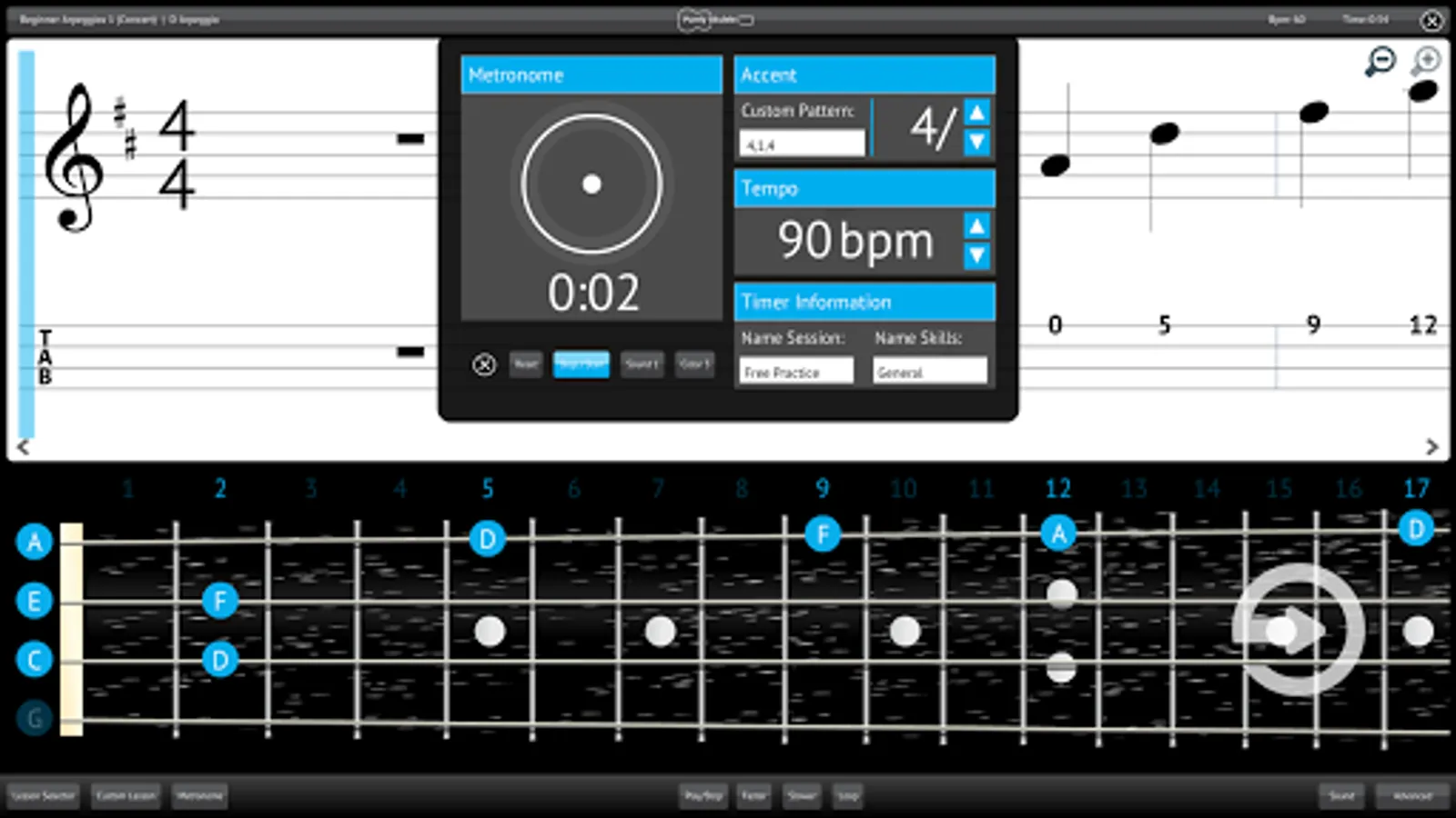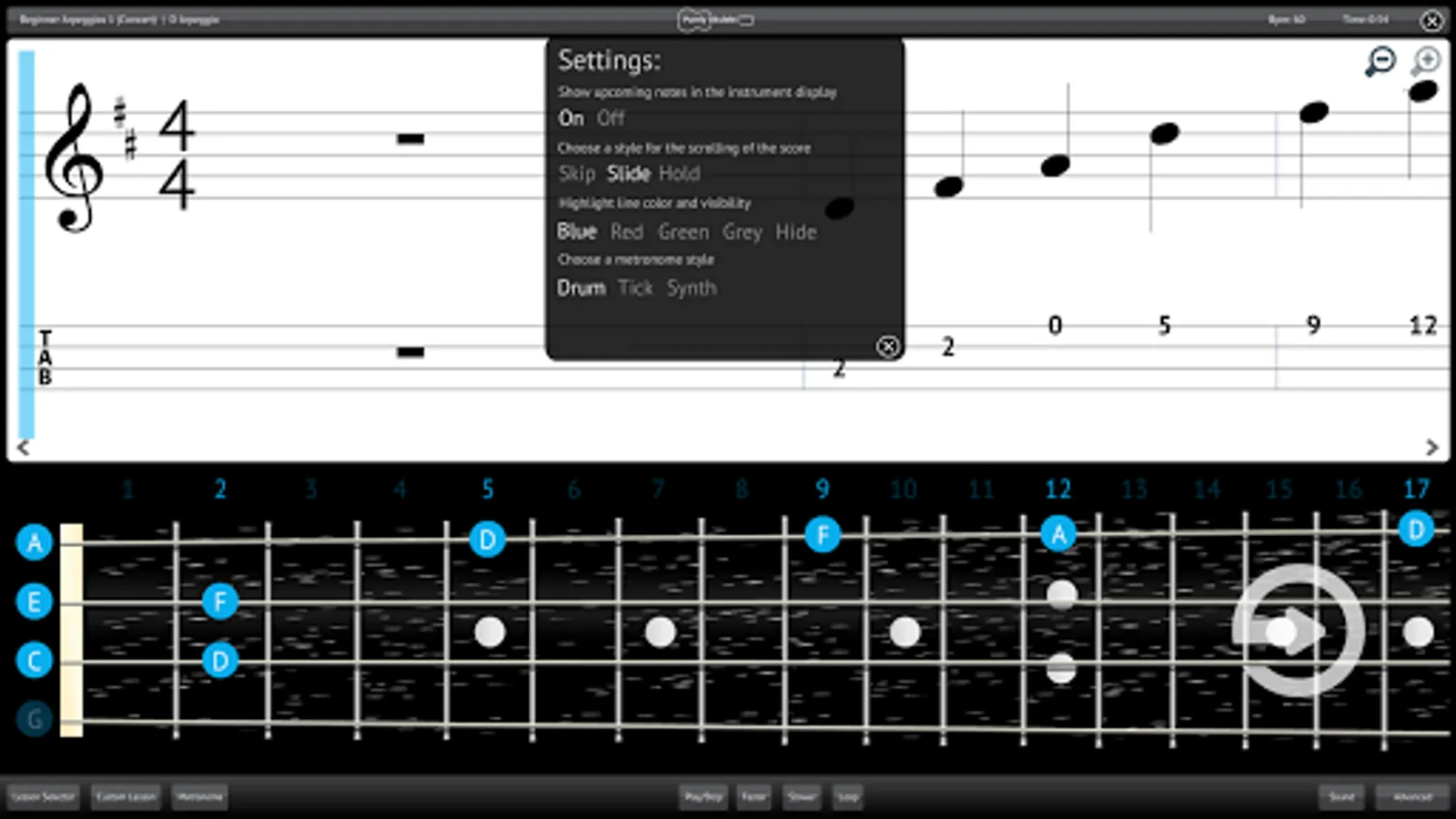 Switch between hearing the music, the metronome or a combination of both to aid your learning.
