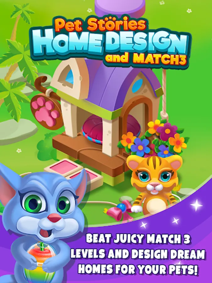 Welcome to Pet Stories: Home Design and Match3! Like swap games? Then get ready for a super journey with a bunch of lovable pets! Play through hundreds of levels in our three in a row free game. Start with tiny pet homes and upgrade them to pet palaces! Boost your Pet Team’s skills to make it the best superhero team ever!