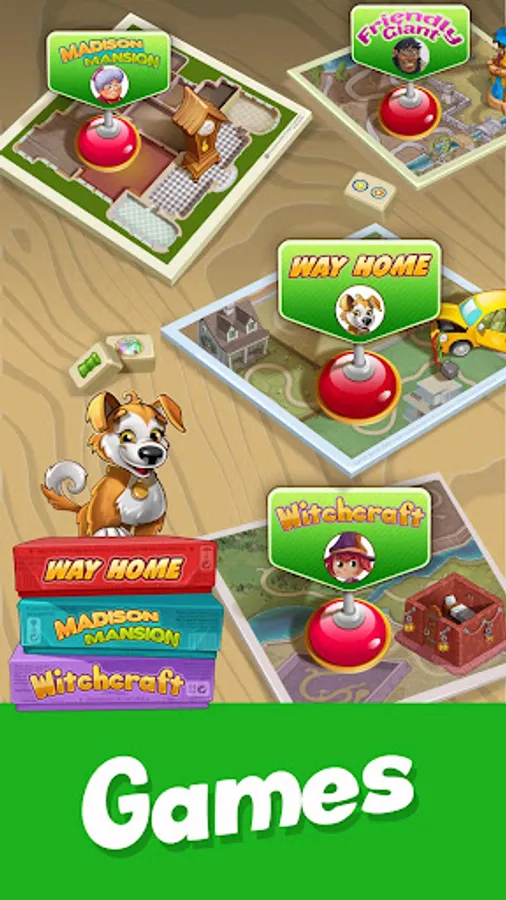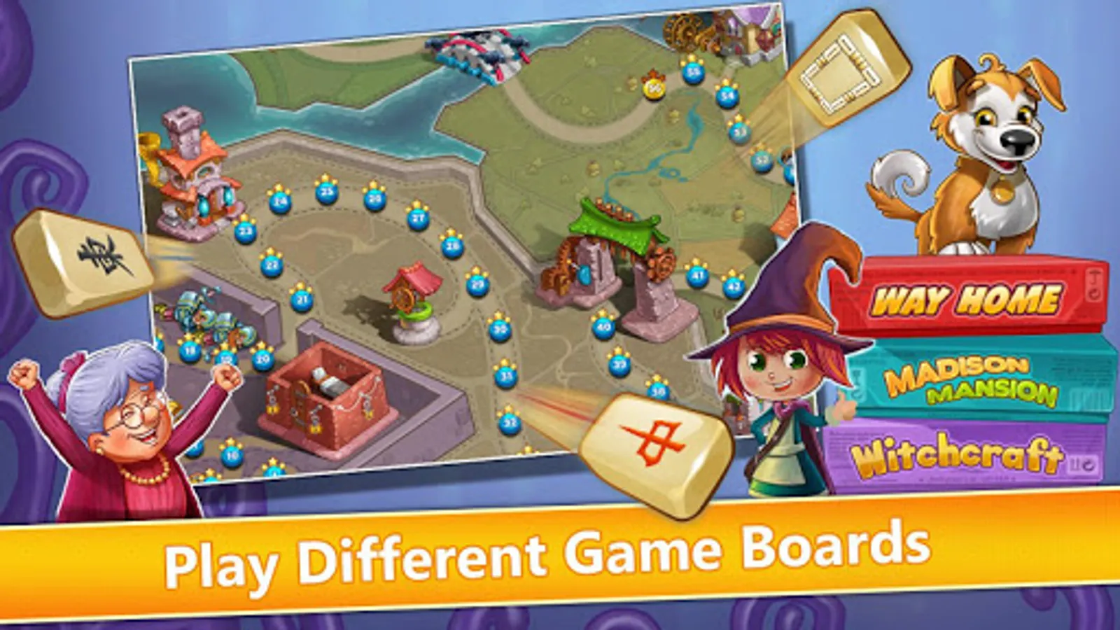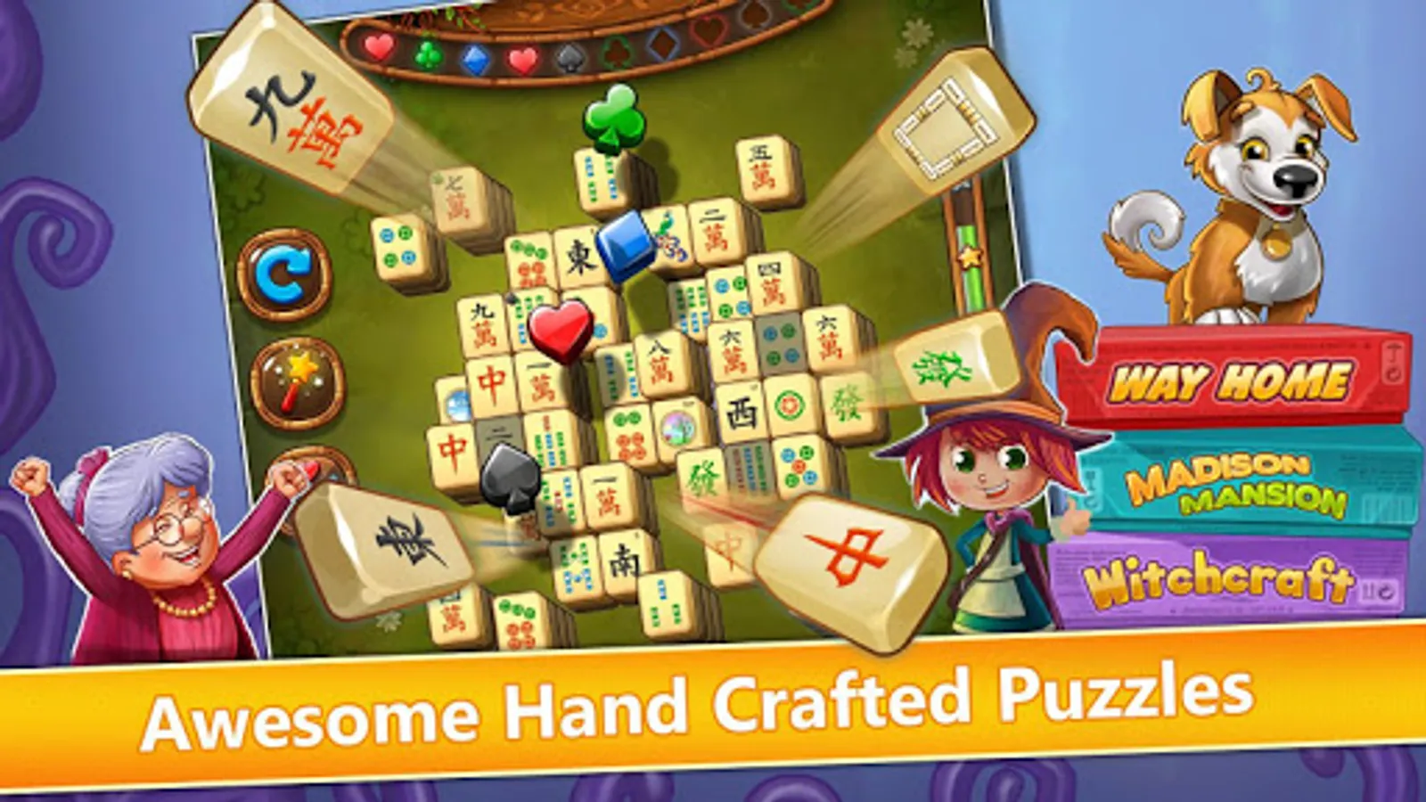 Exercise your mind with fun Mahjong puzzles in exciting magical tales! You will discover the ghost hunting Grandma, the puzzle-solving Dog, the super friendly Giant, and more!