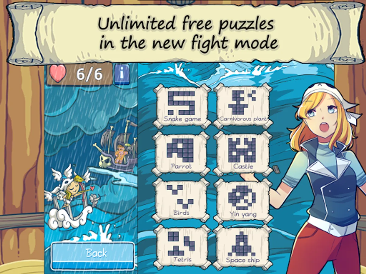 Don’t wait any longer to have fun and try out this new type of pirate puzzle adventure. If you are bored to play the typical match 3 game, then give it a try and discover picross apps. Show your ability while shooting the cannon ball and taking your inside pirate out, what are you waiting for?