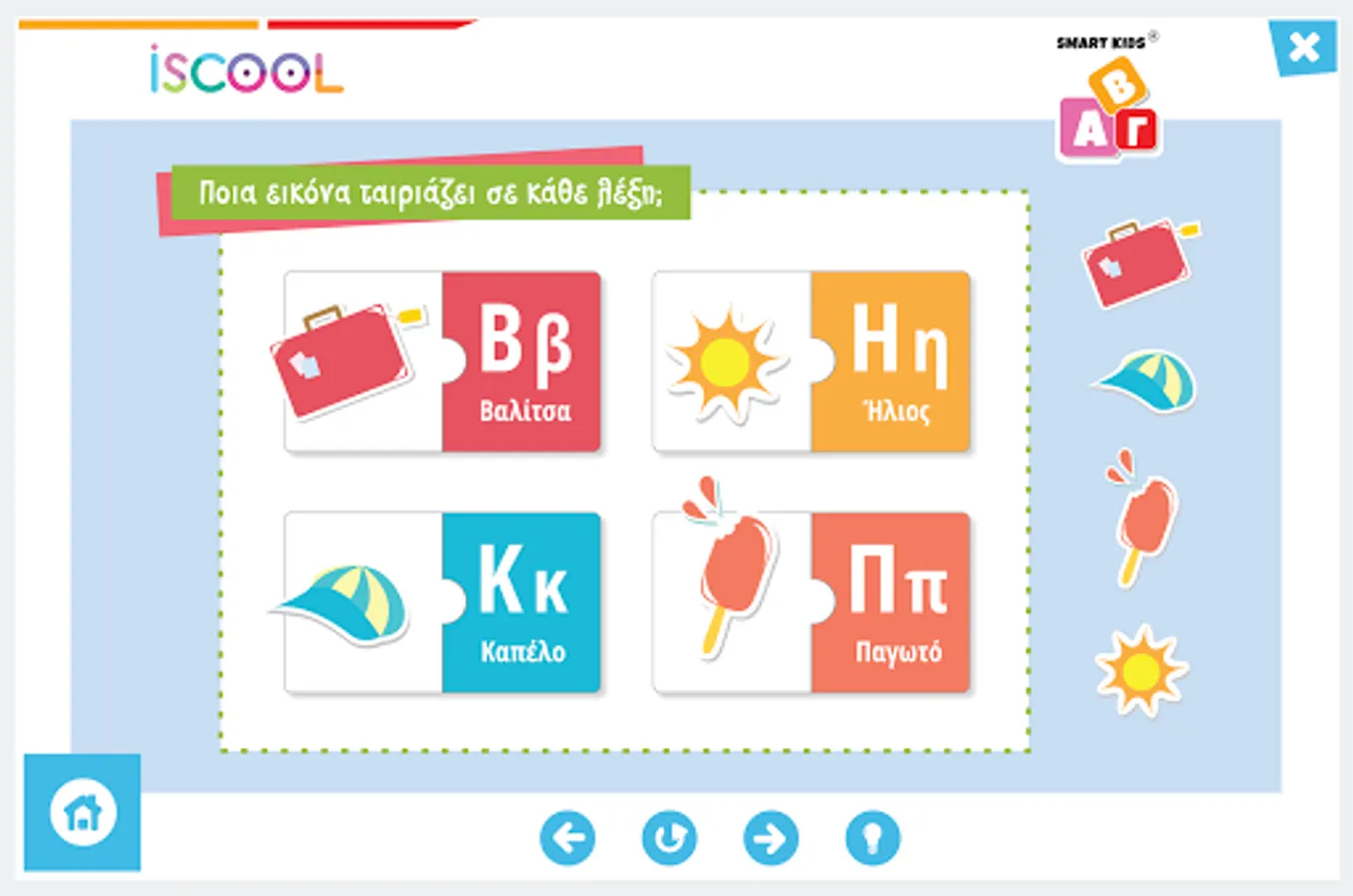 The interactive nature of the application pushes the child to be actively involved in the construction of language knowledge, thus promoting in-depth understanding and acquisition of the language system as well as its use in communication, without enhancing memory and mechanical use. The iSCOOL educational team, using innovative, developmentally appropriate techniques, has managed to meet the educational needs of every preschool student. The graded difficulty of