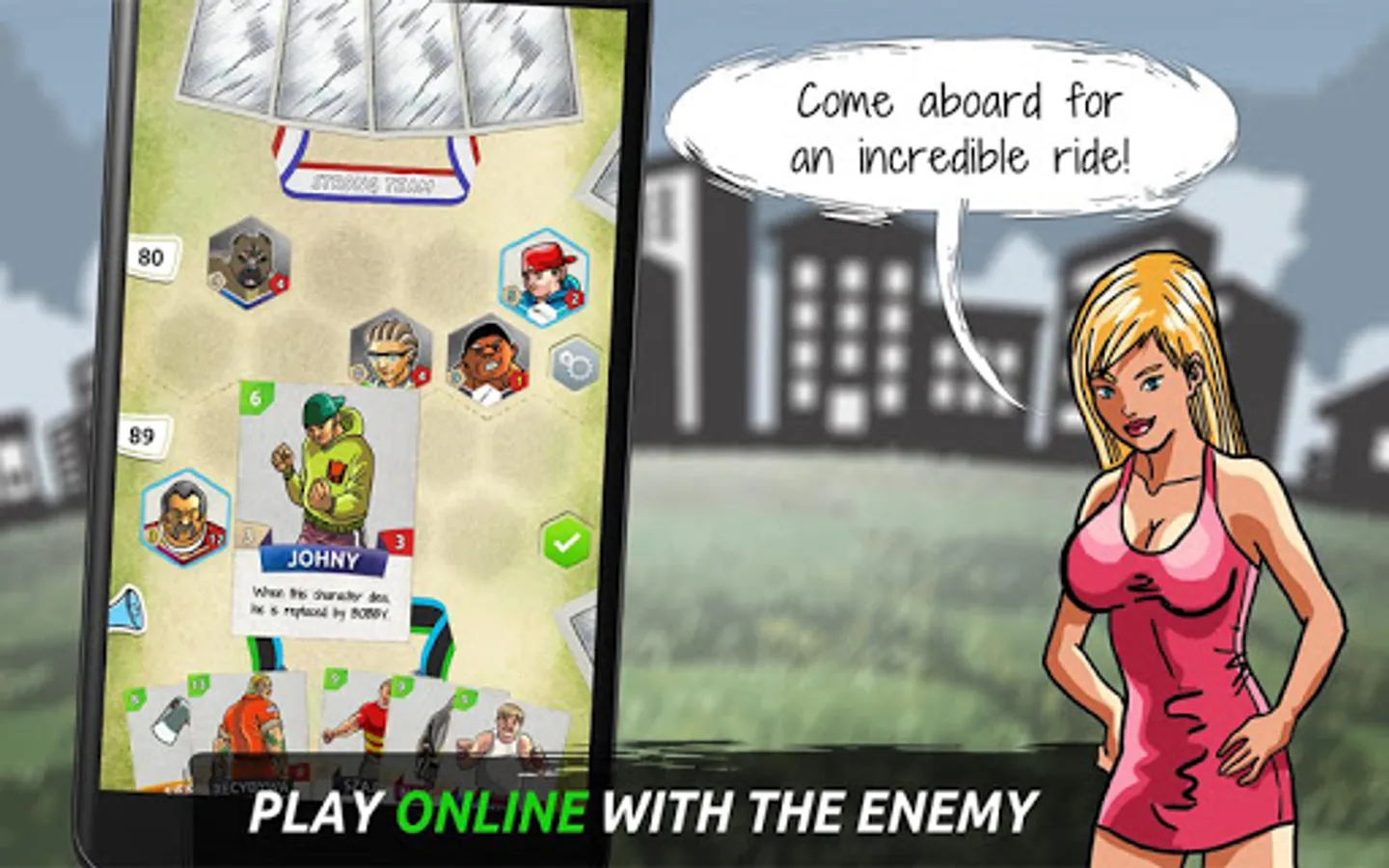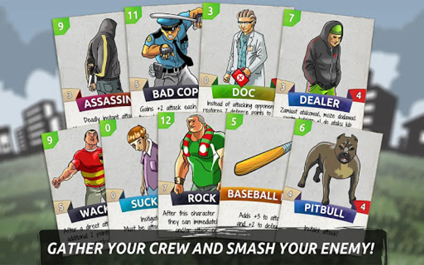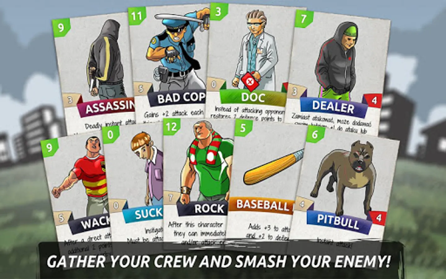 Selecting your crew (deck), you can create a unique scarf pattern identifying your gang. By winning consecutive melees you level up, which unlocks even stronger cards.