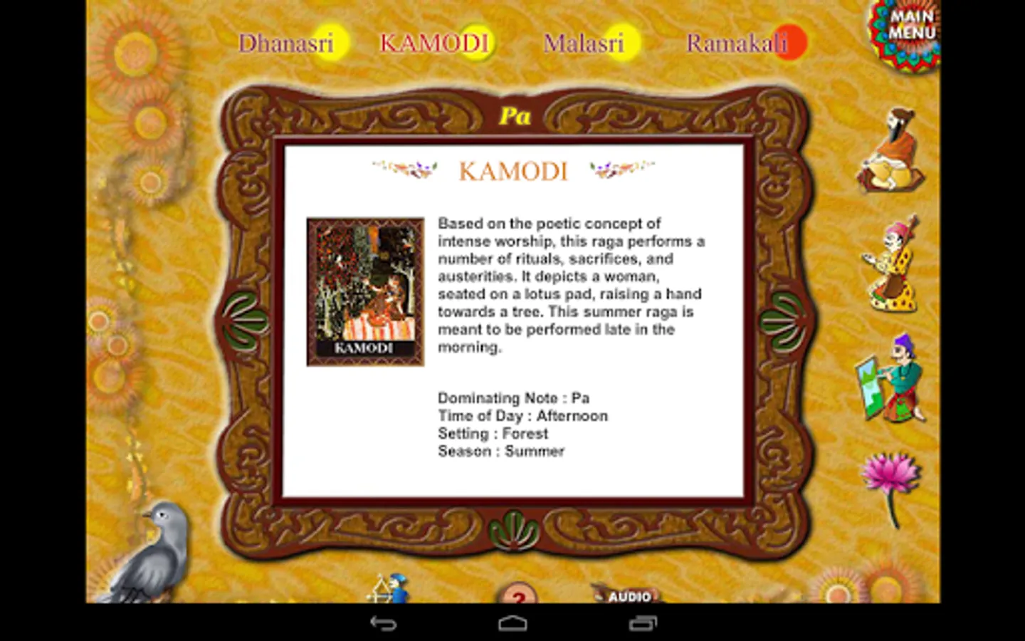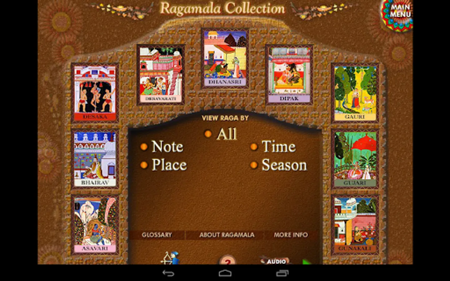 Ragamala brings the beauty of Ragas - 26 of them, their association with color, birds, animals, moods, paintings, poetry and music all in one package. The app has three modules for you to explore for all the 26 Ragas. Musician Module: This introduces you to the basics of Ragas in a simple manner. The Scale (Aroha) and the Theme (Pakad) is presented in an elegant way for both musicians and music lovers. Each raga is played by flute and guitar. You can also listen to popular songs based on the raga. Poet Module: Here you can choose a theme for your poem. As you choose different elements for the poem you will create both a unique poem and also a painting of the elements you have chosen Browser Module: Here you can browse paintings by note, place time or season. You will see the painting and the information about the same.