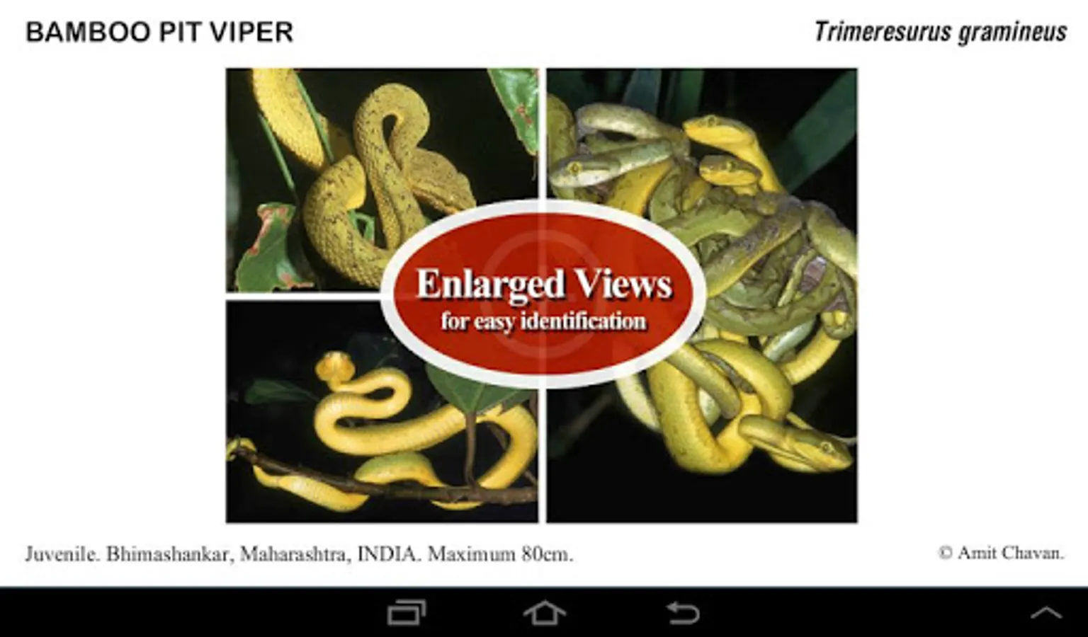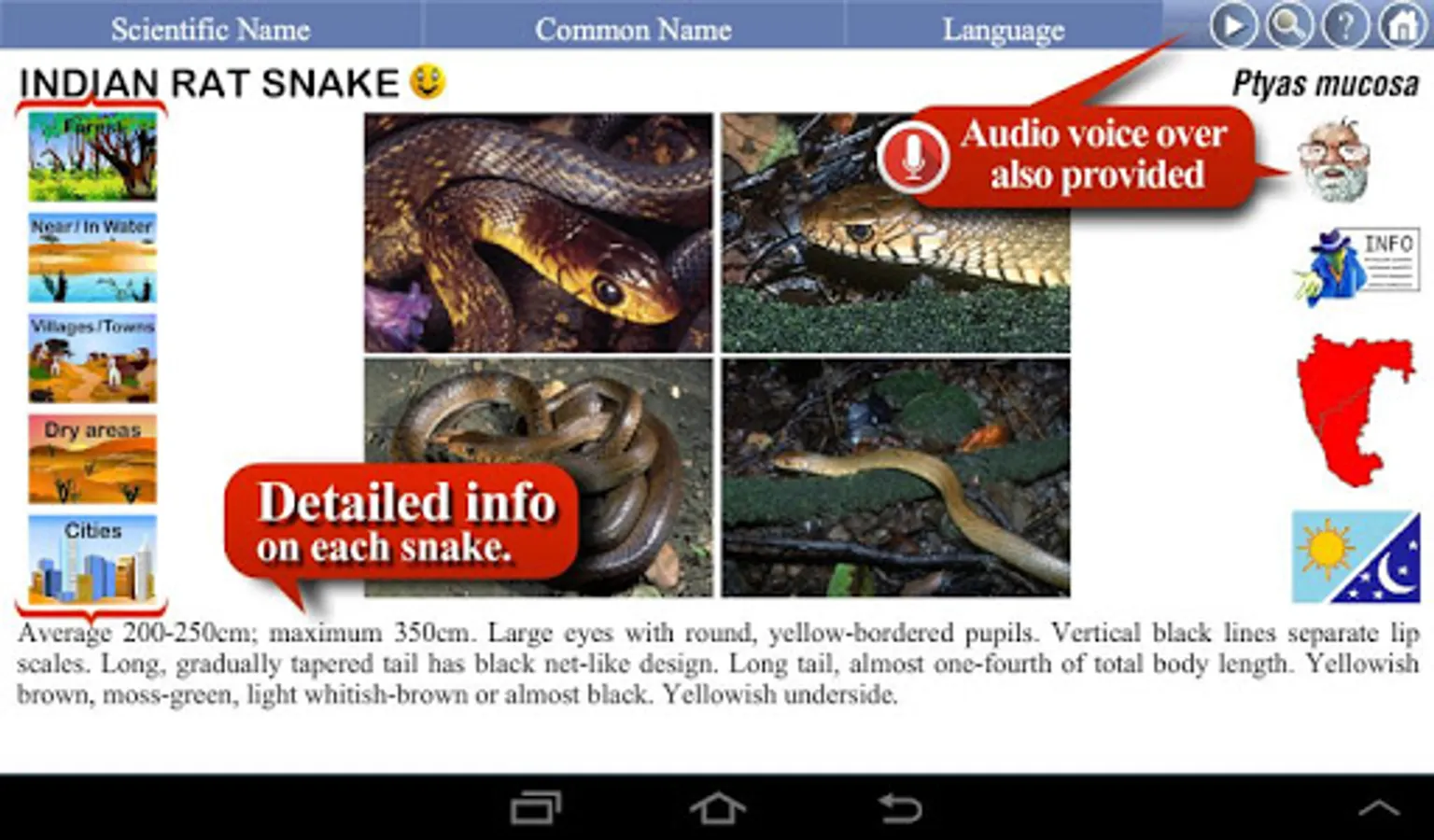 Snakes of India is an authoritative guide covering snakes of Goa, Karnataka and Maharashtra. The app provides a good understanding of these much maligned creatures with insights into their habitat, color variations, markings and distribution.