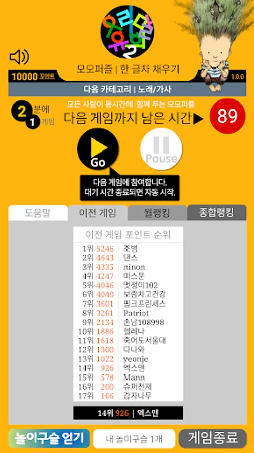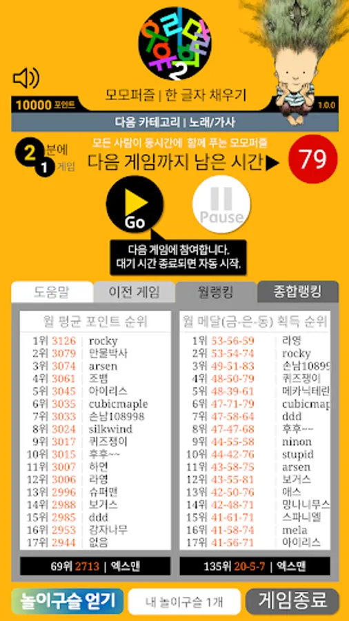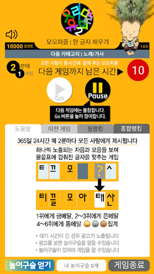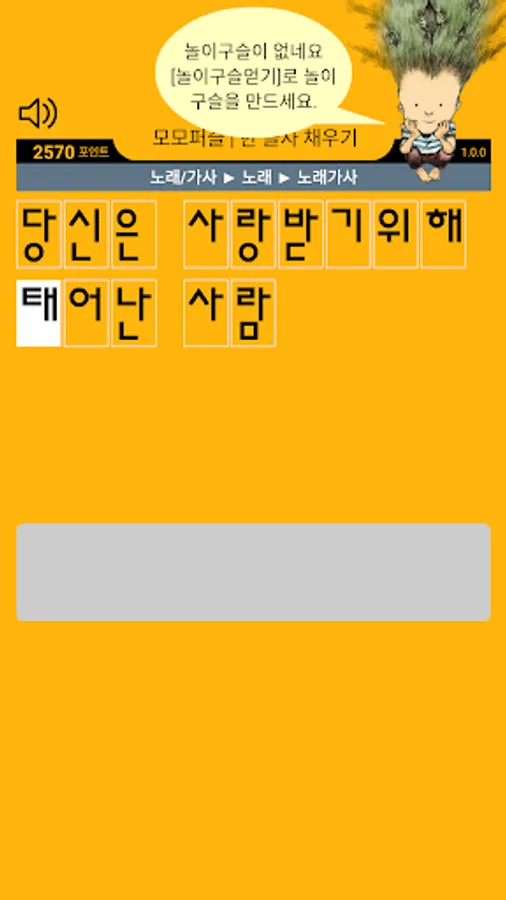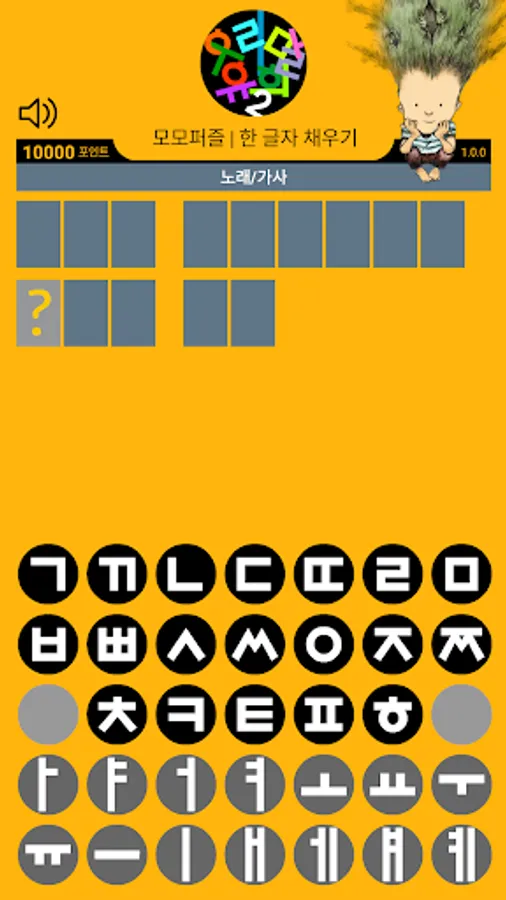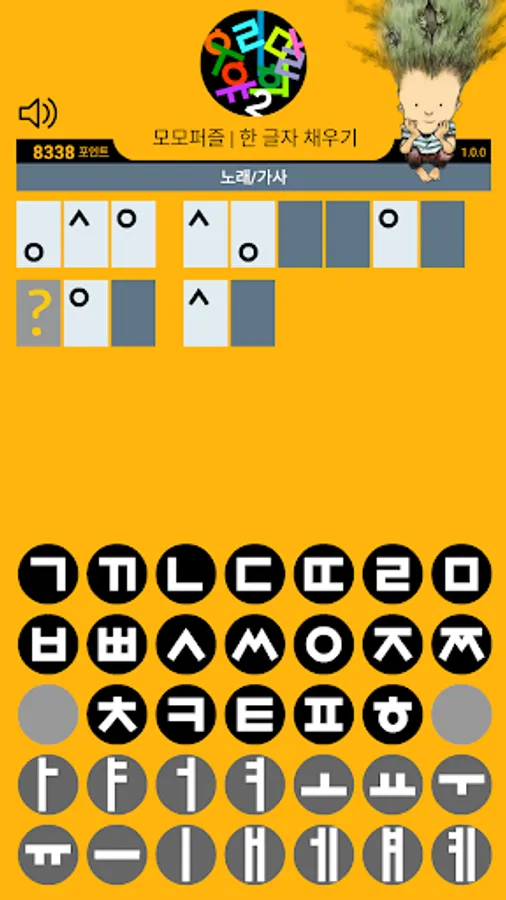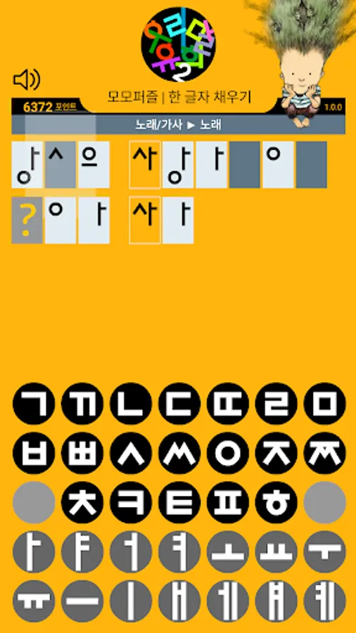 A game in which one letter is hidden when a consonant and a vowel of familiar phrases (poetry, lyrics, proverb, movie, etc.) are exposed 24 hours a day, 365 days a year. A game that helps you sense language, turn your brain and improve your knowledge.