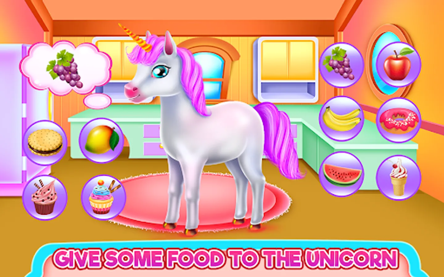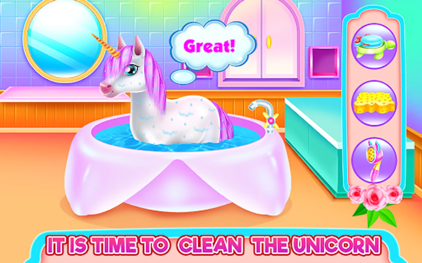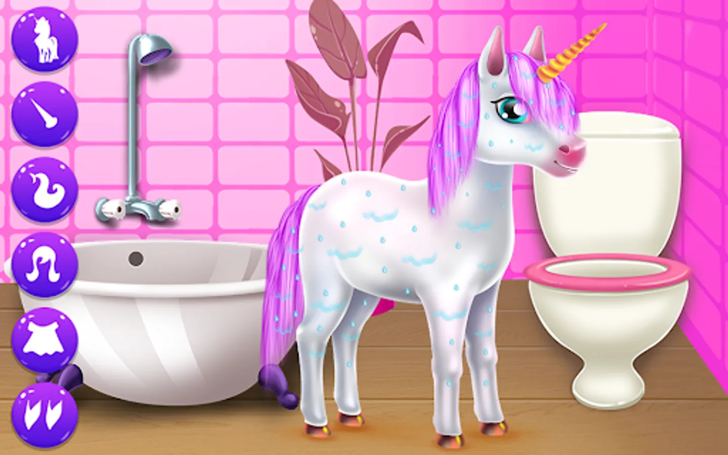 There's a great way to test your abilities as a caretaker and that is by playing our new unicorn game, in which you will definitely have a lot of fun. Not only that you get to nurse him, but you will try something in the kitchen and in the hairstyling area. First of all, you will start the game with a little pampering. Give him a bubble bath and make sure you clean his dirty hair. After the washing, you must take the unicorn to the hair salon where you will combine natural ingredients to create a special mask. Apply it and then refresh his main color. You might also want to cut the extra hair and arrange it with a suitable hair device. Now that he is all dolled up is time for cooking. Get the dough for cupcake done and decorate it with colorful details. Feed him and fulfill his wishes when it comes to food. Now you don't have to be shy when it comes to dressing up. So, add bold colors and make this unicorn a fashion item. Combine the wardrobe we have and assemble a lovely outfit that will highlight the cool hairstyle he just got. Use your creativity and add pretty accessories to complete this vogue look of the unicorn. Do your best to accomplish all the given responsibilities and have fun by learning how to take care of a sweet animal.