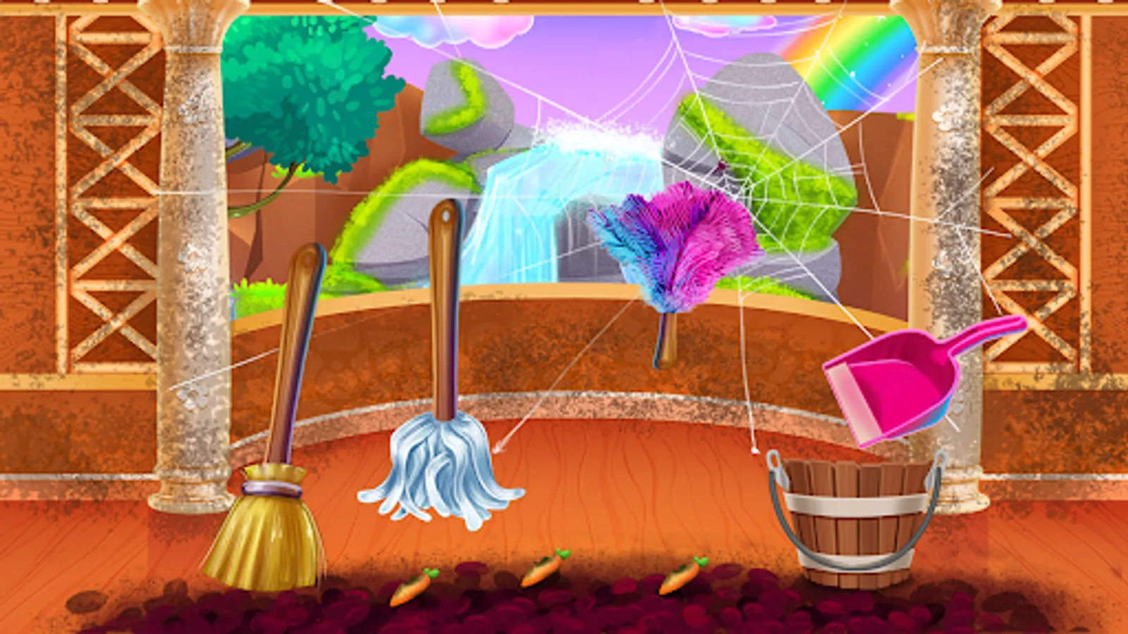 You must try our new unicorn game where you are closer to the rainbow than you ever were. Find the challenges that come within the game and complete all levels. Take good care of your lovely rainbow pet and make sure you fulfill his needs and wishes. Clean the unicorn and wash his body using the special shampoo, also you will have to handle his mane and tail. After you rub all the dirt away you will get him to see a doctor regarding his health. Do a medical check-up and find whatever is hurting him and make it stop. Use the proper treatment and get him better. Once this procedure is over you will take him to the farrier so his hooves can be changed. There are specialized tools that must be used in order to succeed. Replace the old and used hooves and help your unicorn walk again without any pain in his legs. After all this, you have to pamper your pet with a spa session. Apply facial treatments and make his skin glow. Groom him and add some cute makeup to complete his look. Now you will have to pick a proper outfit to match his face makeover. Put on pretty stickers, choose his mane color, and mix it with his corn. Use playful details to make your pet look like a rainbow unicorn. Don't forget about the feeding part where you have to play an interactive game to catch some apples so you could serve him. Get the stable ready for him by cleaning and redesigning it. Use your style to create something different, but also modern. All that left is to get into running where your animal will be able to run free in many maps and lands. Help him collect the apple points and finish the game.