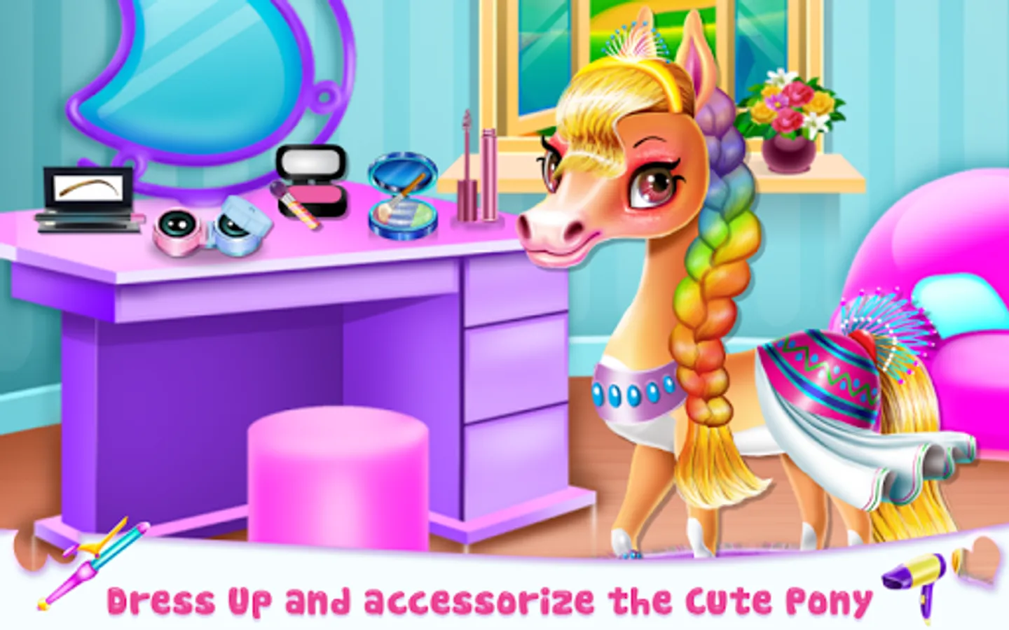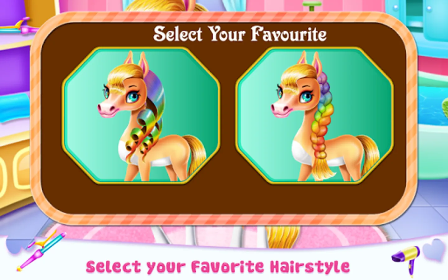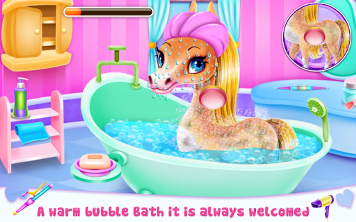 As a pony your aspect matter more than anything, but we all know when you are out playing and having fun you might forget about it for a while. And this is what just happen in this animal game with this little pony and now that the royal party is coming, he needs all the help he can get to make his aspect lovable again. Put all your talent together and try to find a way to give this little horse a pampering day and a refreshing outfit that would make him be more confident and cute. Clean him and make sure you use appropriate products for each part of his body. Brush him and give his hair glow again using professional caring shampoos, masks and hair sprays. The hair salon step comes right after the spa one and you could easily move from one to another enjoying the special treatment you give.