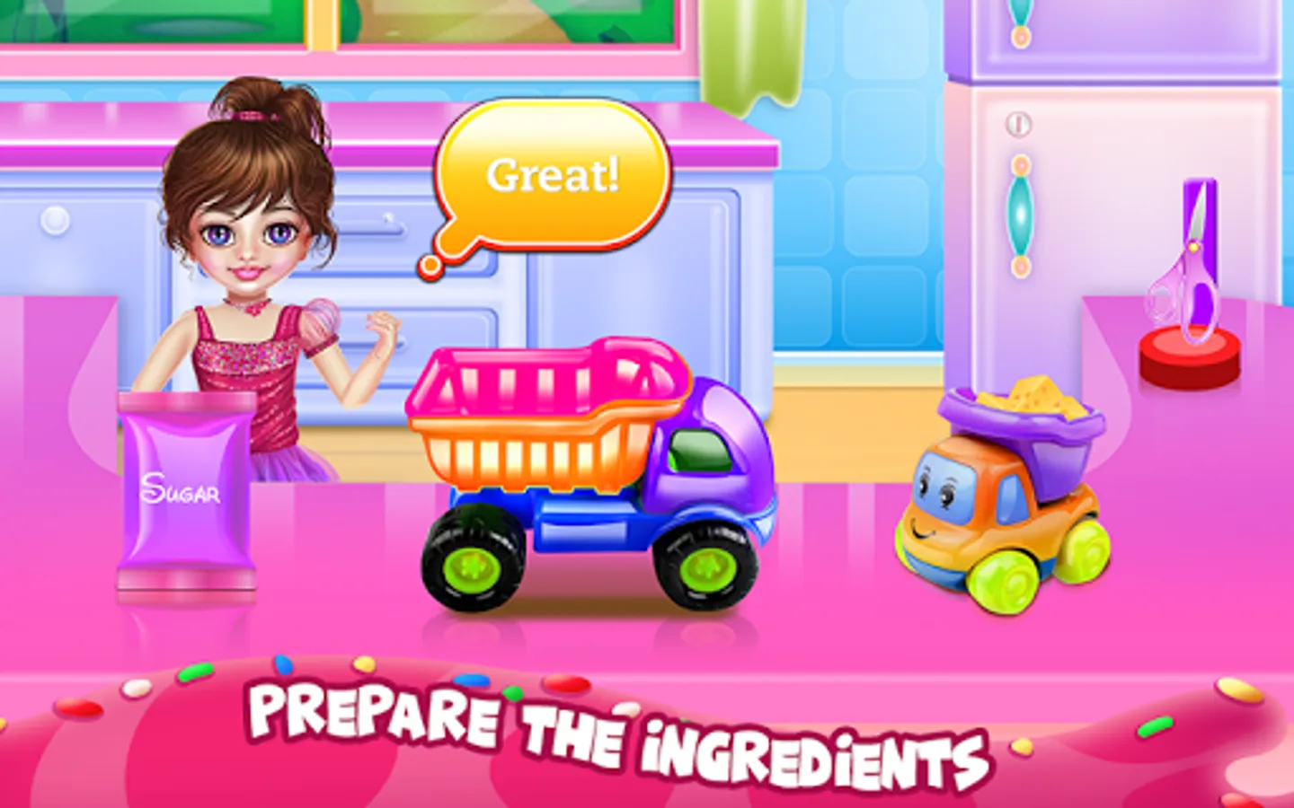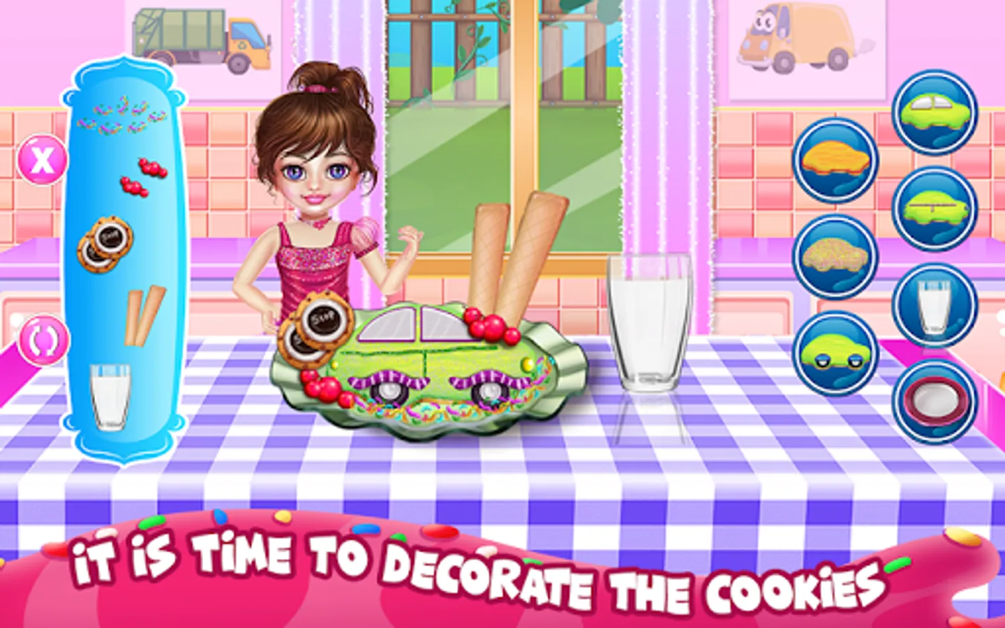 Play our new cooking game where you will try to infuse the art of cooking with your favorite hobby, the trucks. Follow our recipe for these sugar cookies shaped as trucks and have a good time. In order to respect your recipe, you must purchase the required items from different areas in the shop. Your first mission will be to join our little baker to the supermarket where you will supply all of the ingredients from your list. Search for the proper things in the shop and make sure you won't leave without paying for them. Move to the kitchen and then grab a big bowl, that is actually a truck with a usable container, in which your dough for the cookies is about to be made. Step by step you will be taught how to use each tool and ingredient for your recipe. The butter, the eggs, the sugar, the baking powder, the flour, and the vanilla extract will go together in order to be blended. Smooth the composition and move to the step where you will give a special shape to that cookie dough. Use the truck shapes from the tray to lay down the mixture and place it in each of those three. Next, you will add the tray into the oven where the baking process begins and where the cookies start their magic. When these yummy sweets are roasted take them out to decorate all of them. Use your creativity and don't forget that you are designing homemade sugar cookies with an interesting car and truck shape. You might consider adding a colorful decoration to make the truck look more real. Use the given details and assemble a delicious appetizing dessert.