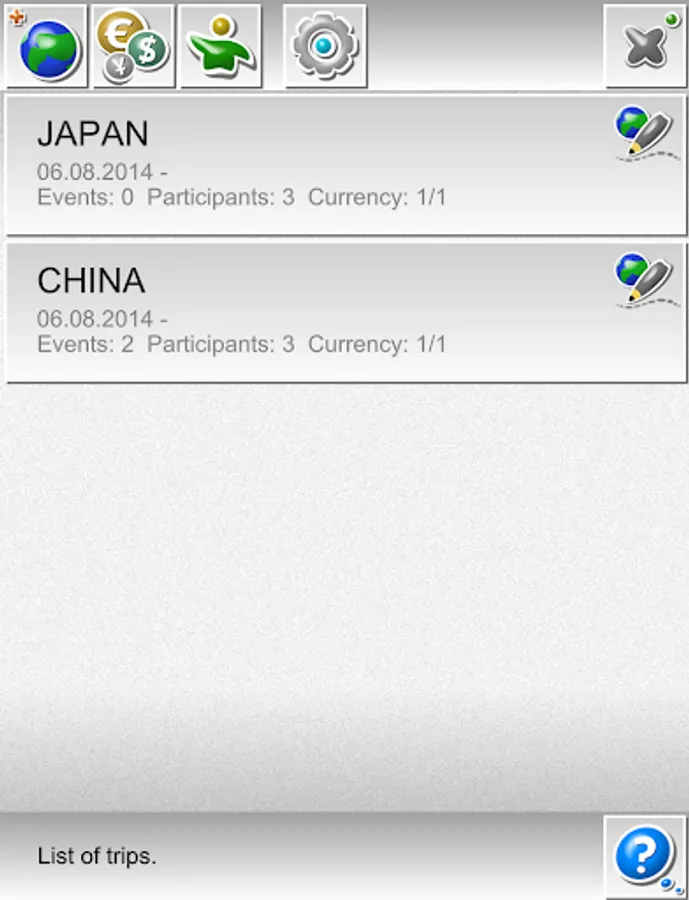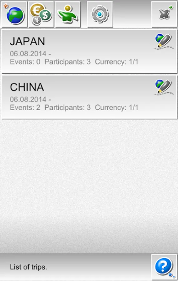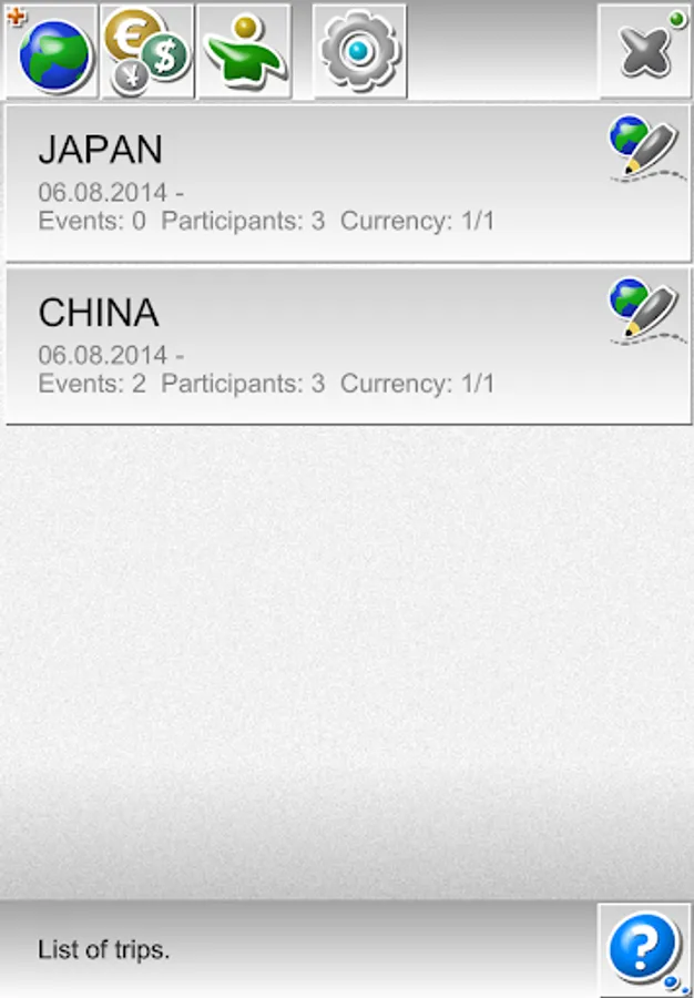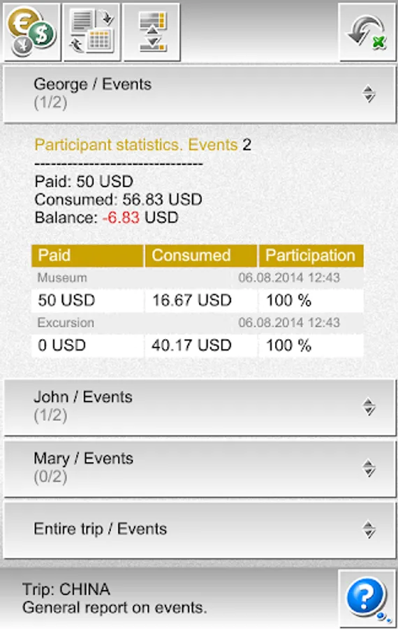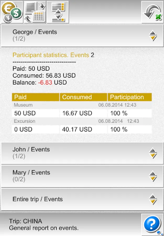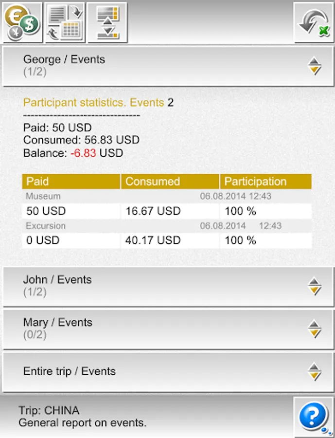 - A list of events on the trip with a record of participants, their expenses and different types of use