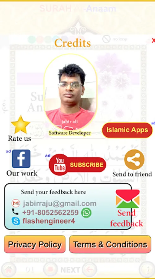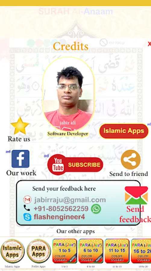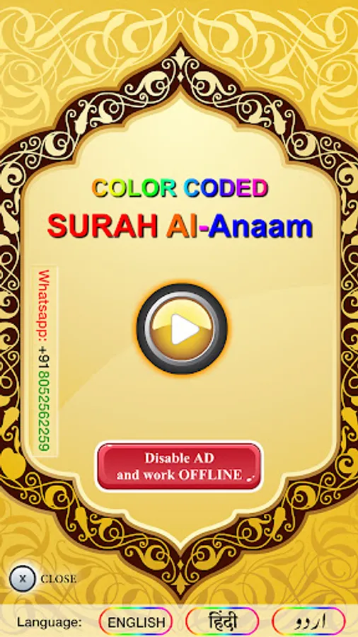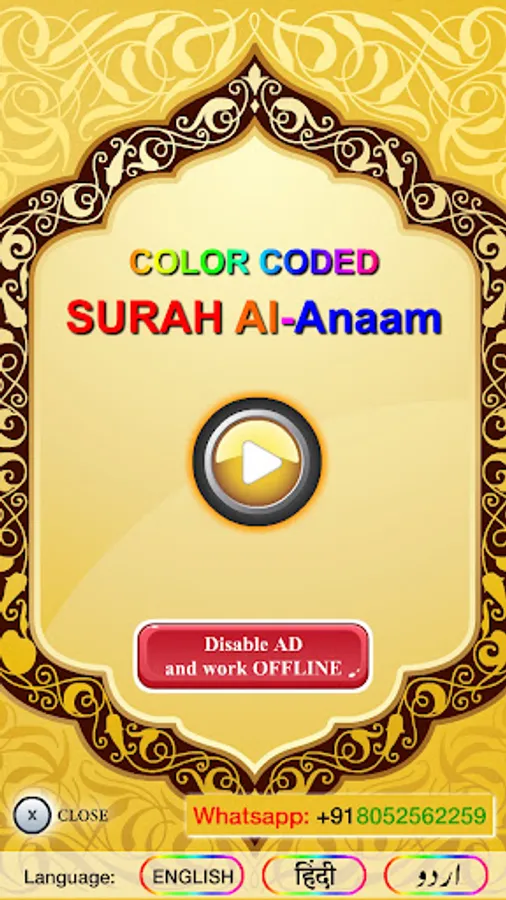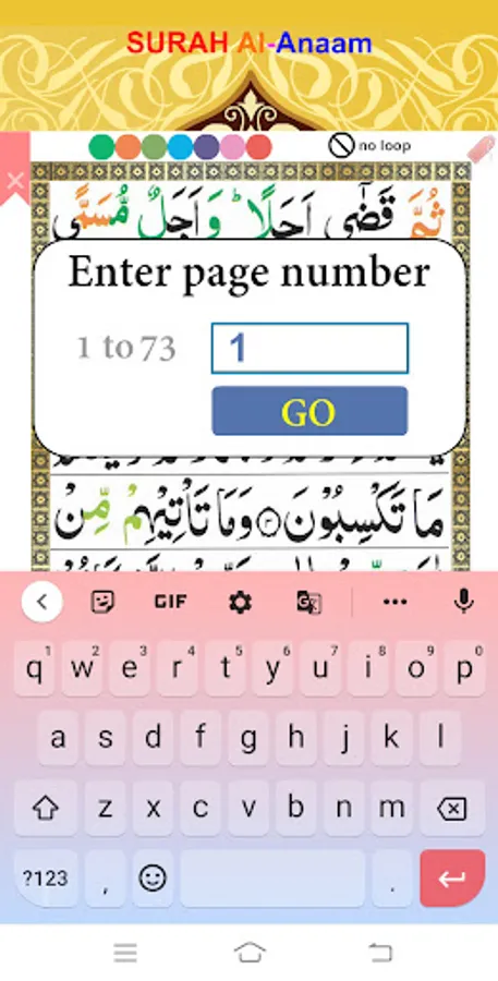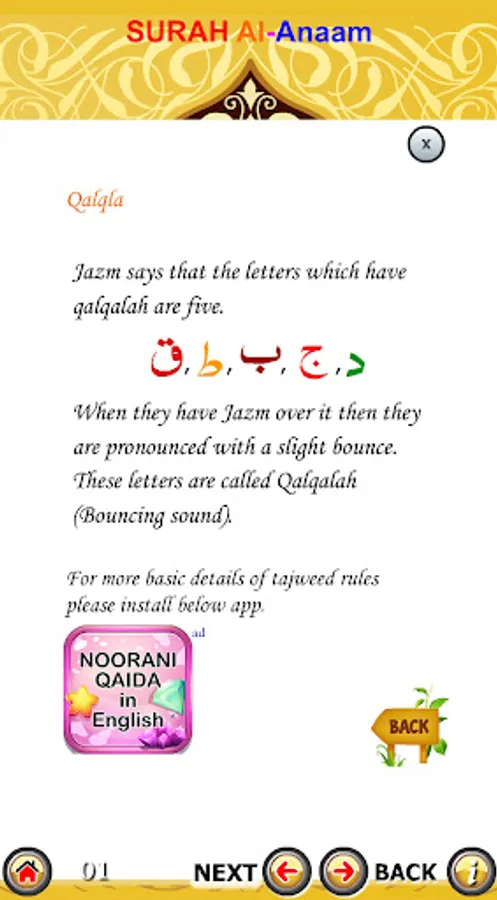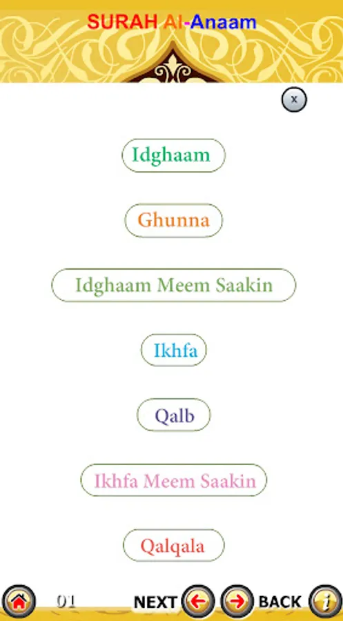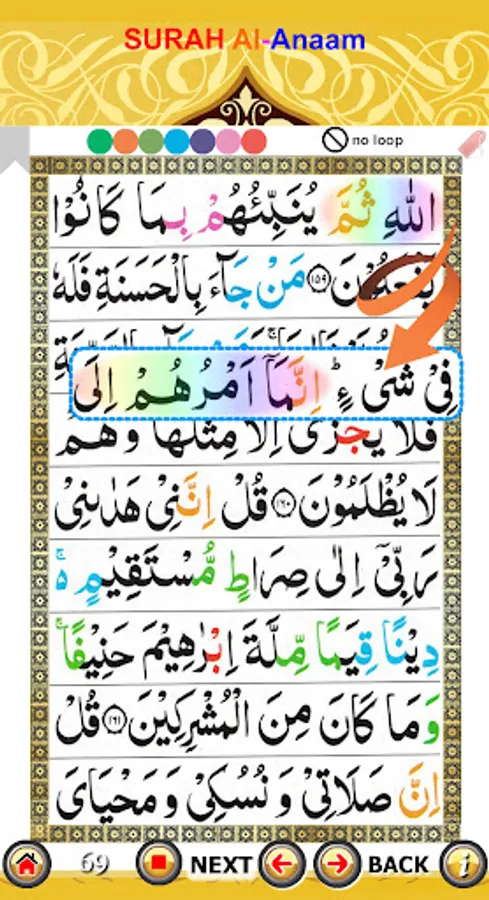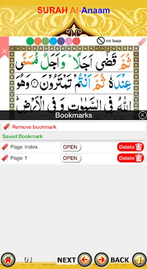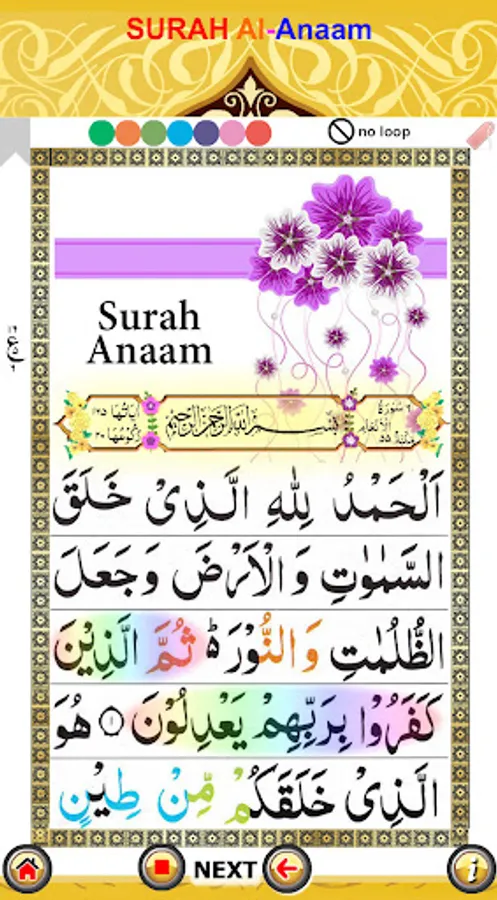 It contains Surah Al-Anaam with Audio in color coded Arabic text.