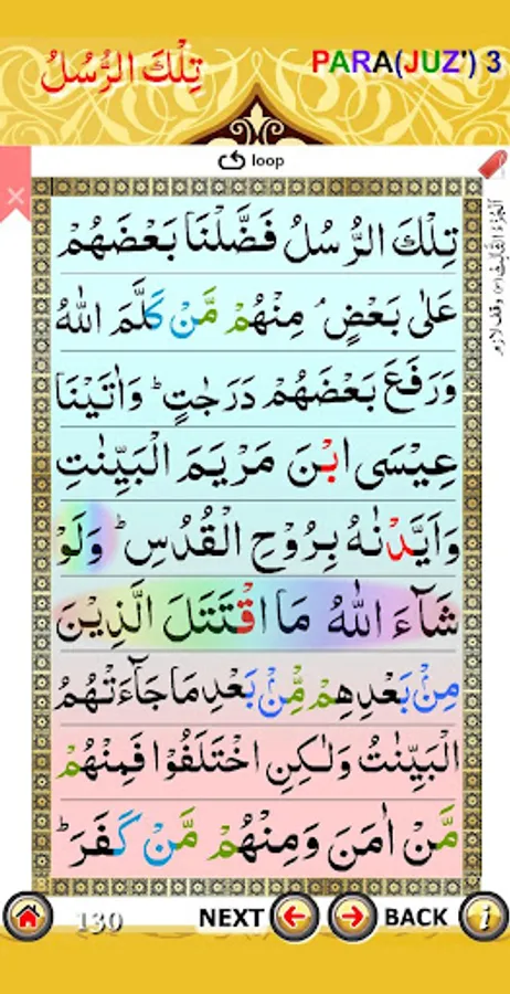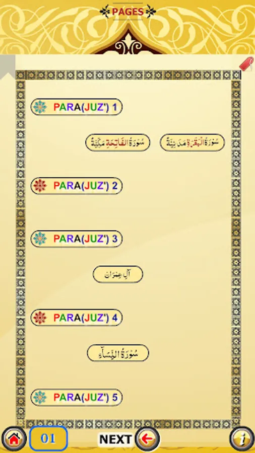 Alif laam meem (الٓمٓ) Quran Para 1(Juz' 1), Sayaqool ( سَيَقُولُ) Para 2(Juz' 2), Tilka Rusull (تِلْكَ الرُّسُلُ) Para 3(Juz' 3), Lan tanalu (لَنْ تَنَالُوا) Para 4(Juz' 4) and Wal Mohsanat (وَالْمُحْصَنَاتُ) Para 5(Juz' 5) are Quran chapters with Good looking style in mode.