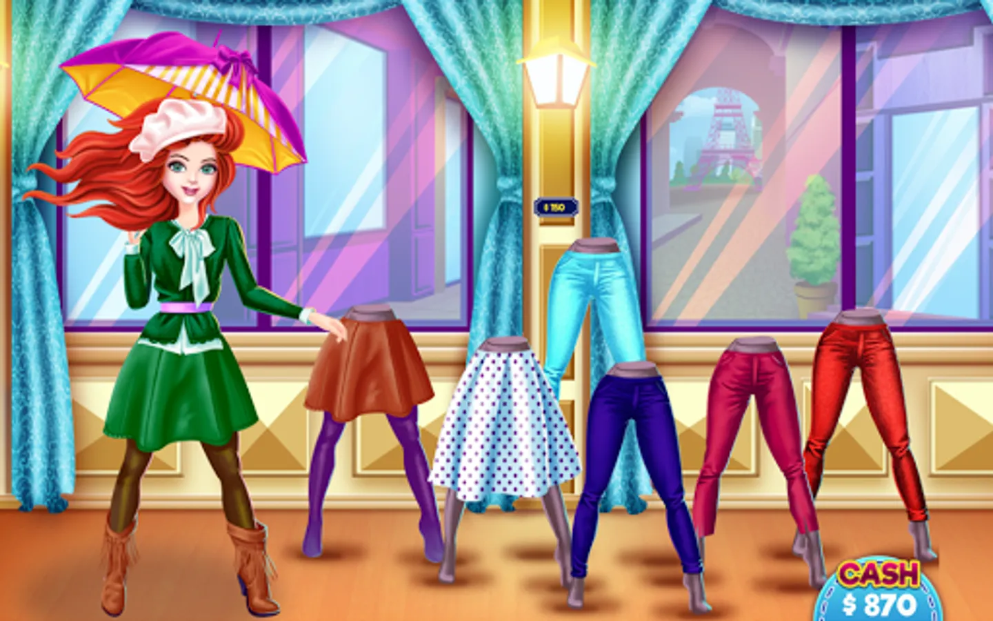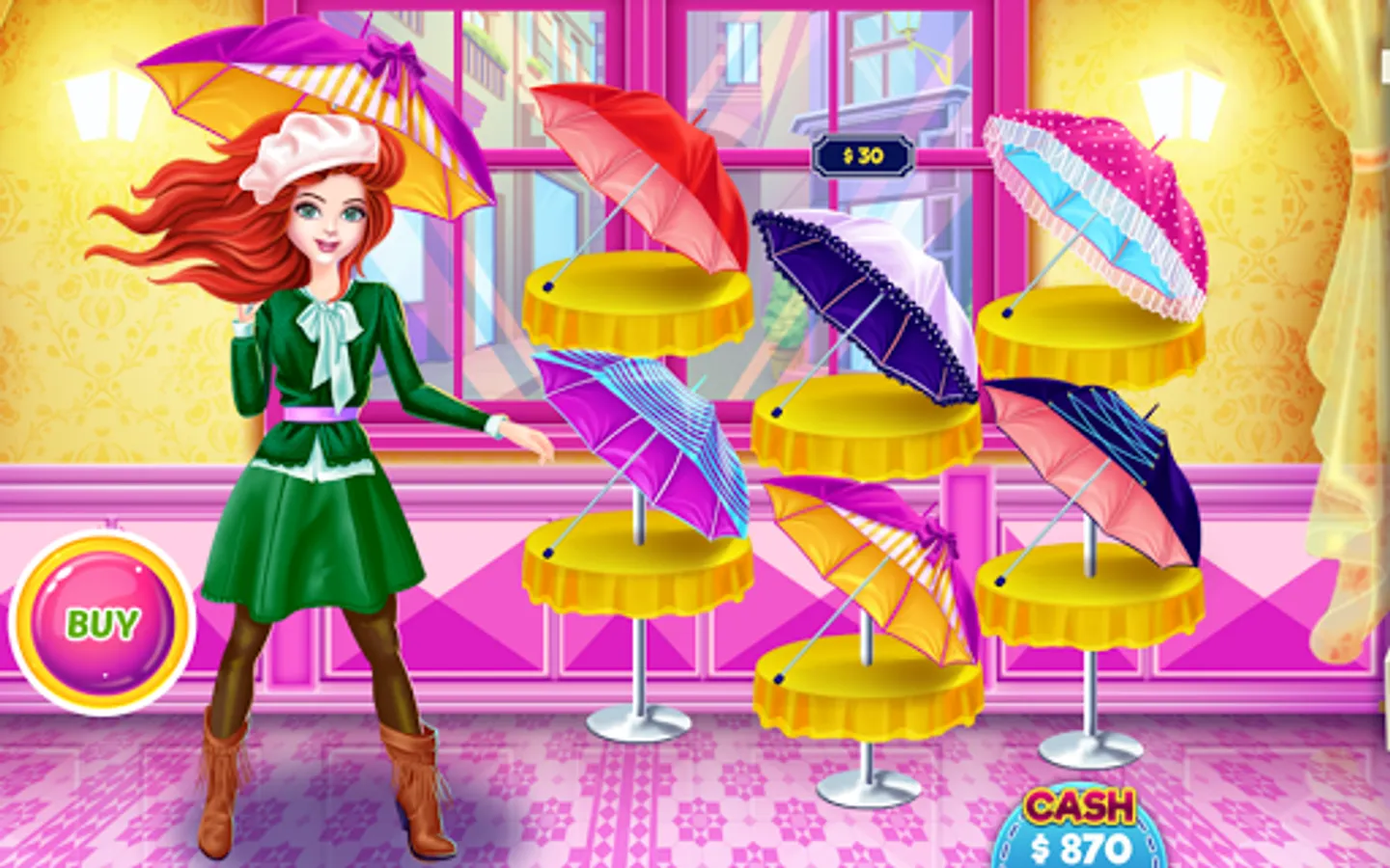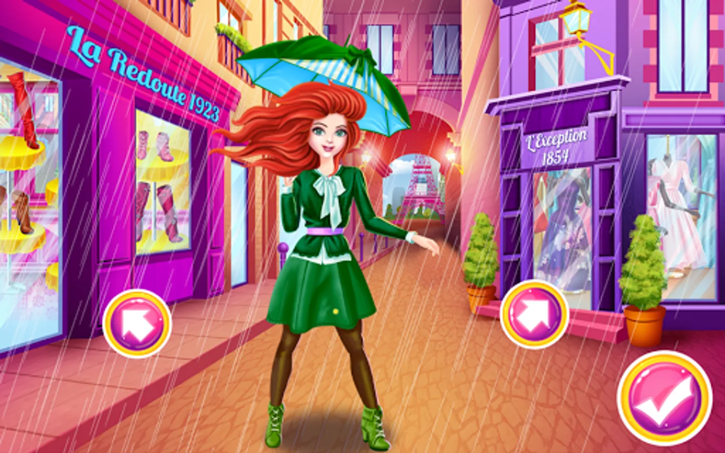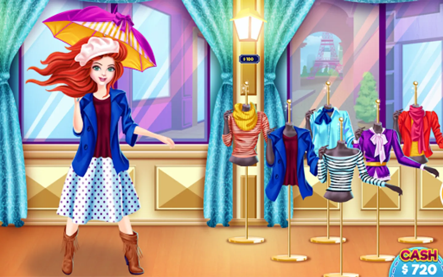 Choose the first girl you want and take a quick look to the clothes you have to try on. Either you’ll make a combination with a skirt and a lovely top or a pair of pants to it or even a dress make sure you are according to the Parisian look and try to get something you like too. Add some pretty accessories to it, maybe a bonnet, a beret or a hat will confer personality to the outfit you’ve just chosen. Get a pair of cute shoes and most of all don’t forget about the umbrella because without it not only that the look won’t be complete, but it’ll be ruined by the rain. Pick an umbrella that would match the colors of the design you’ve made for the girls. Try to upgrade your skills and remember to have fun after all it is a fascinating game.