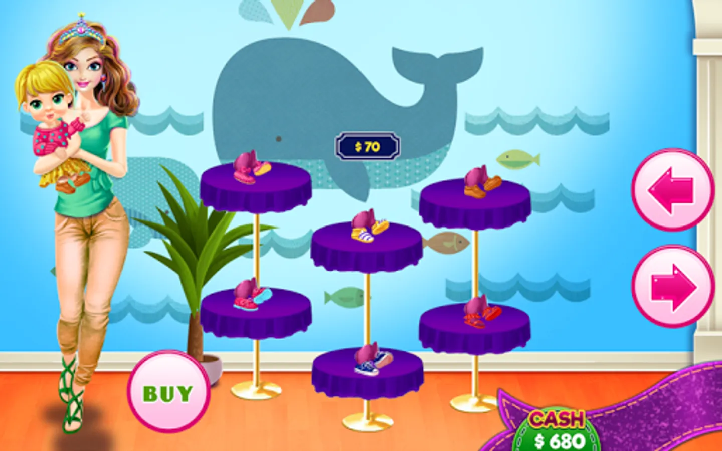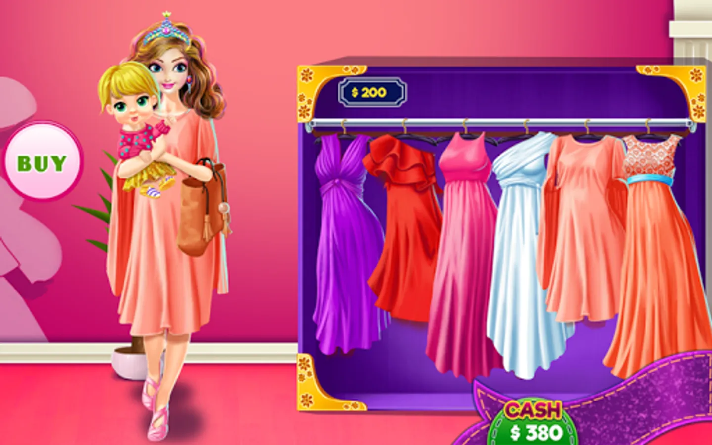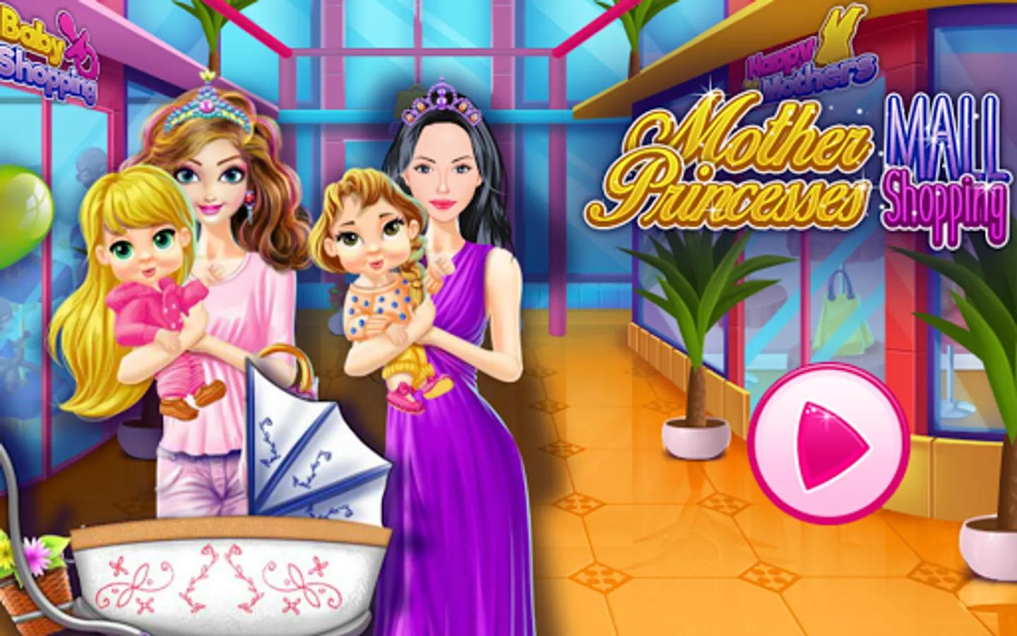 Motherhood is not as easy as it seems and after a long time of working hard and taking care of her children these two princesses moms need a shopping break immediately. In this dress up game you are here as a personal shopping assistance for them and you have to put your designer skills to work to give the best fashion advice you'll ever can. Stay in the budget and buy new clothing for moms and also for the cute babies they have. If you want to play you have to start with choosing the princess you want to shop first, but try to get to all stores at once so you can select the best outfit that will suit both, the mummy and the child.