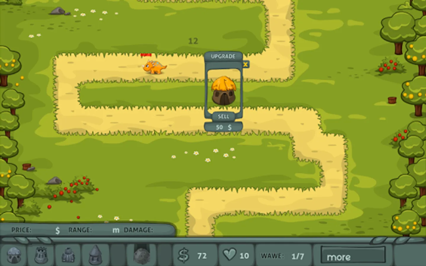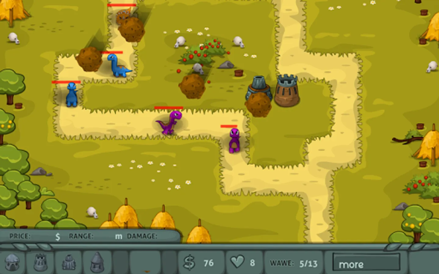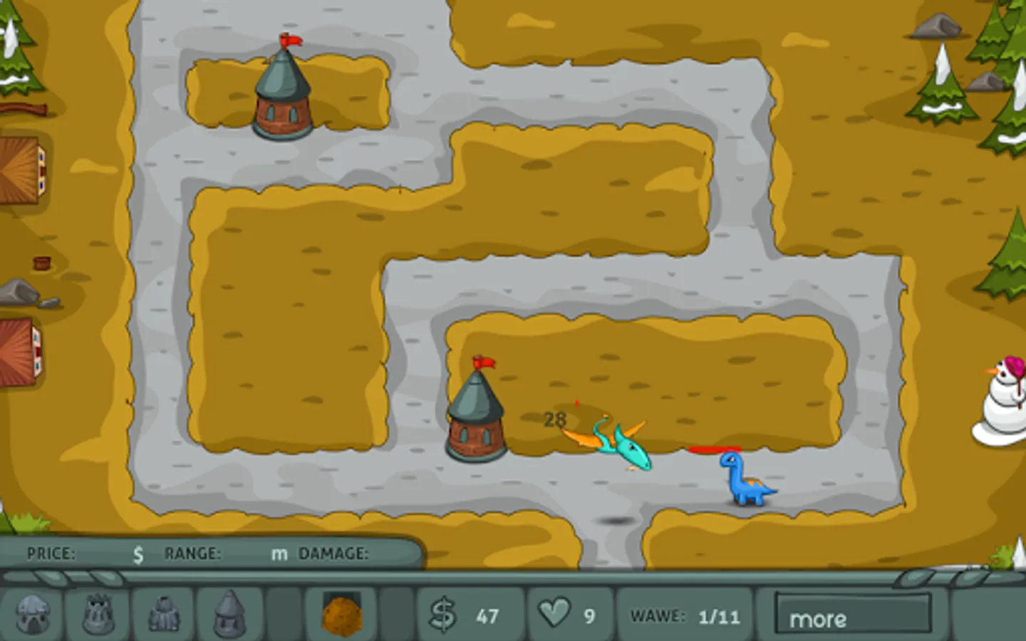 You have to prepare yourself for a mythic adventure in the past where prehistoric creatures we’re still alive and walking next to us and because this tower defense game is about to challenge your inner strategist to create an infallible fortress you have to be ready to face the struggle. Stone Age tower defense is a classical strategy game which imply having your mind and thinking a little bit different so you can handle each kind of situations you are put into. Start with choosing the type of tower that you think might help you in this battle with dinosaurs and try to find a specific way to place each kind of tower. Focus to destroy as many creatures possible and touch the cranium spot as fast you can because if you do it your budget will raise and you’ll be able to buy more tower or even better to upgrade the one you have in custody.