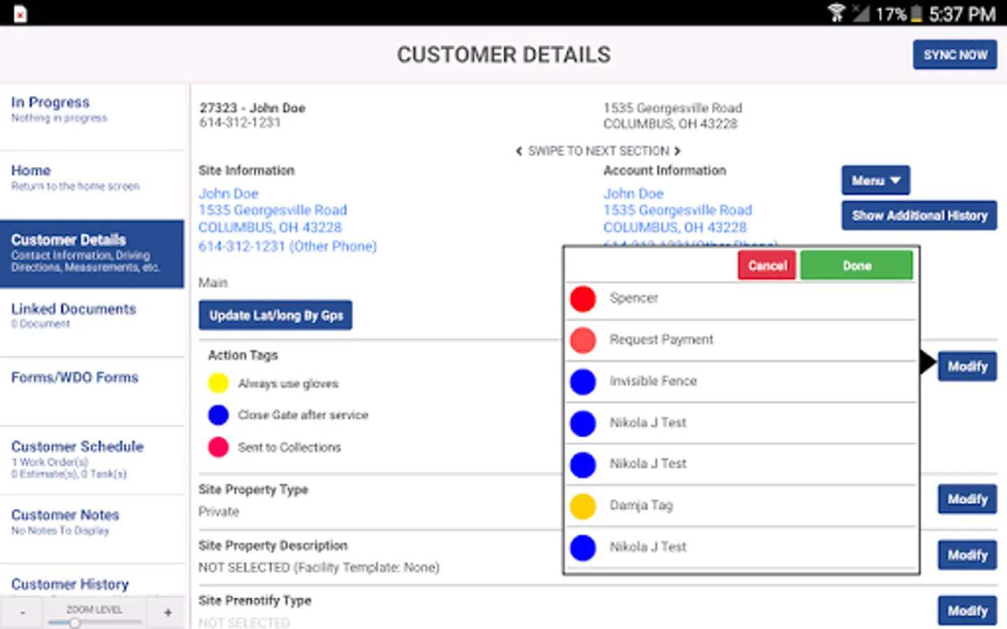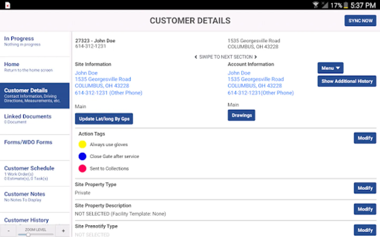 Other features include updating customer contact information, entering notes, collecting payments, and reviewing recent customer history.