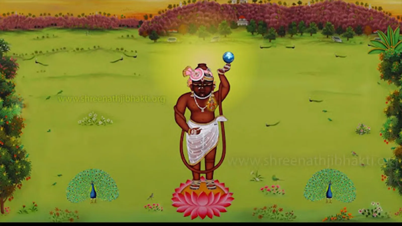 Shrinathji is a form of Hindu god Krishna. The principal shrine of Shrinathji is situated at the temple town of Nathdwara, located 48 Kilometers North-east of Udaipur city in Rajasthan. Shrinathji is the central presiding deity of the Vaishnava sect known as the Pushti Marg (The way of grace) or the Vallabh Sampradaya or Shuddhadvaita, established by Shri Vallabhacharya. Shrinathji is worshipped mainly by the followers of Bhakti Yoga and the Vaishnava in Gujarat and Rajasthan among others. Vitthal Nathji, son of Vallabhacharya institutionalised the worship of Shrinathji at Nathdwara. On account of the popularity of Shrinathji, Nathdwara town itself is referred to as ‘Shrinathji’.
