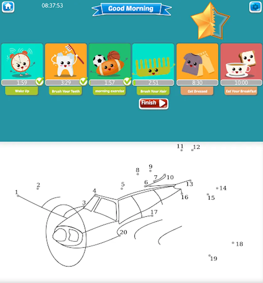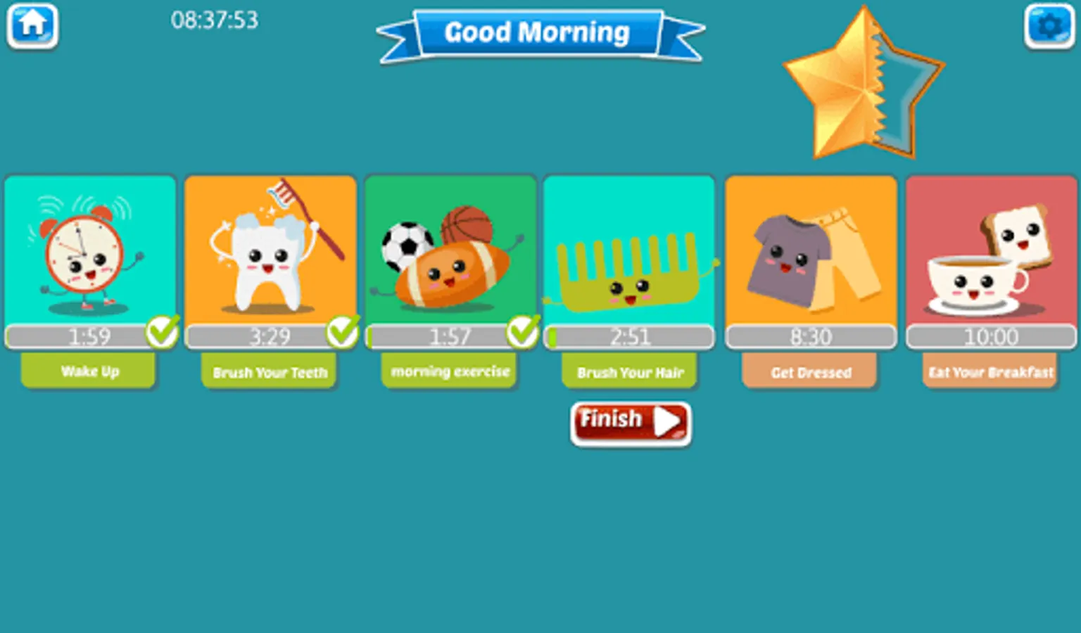 • getting ready in the morning with timer and happy songs for every action- brushing teeth, get dressed, morning exercise.