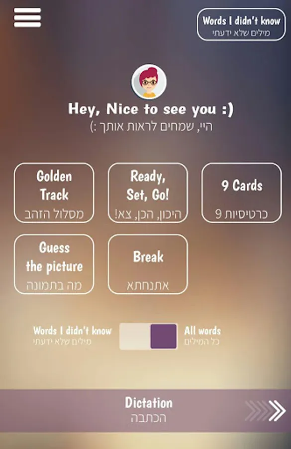 לימוד אוצר המילים באנגלית דרך אלגוריתם ייחודי שלומד את השחקן ומתאים את קושי המילים עבורו. התלמיד נהנה מהמשחק והאלגוריתם דואג כל הזמן להתעדכן ולהתאים עבורו מילים באנגלית שיהיו מאתגרות ומקדמות.
