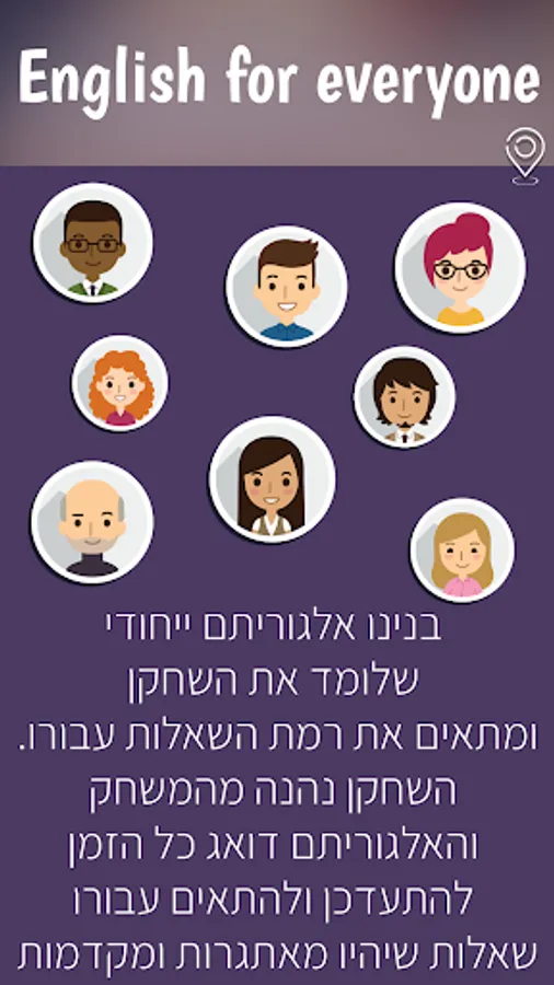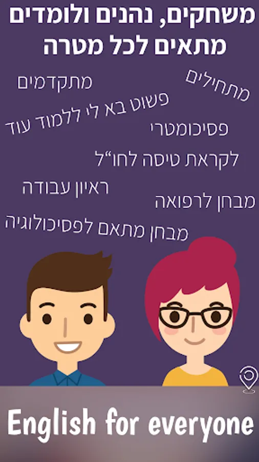 מטרת האפליקציה- לימוד אנגלית למתחילים ולמתקדמים כך שכל אחד לומד לפי הרמה שלו ומתקדם ככל שמשחק.